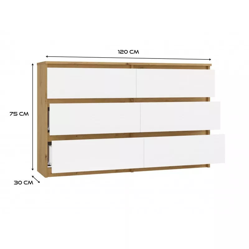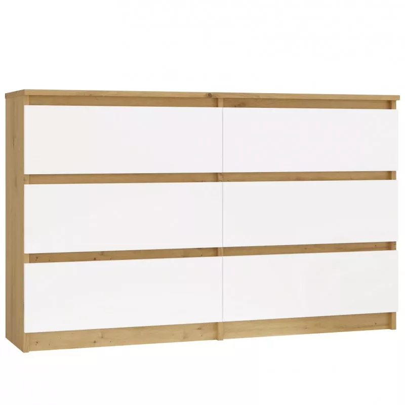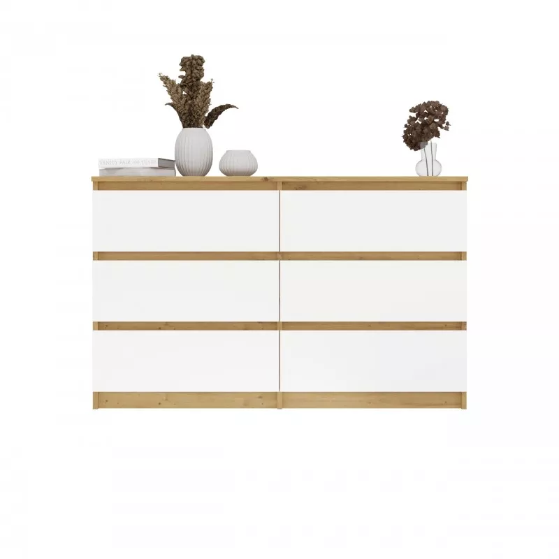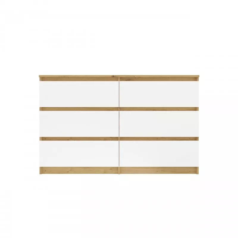 Široká zásuvková komoda TAAVI poskytuje dostatek úložného prostoru v podobě 6 prostorných zásuvek. Čela zásuvek nemají úchyty, což zajišťuje pohodlné používání a zdůrazňuje moderní charakter nábytku.