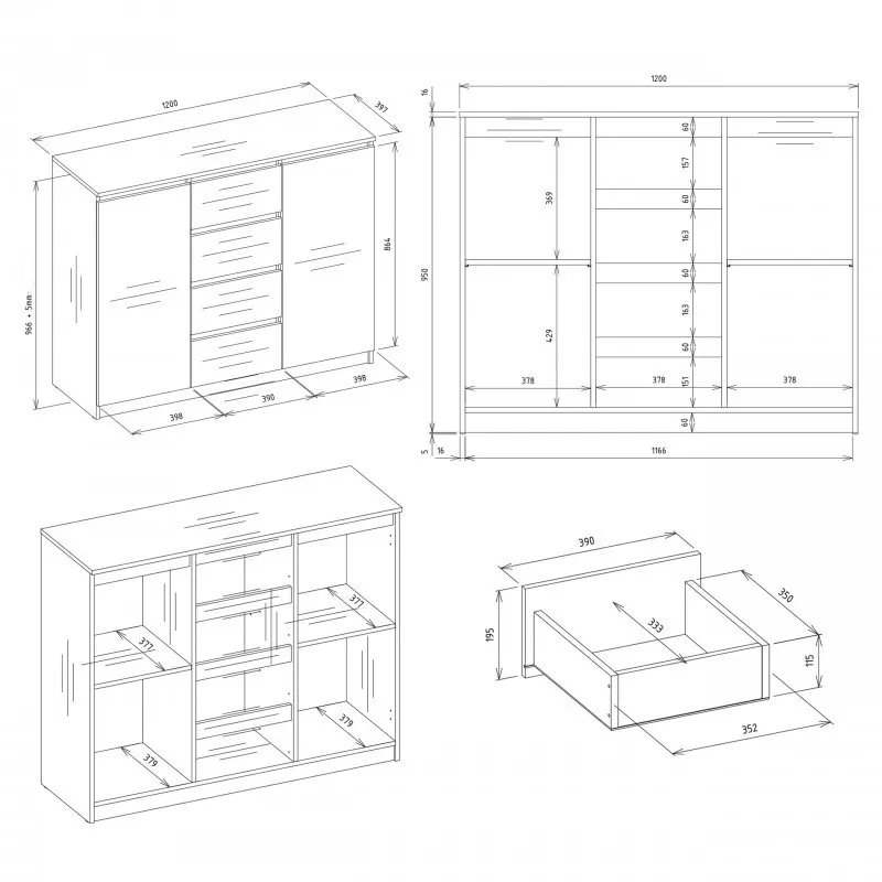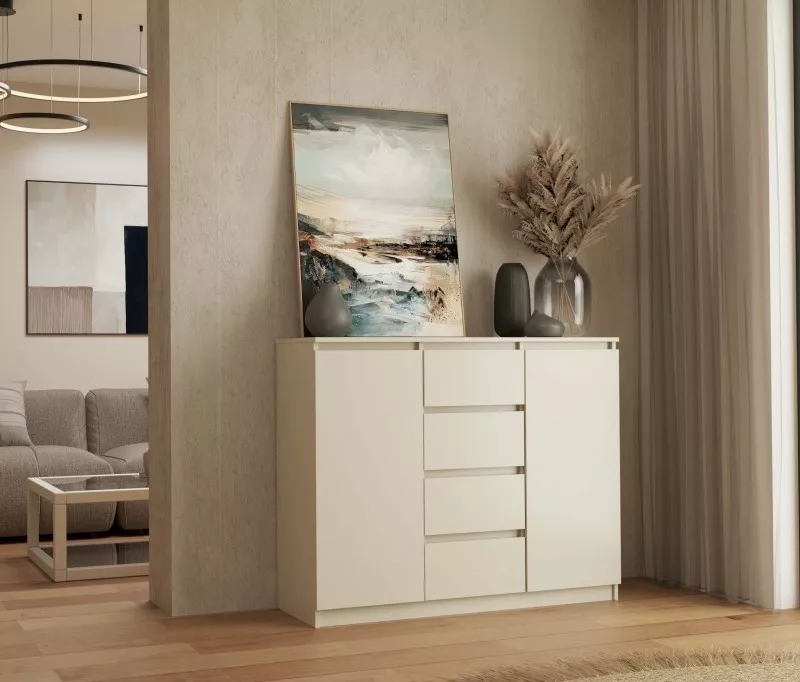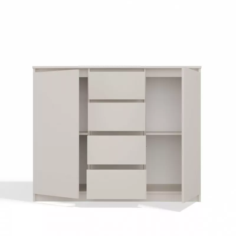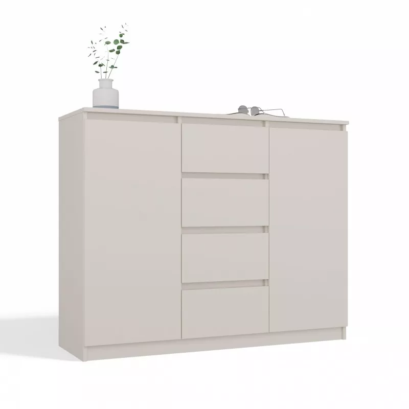 Kombinovaná široká komoda ELBE je funkční a prostorná komoda, která ozdobí interiér vaší ložnice či obývacího pokoje. Bezúchytková čela šuplíků a dvířek zajišťují pohodlné používání a zdůrazňují moderní charakter nábytku. Komoda disponuje 2 skříňkami a 4 šuplíky, které poskytují mnoho úložného prostoru.
