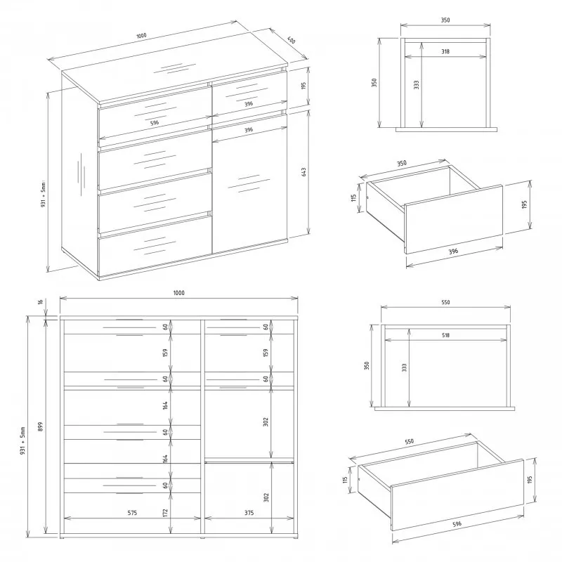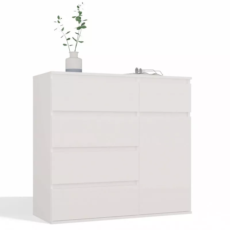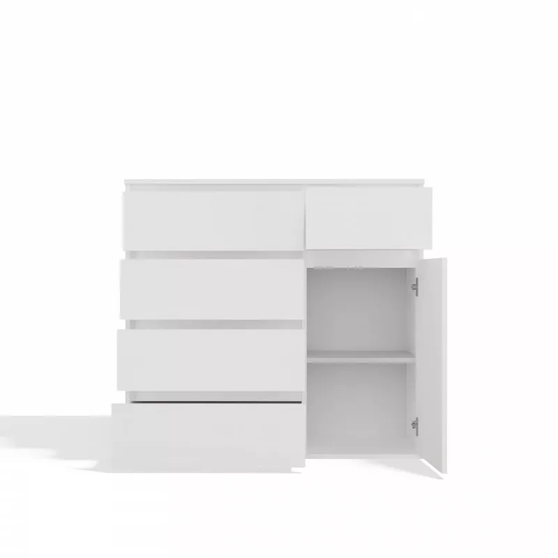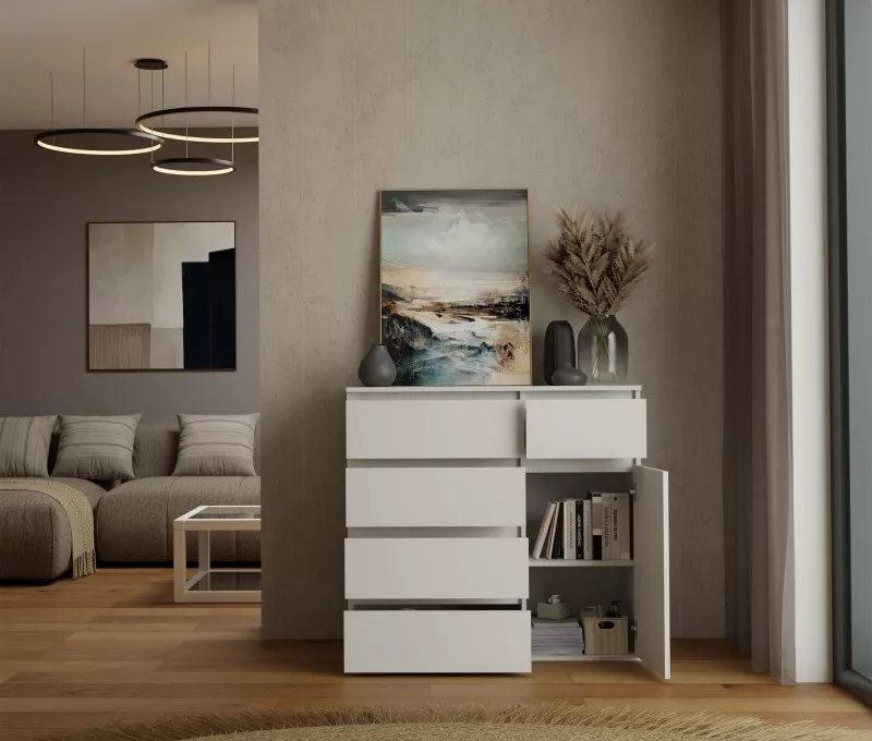 Komoda se šuplíky ELBE je funkční a prostorná komoda, která ozdobí interiér vaší ložnice či obývacího pokoje. Bezúchytková čela šuplíků a dvířek zajišťují pohodlné používání a zdůrazňují moderní charakter nábytku. Komoda disponuje skříňkou s policí a 5 šuplíky, které poskytují mnoho úložného prostoru.