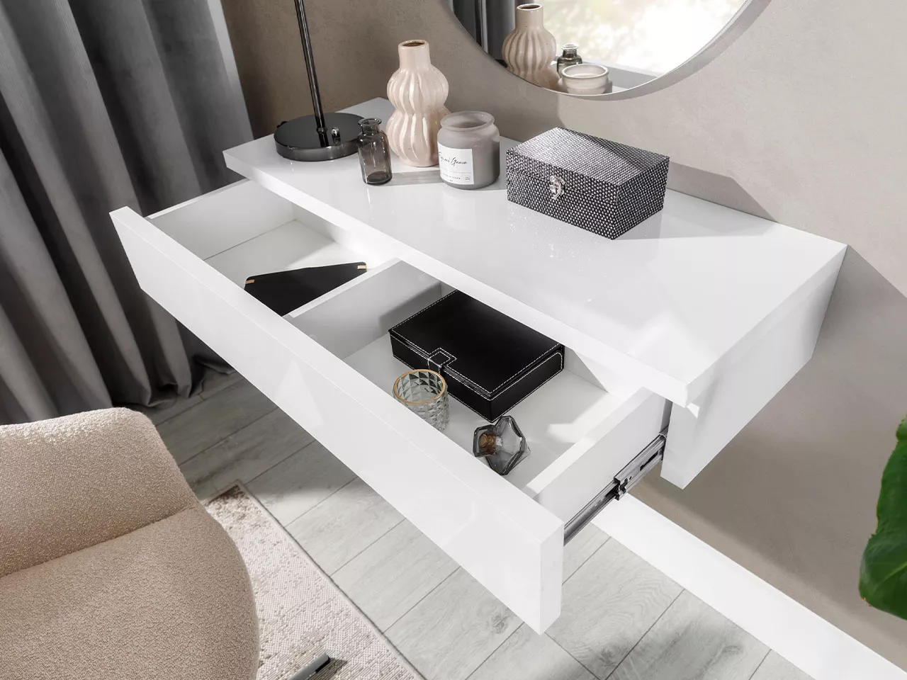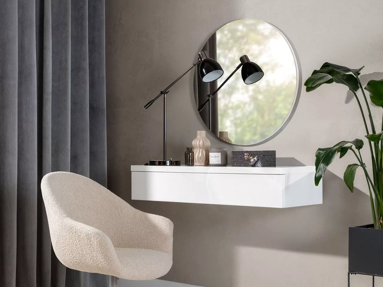 Toaletka SANCO poskytne ideální podmínky pro úpravu dokonalého účesu nebo nanášení make-upu. Šikovné příslušenství můžete uložit do prostorných zásuvek. Toaletní stolek je dodáván s nástěnným kulatým zrcadlem.