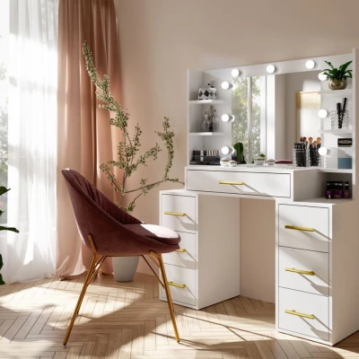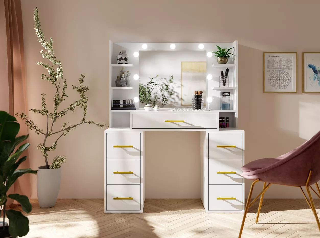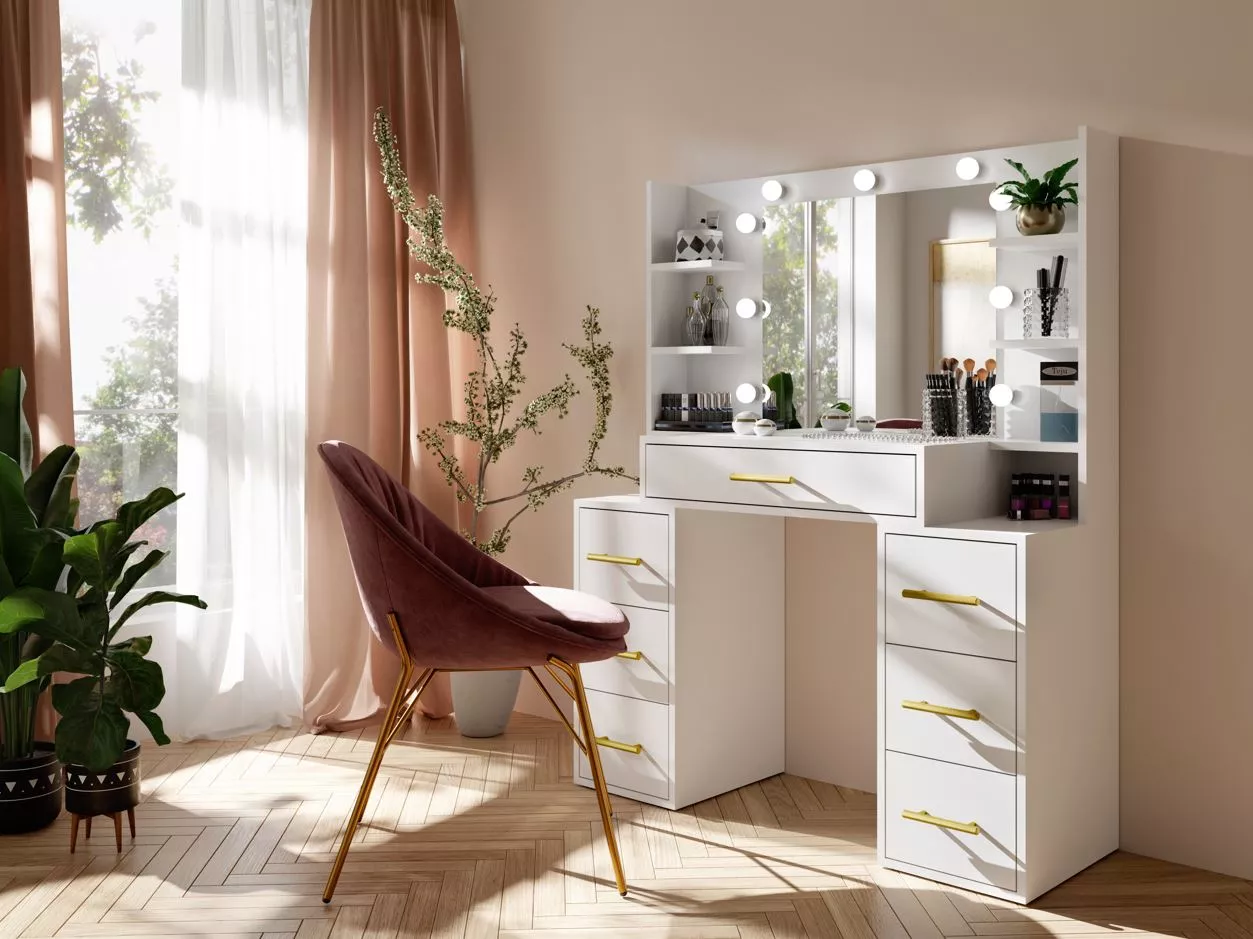 Dopřejte si luxusní prostor pro líčení s toaletním stolkem BERTHA. Prostorné zásuvky a police zajistí dokonalou organizaci kosmetiky, šperků i doplňků, zatímco velké zrcadlo s LED osvětlením umožní precizní aplikaci make-upu. Kvalitní zpracování a pevná konstrukce zaručují dlouhou životnost, takže se stane vaším každodenním společníkem ve světě krásy.