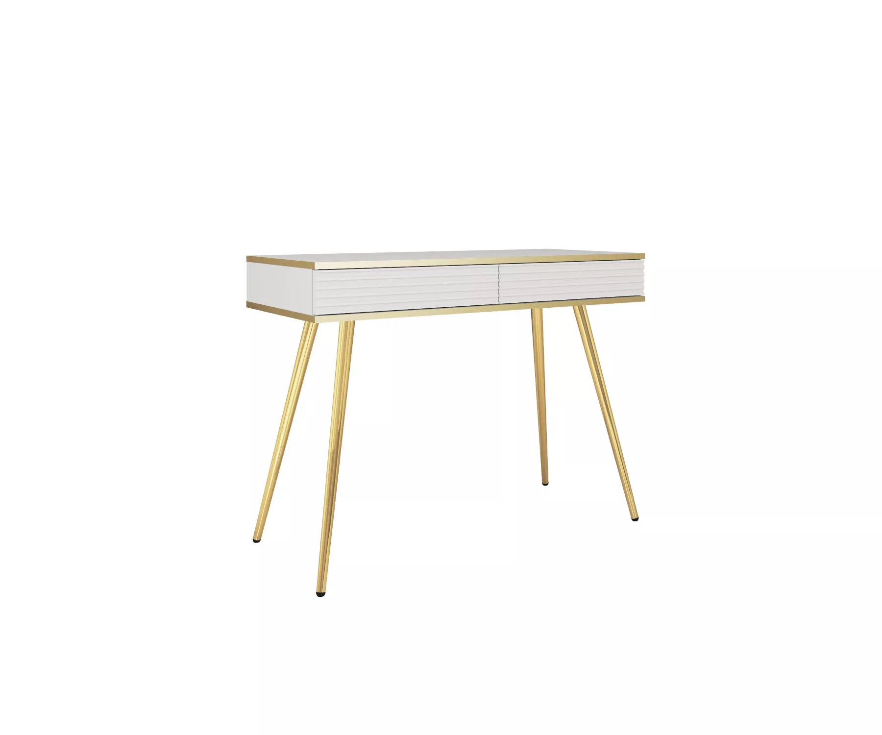 Konzolový stolek JENY 2 zaujme svými drážkovanými čely šuplíků a zlatými detaily. Dokonale zapadne do každé ložnice, obývacího pokoje nebo předsíně. Vysoké kovové nožky dodávají stolku lehkost a eleganci.