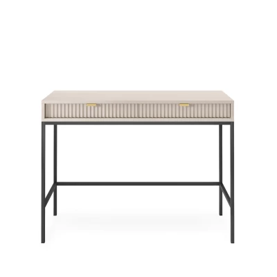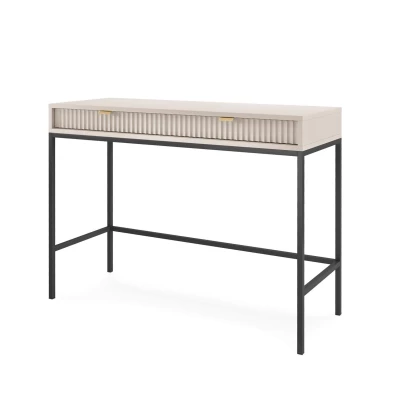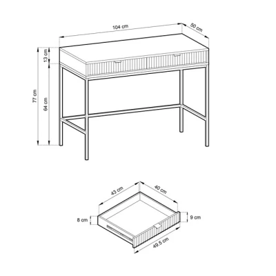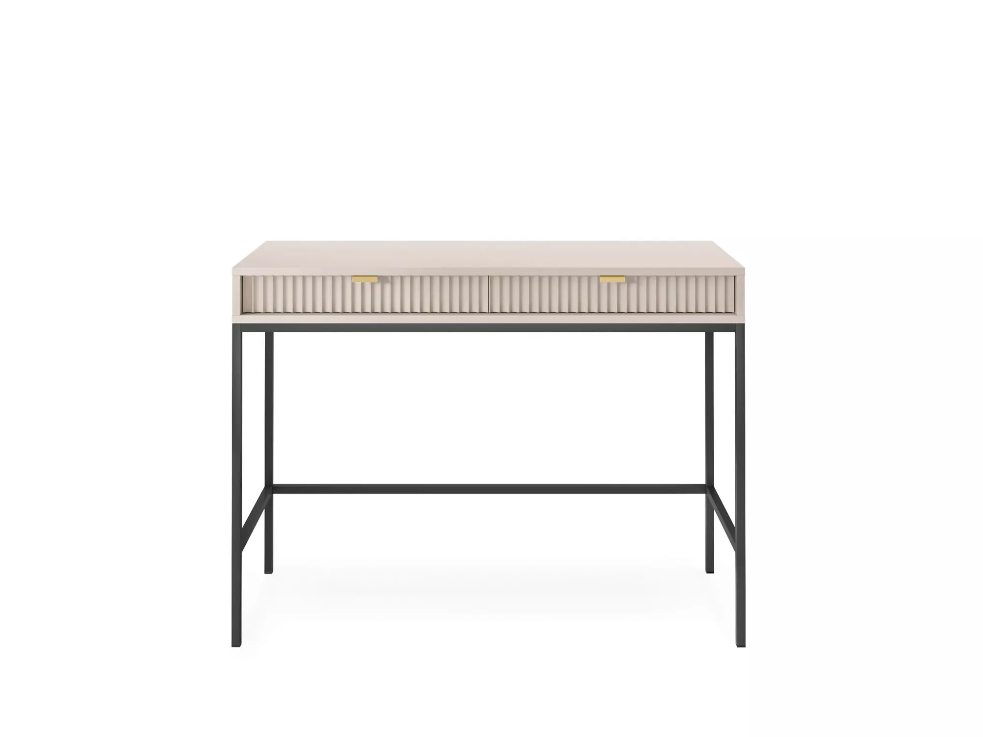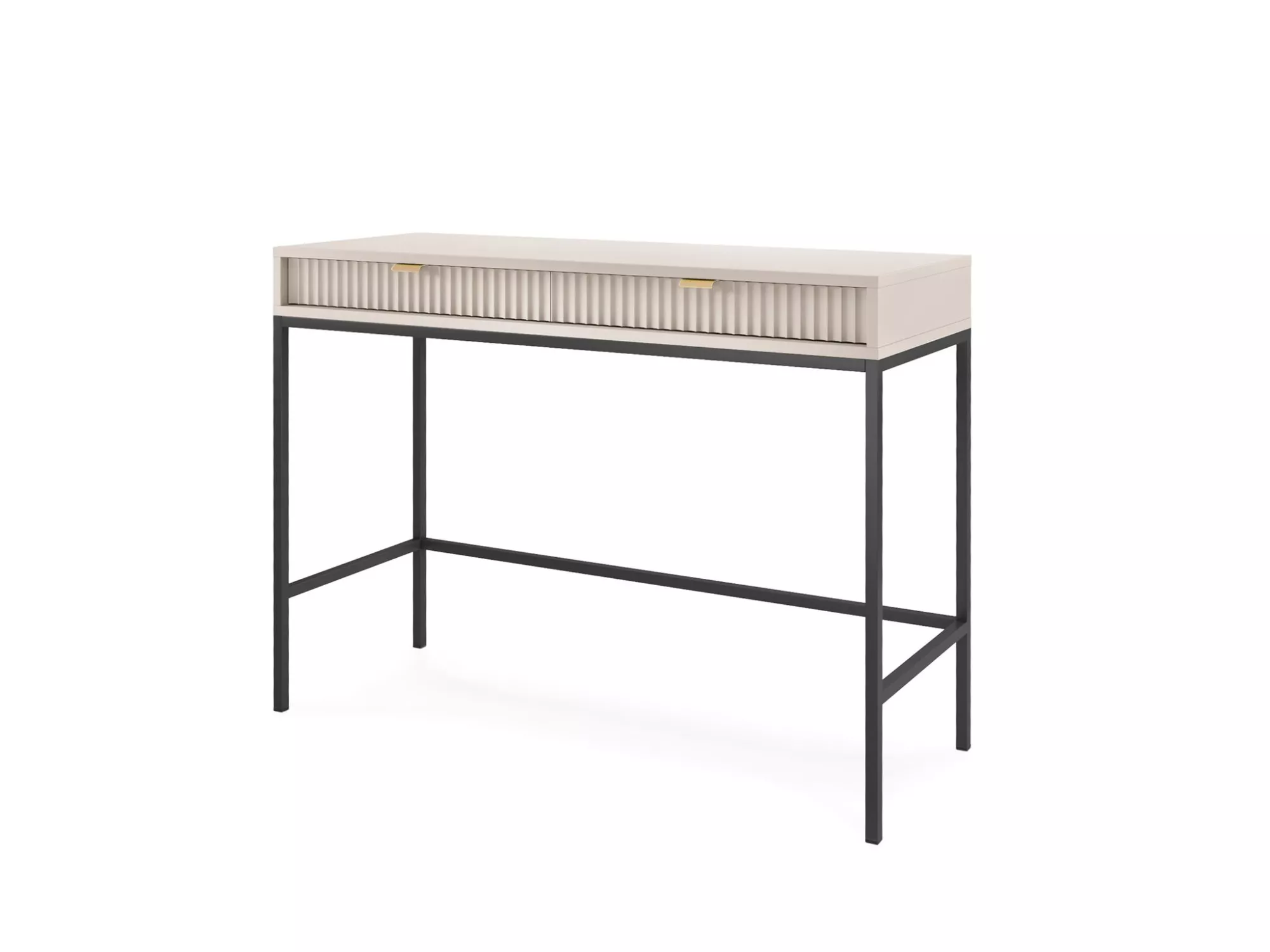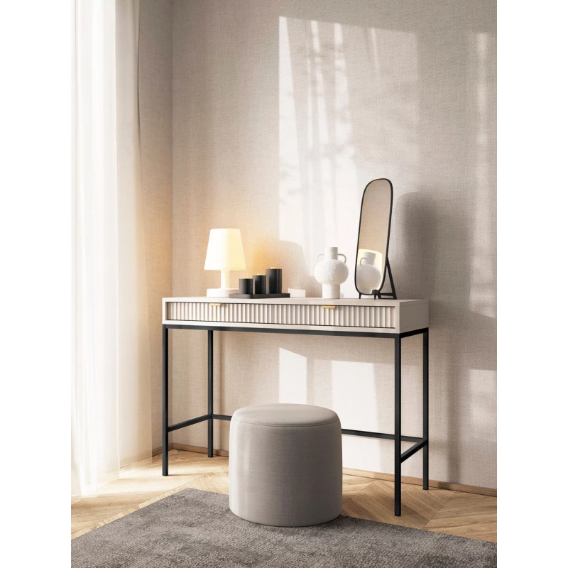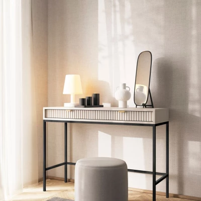 Toaletní stolek MISHEEL je charakteristický svým originálním designem v podobě drážkovaných předních částí šuplíků. Disponuje 2 šuplíky, kde můžete vložit potřebné kosmetické věci. Kovová podstava dodává stolku pevnost a stabilitu.