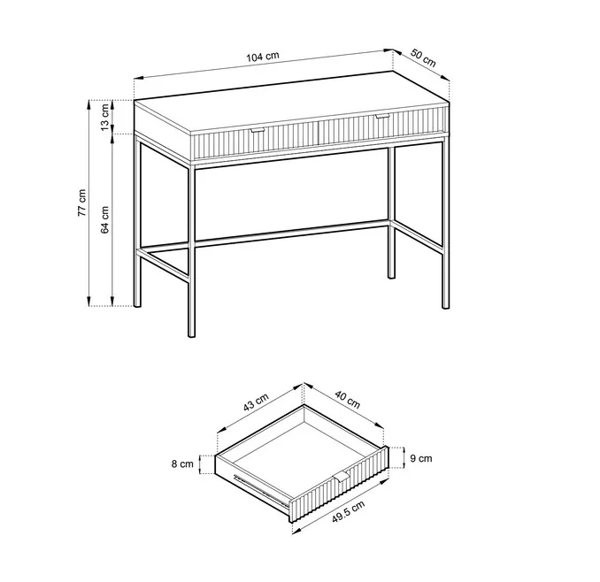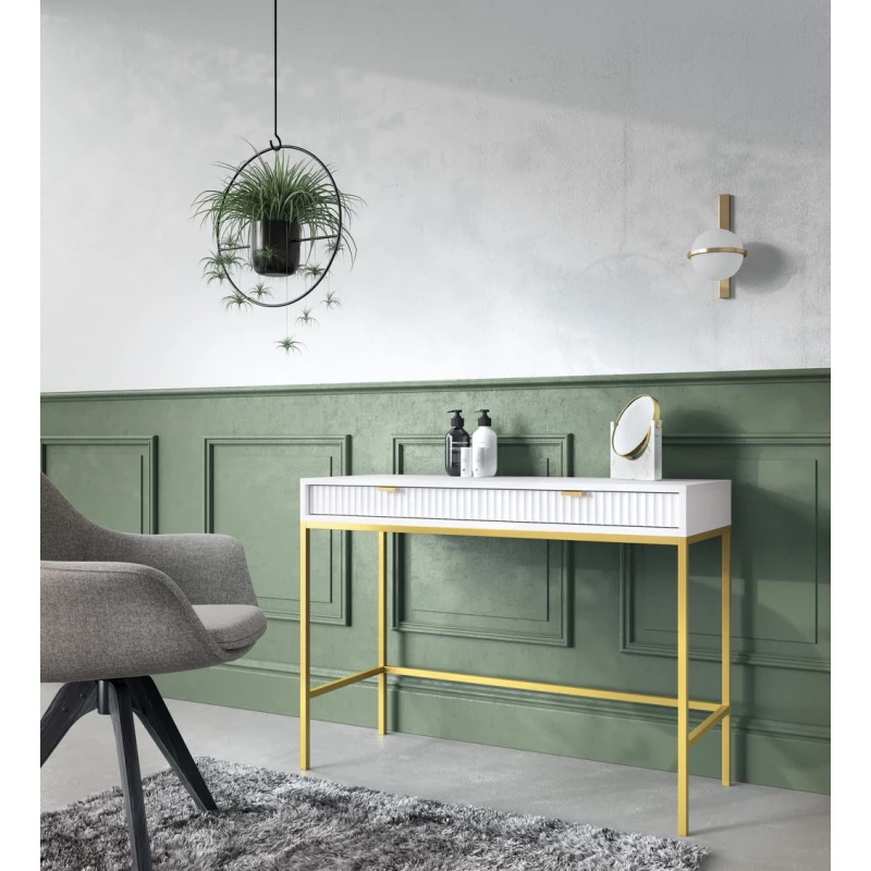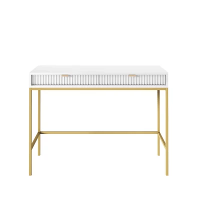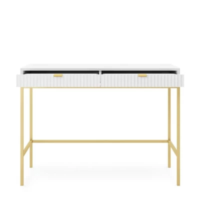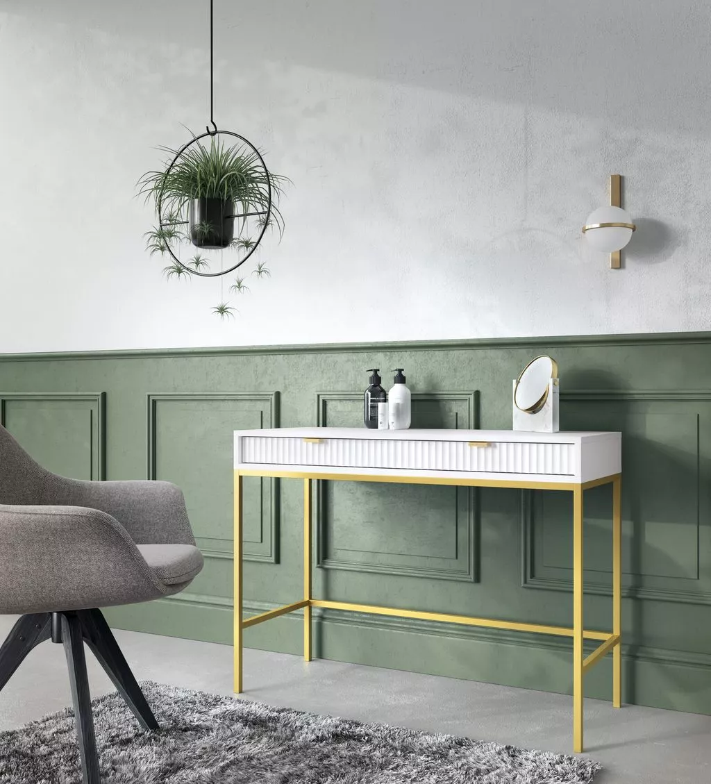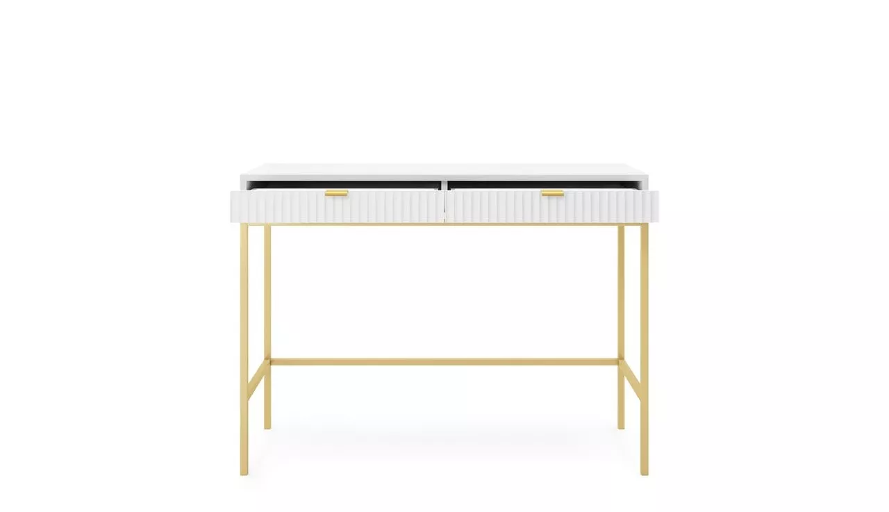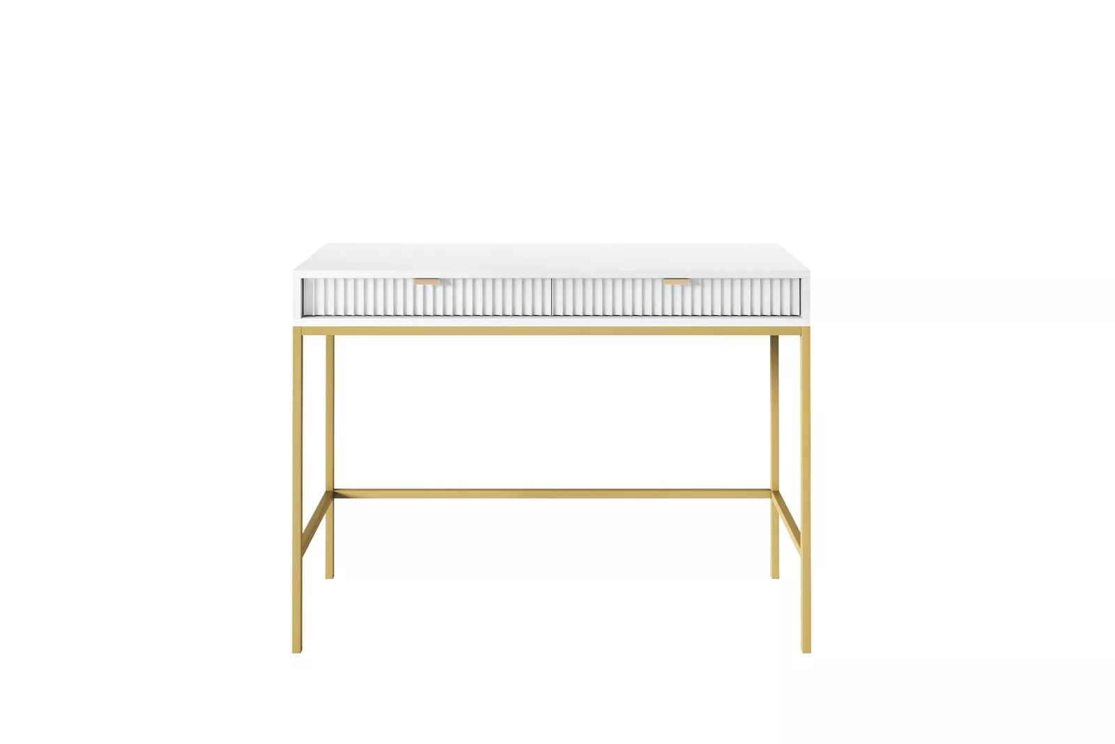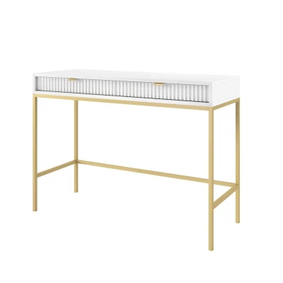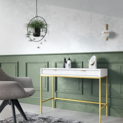 Toaletní stolek MISHEEL je charakteristický svým originálním designem v podobě drážkovaných předních částí šuplíků. Disponuje 2 šuplíky, kde můžete vložit potřebné kosmetické věci. Kovová podstava dodává stolku pevnost a stabilitu.