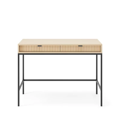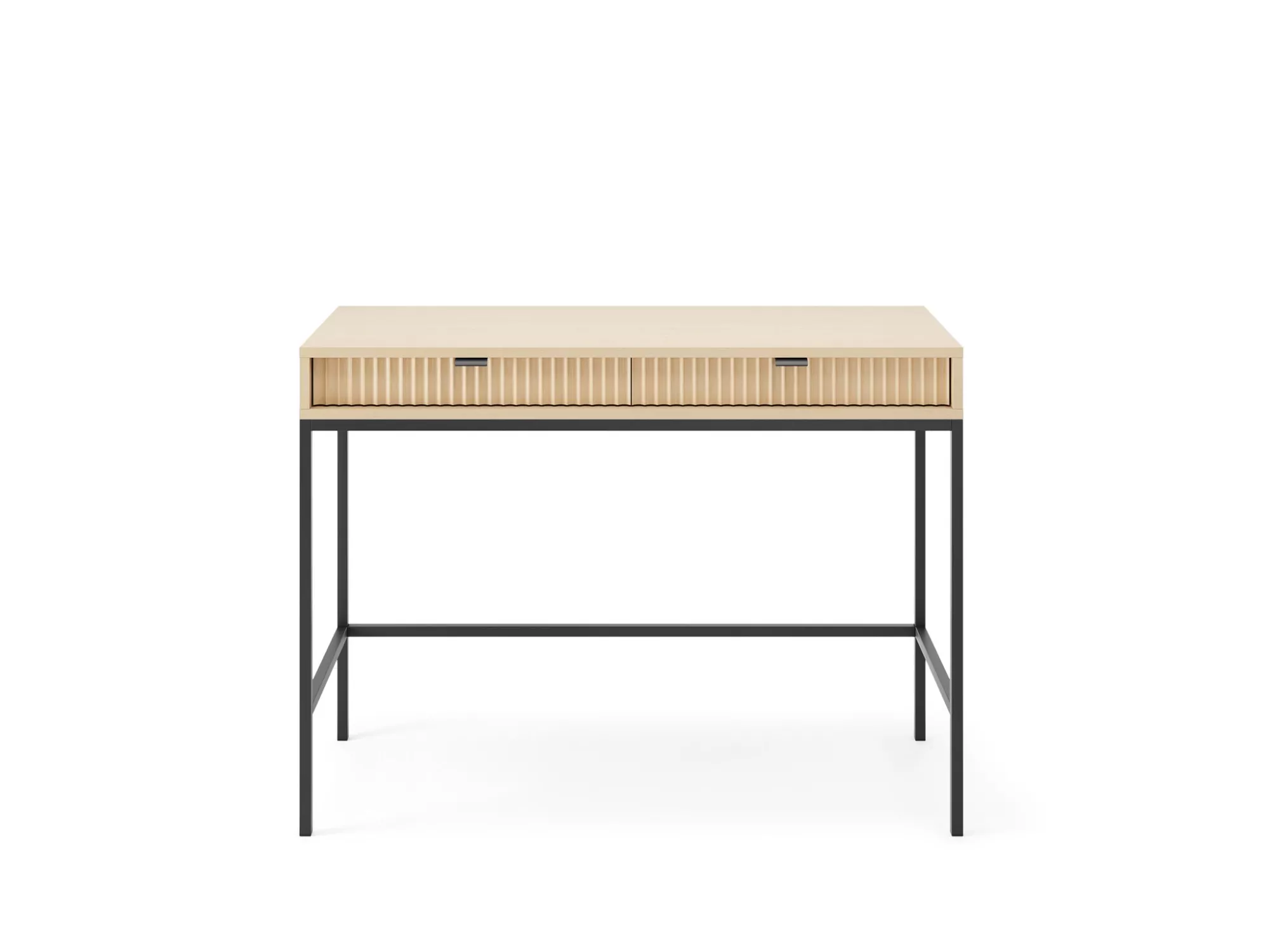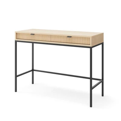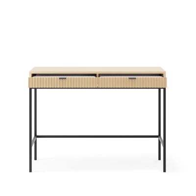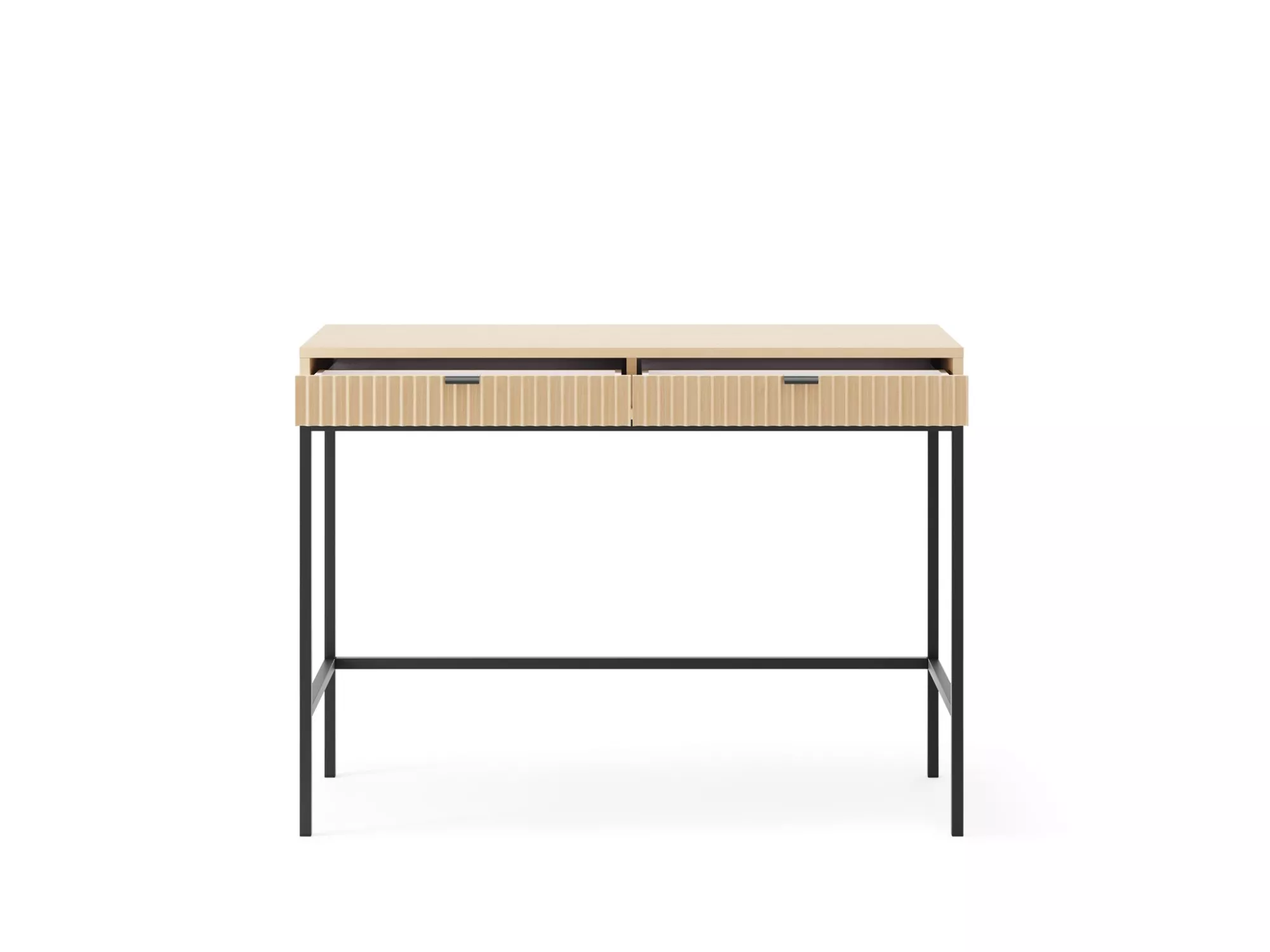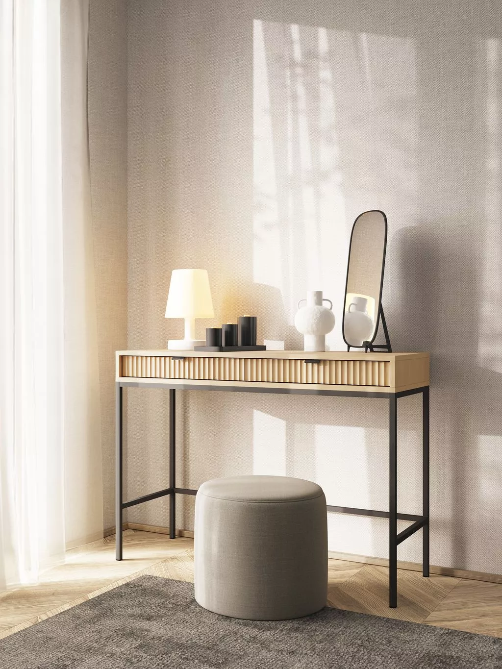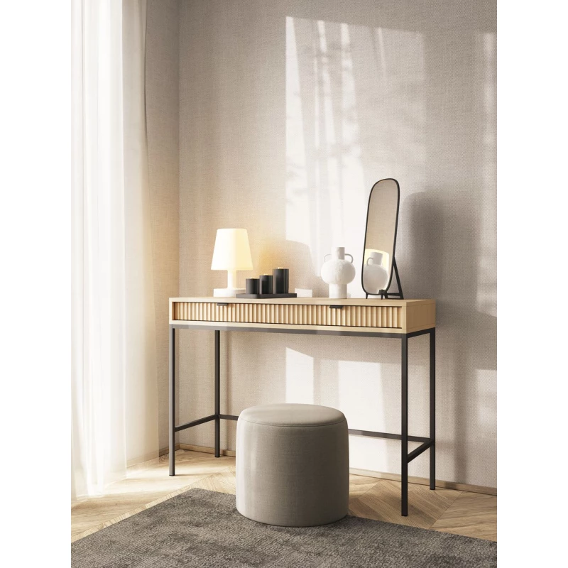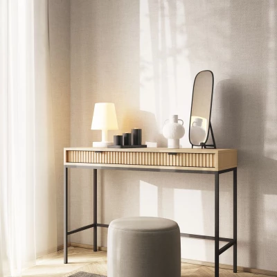 Toaletní stolek MISHEEL je charakteristický svým originálním designem v podobě drážkovaných předních částí šuplíků. Disponuje 2 šuplíky, kde můžete vložit potřebné kosmetické věci. Kovová podstava dodává stolku pevnost a stabilitu.