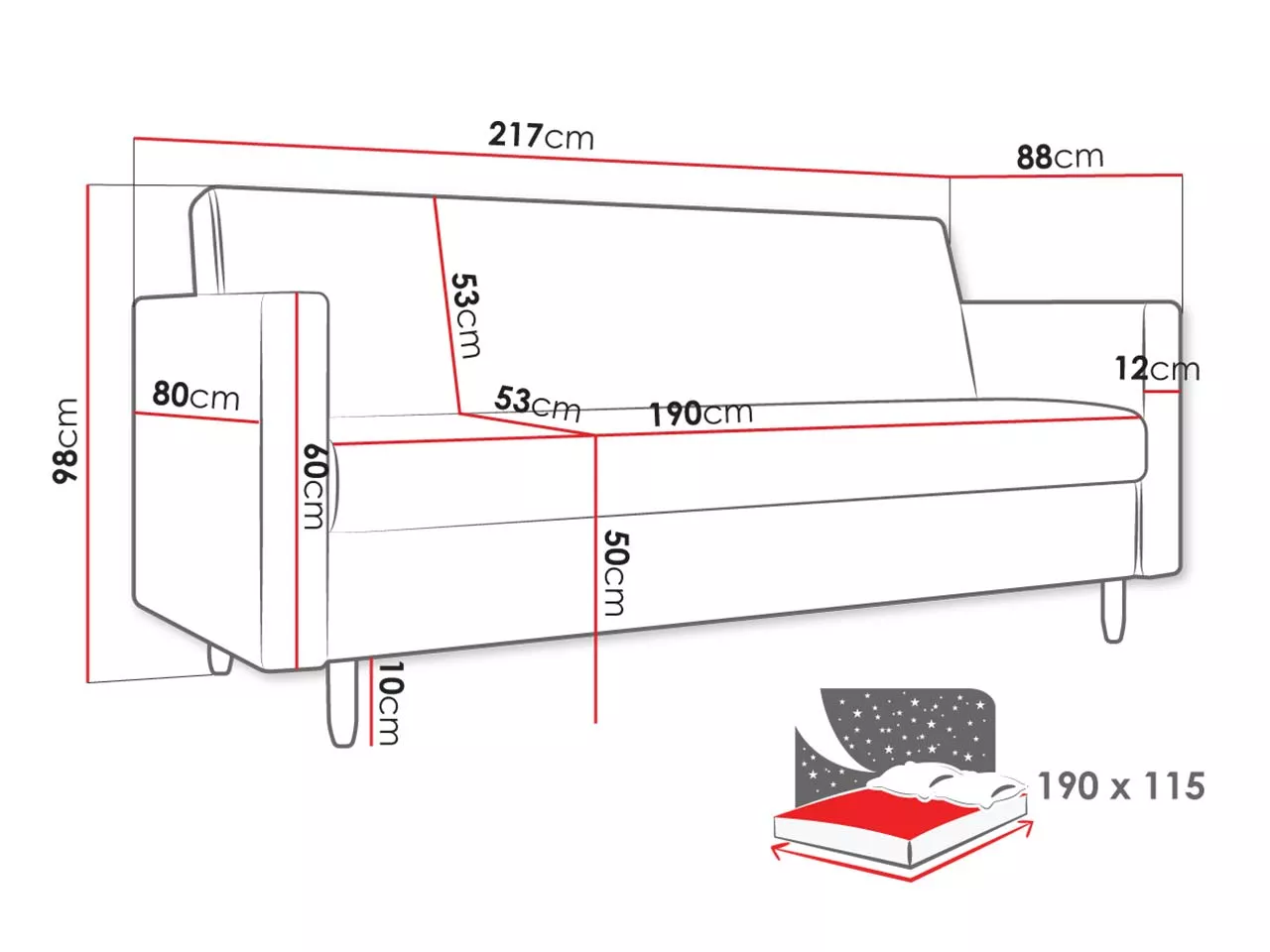 Dopřejte si maximální komfort s elegantní pohovkou BAZYLI. Díky svému minimalistickému tvaru je ideální volbou pro moderní interiéry. Největší předností pohovky je možnost snadného rozložení na spací lůžko o rozměrech 115x190 cm. Praktický úložný prostor na lůžkoviny navíc pomáhá udržet místnost vždy uklizenou a organizovanou.
