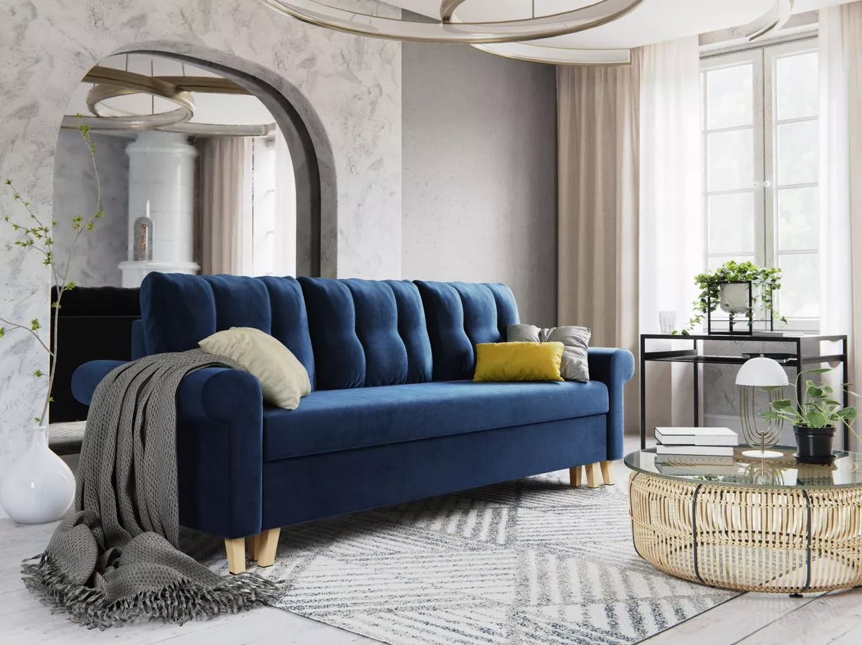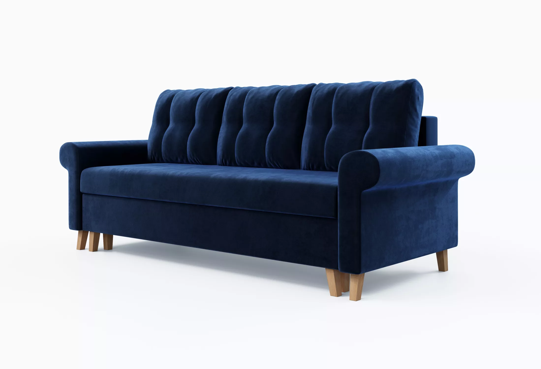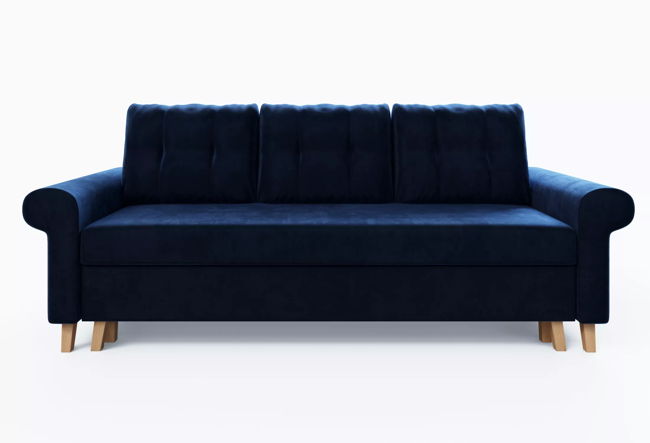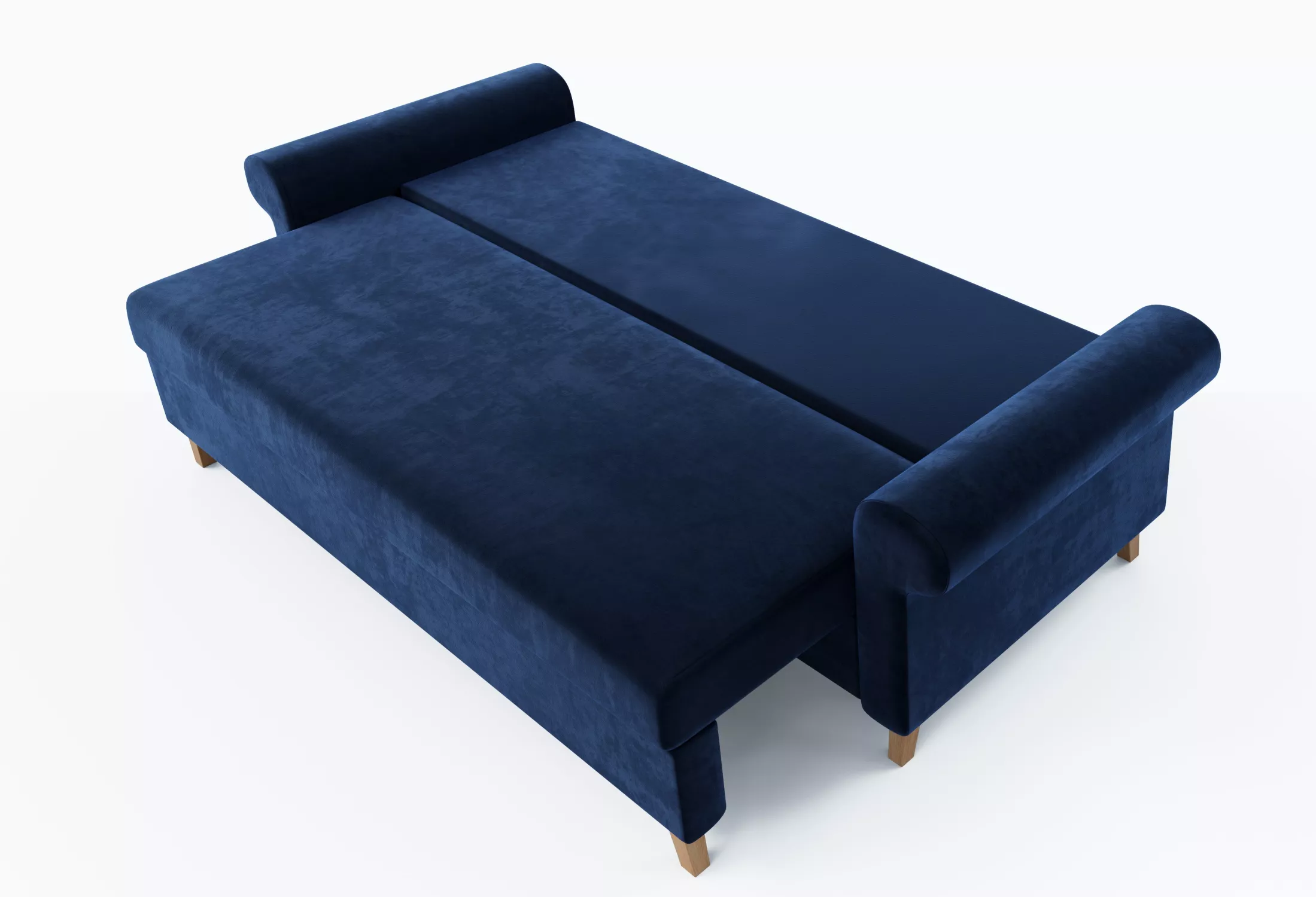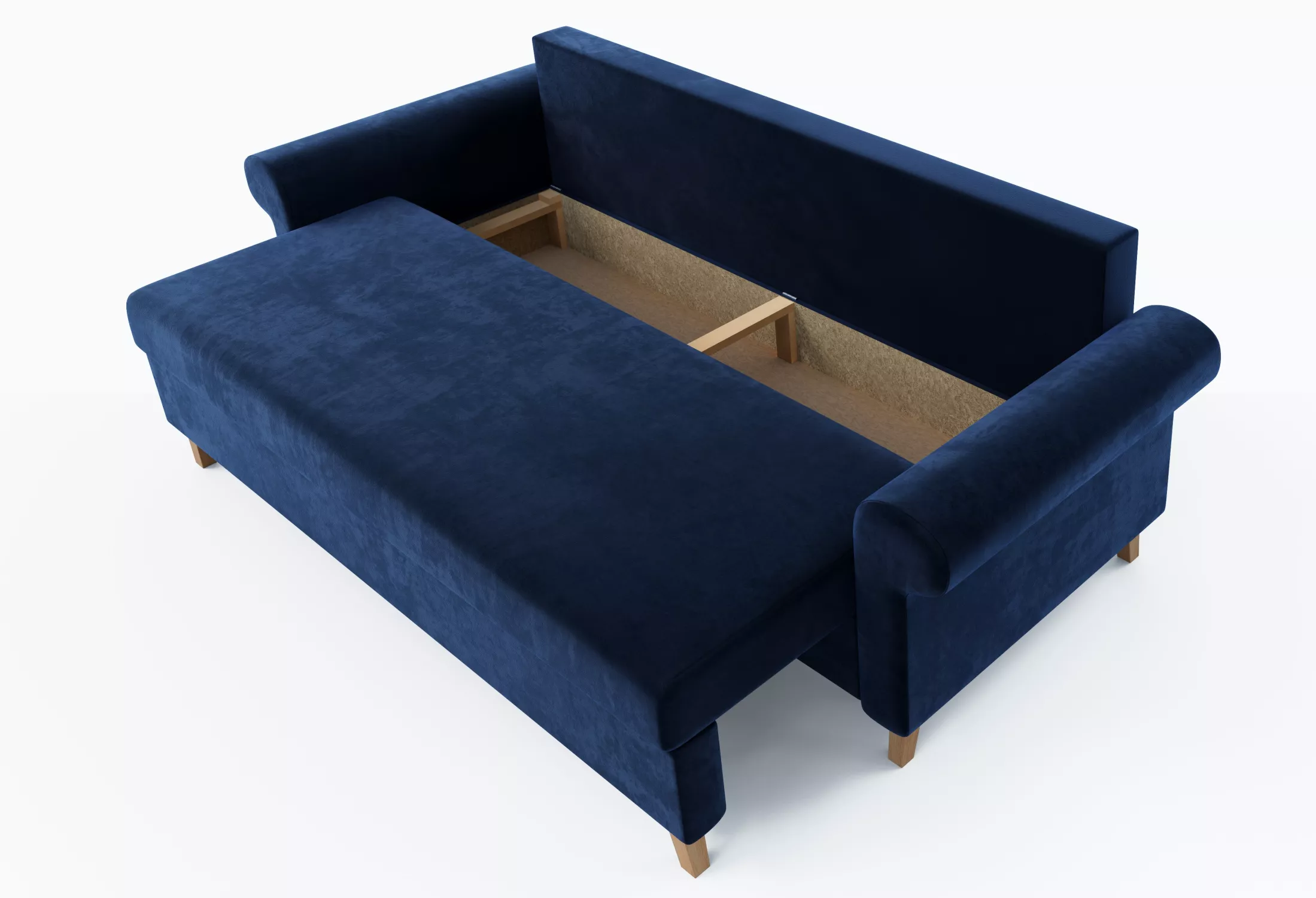 Pohovka NAFETA spojuje noblesu glamour stylu s lehkostí skandinávského designu. Díky rozkládací funkci se snadno promění v pohodlné lůžko o velikosti 130×194 cm, ideální pro hosty i lenošení. 3 velké opěrné polštáře a vysoké masivní nožky dodávají celé pohovce vzdušnost a charakter. Nechybí ani praktický úložný prostor, kam schováte deky, polštáře nebo cokoli, co chcete mít po ruce.