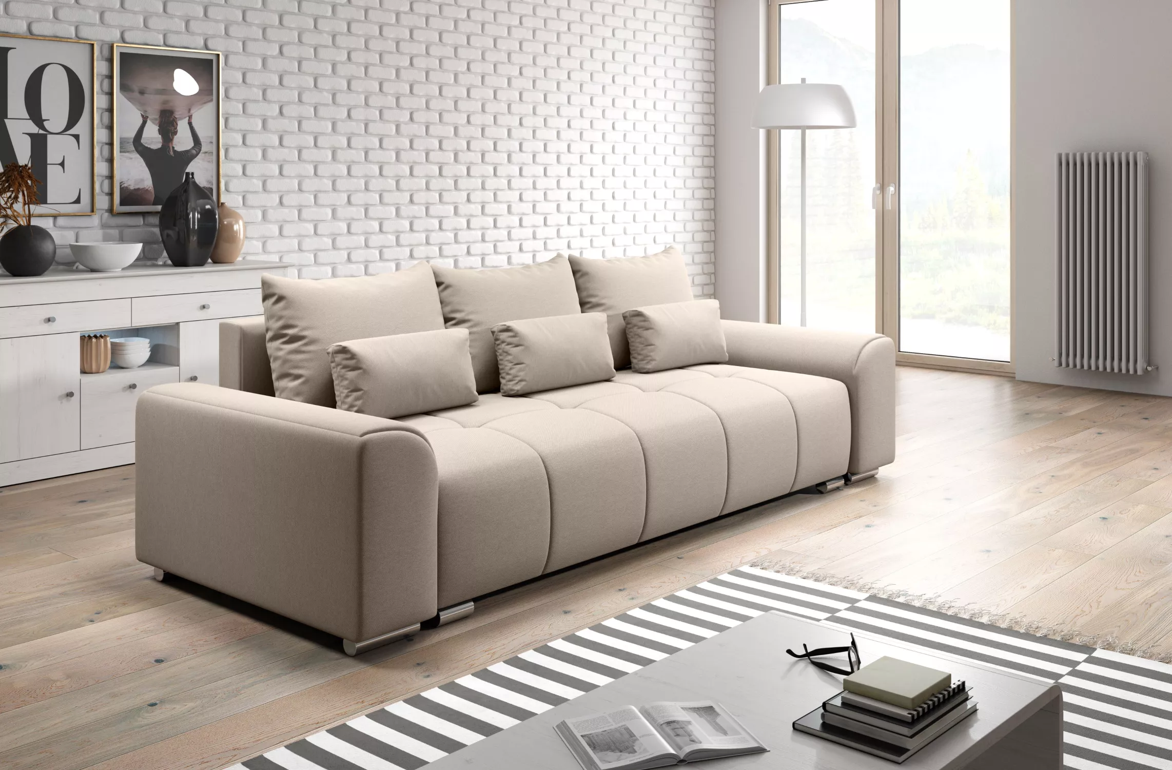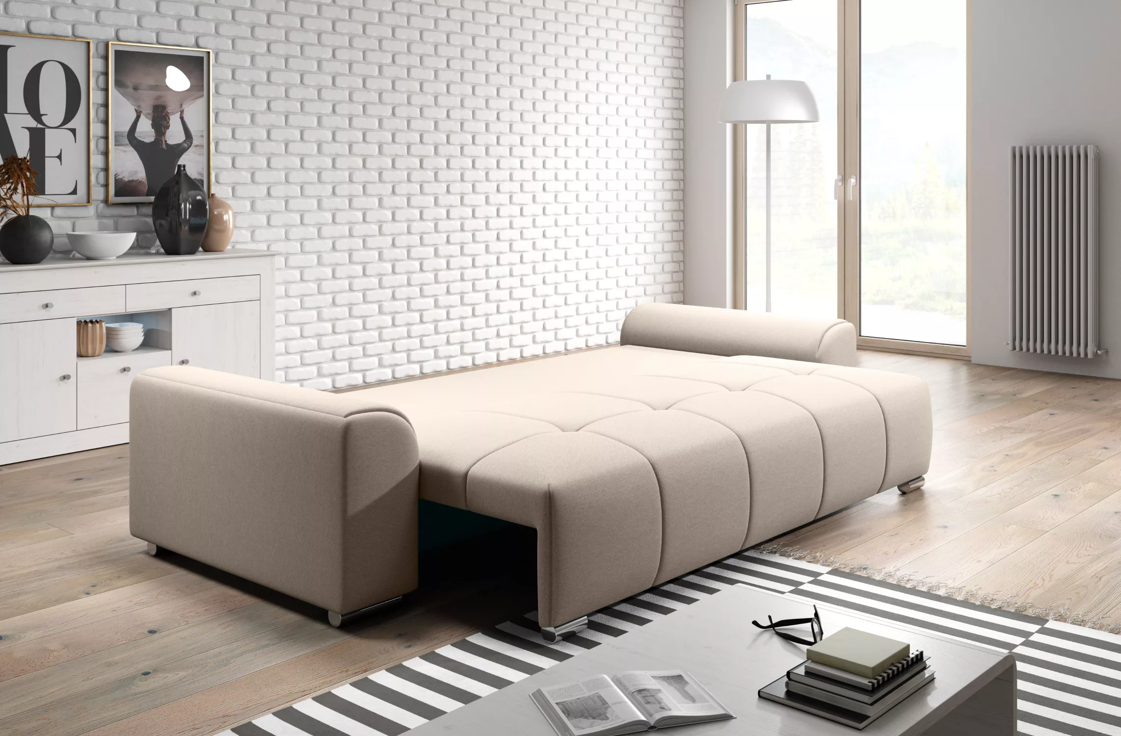 Trojmístná rozkládací pohovka RANDA svým designem zapadne do všech moderních obývacích pokojů. Opěradlo ve formě volně ložených polštářů vám zpříjemní každodenní používání. Zadní část pohovky je čalouněná látkou, což umožňuje její umístění kdekoliv v místnosti.