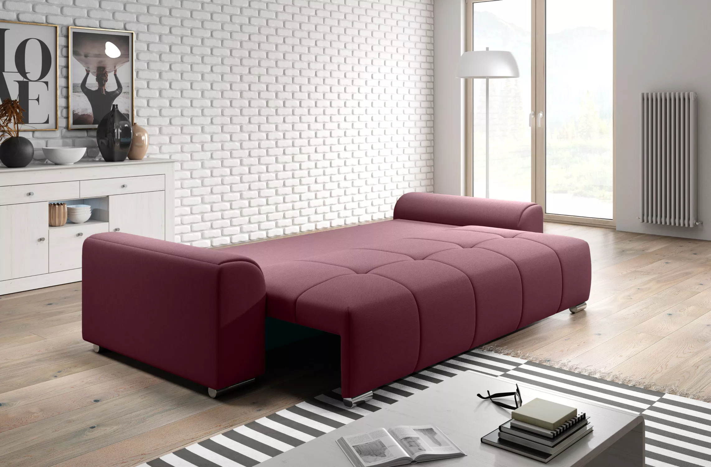 Trojmístná rozkládací pohovka RANDA svým designem zapadne do všech moderních obývacích pokojů. Opěradlo ve formě volně ložených polštářů vám zpříjemní každodenní používání. Zadní část pohovky je čalouněná látkou, což umožňuje její umístění kdekoliv v místnosti.