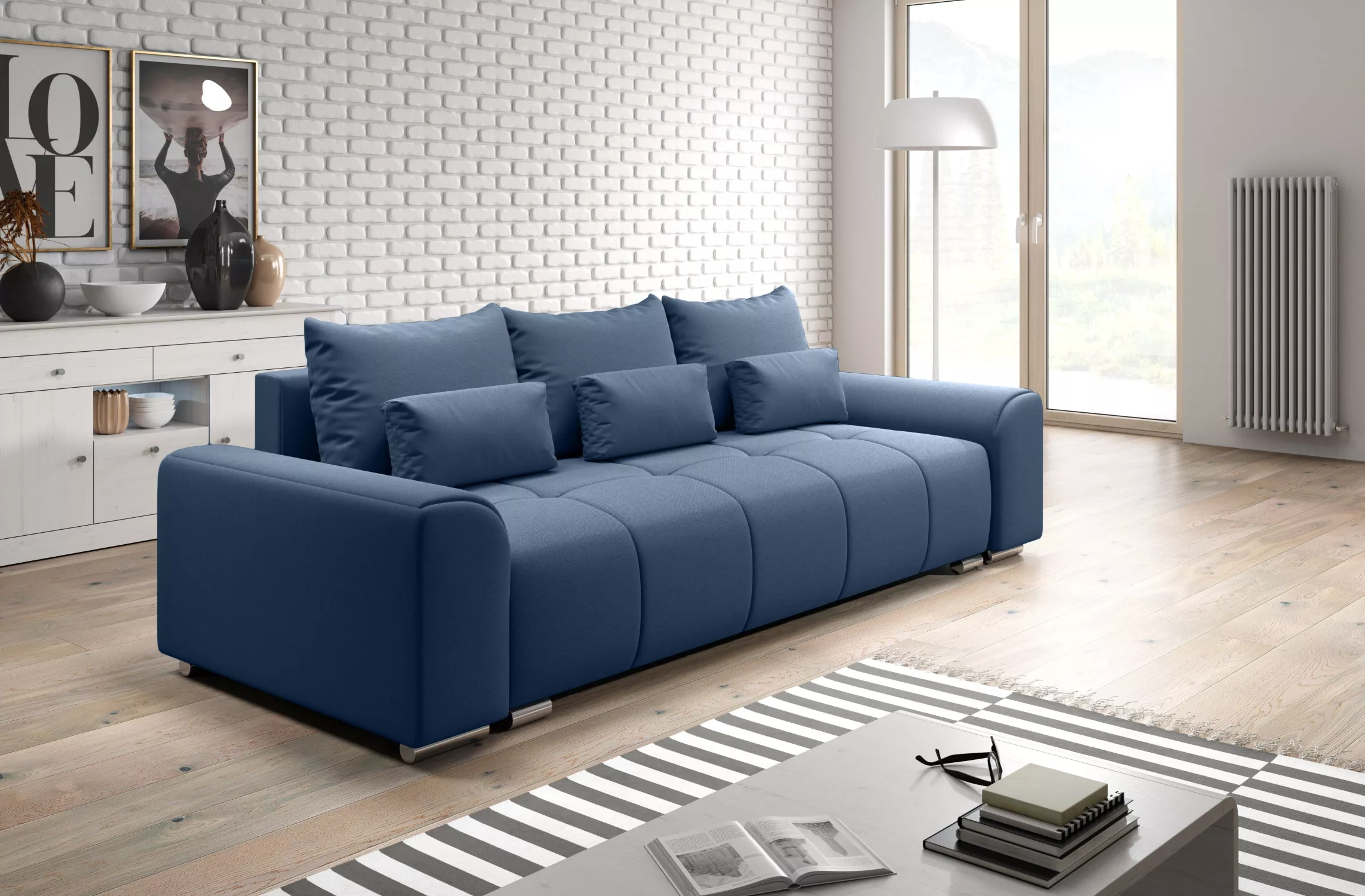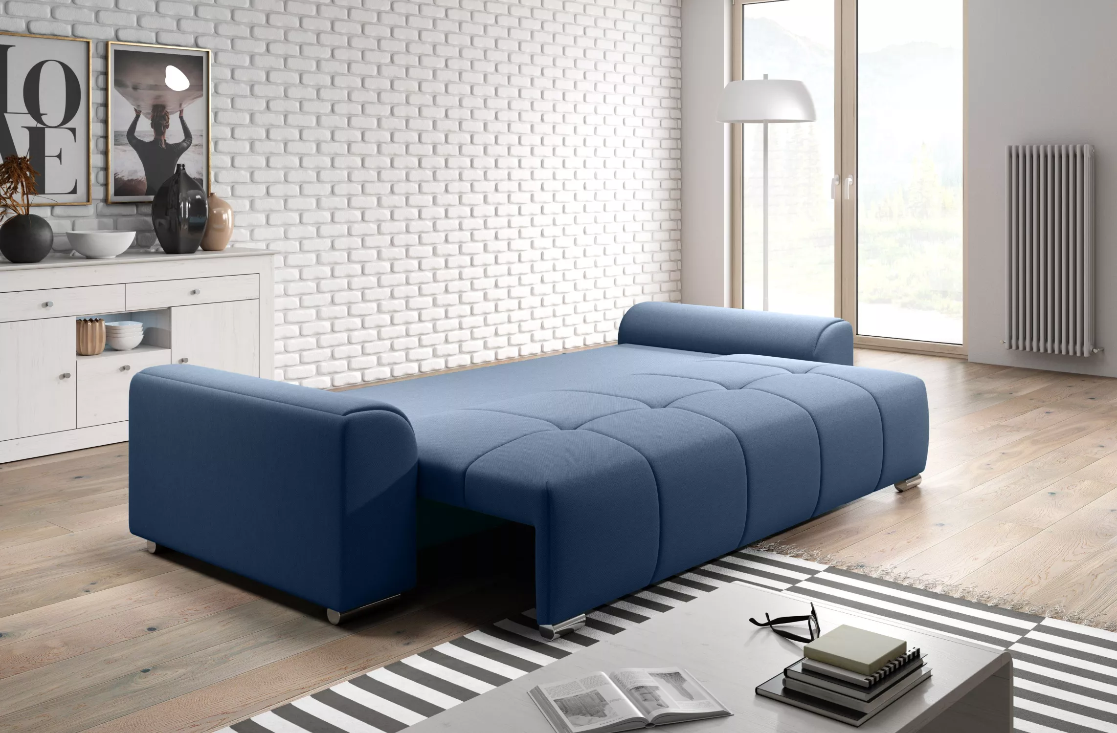 Trojmístná rozkládací pohovka RANDA svým designem zapadne do všech moderních obývacích pokojů. Opěradlo ve formě volně ložených polštářů vám zpříjemní každodenní používání. Zadní část pohovky je čalouněná látkou, což umožňuje její umístění kdekoliv v místnosti.