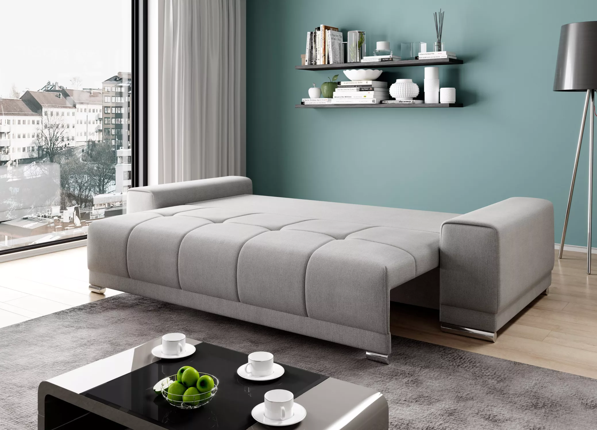 Třímístná pohovka VELIKA svým designem zapadne do všech moderních obývacích pokojů. Opěradlo ve formě volně ložených polštářů vám zpříjemní každodenní používání. Pohovku snadno proměníte na lůžko o rozměrech 148x196 cm.