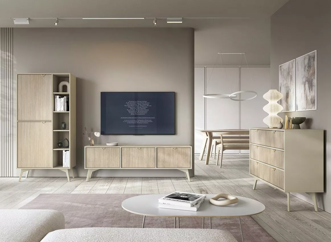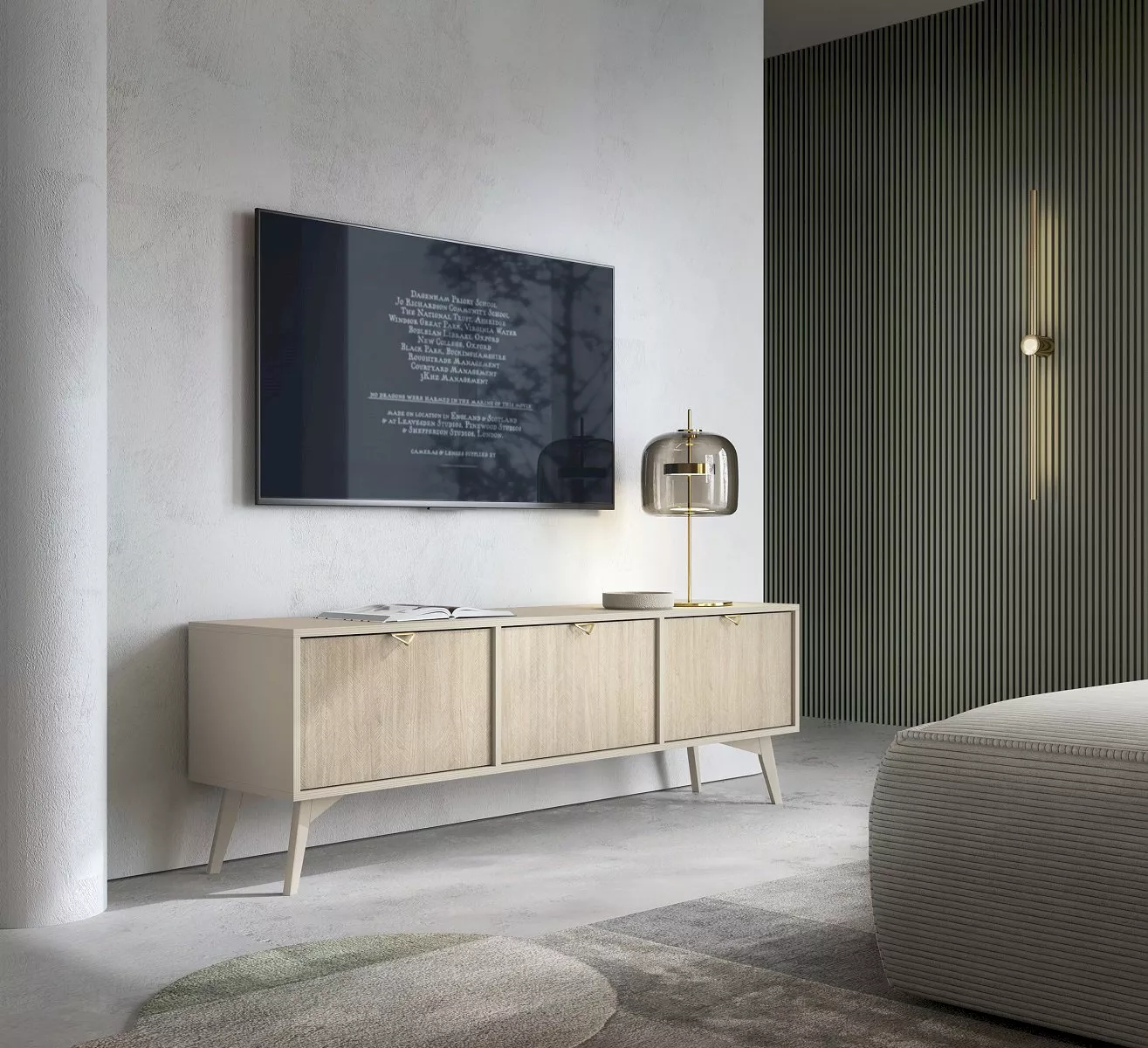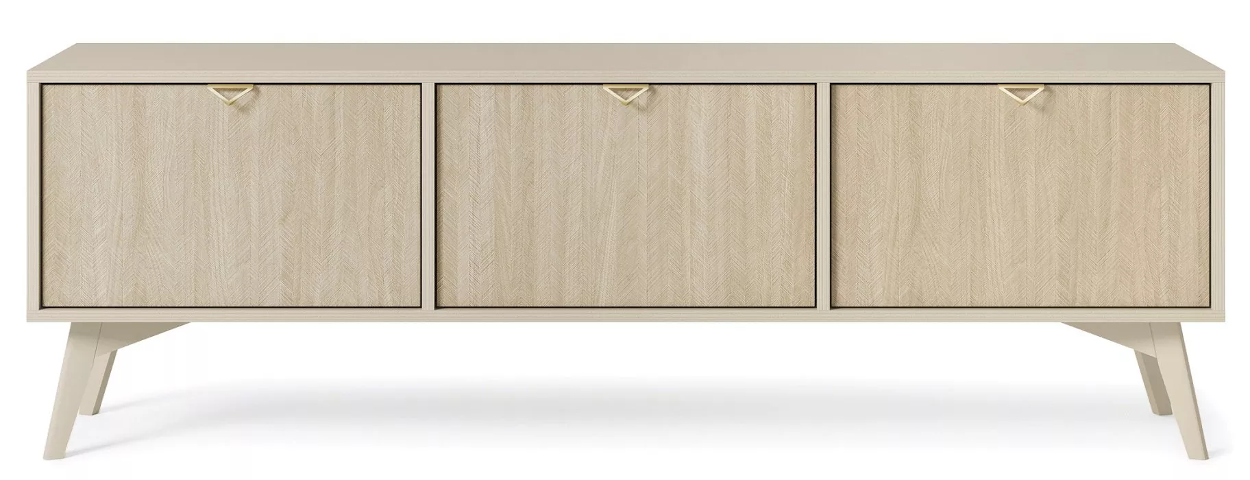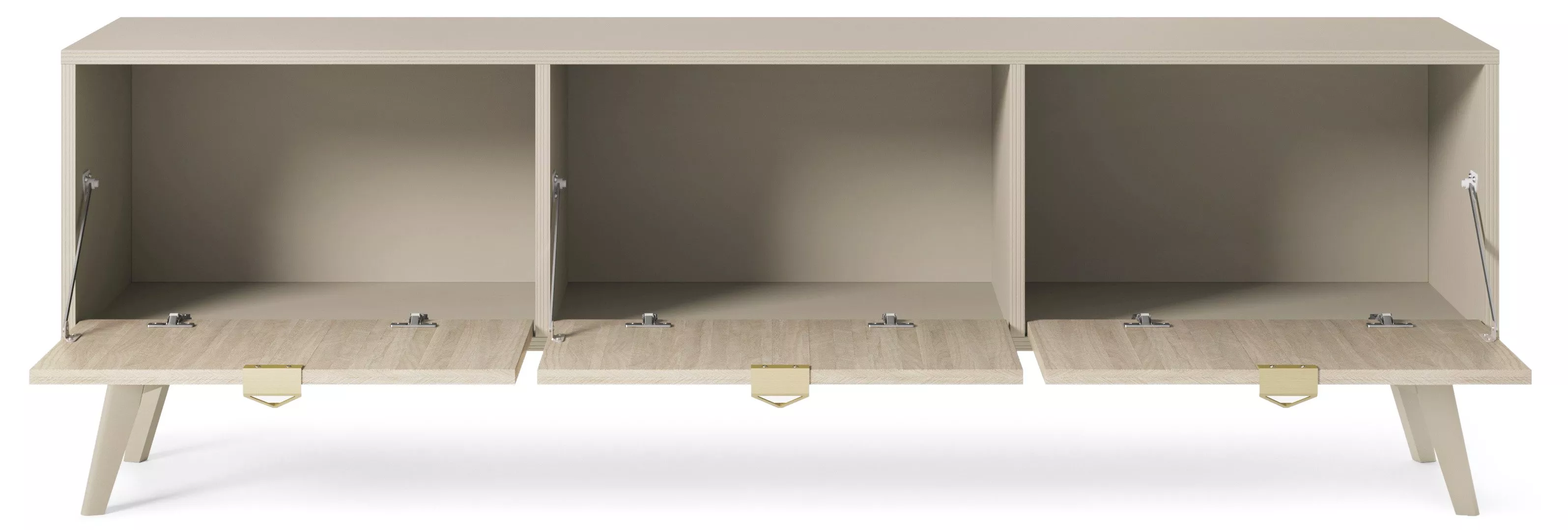 Televizní stolek MEDEA je kus nábytku ve skandinávském stylu. Skříň obsahuje 3 velké, prostorné přihrádky. Moderní a minimalistický design v kombinaci s jemnými barvami působí moderně a stylově. Otevírání je zajištěno trojúhelníkovými úchyty zlaté barvy.