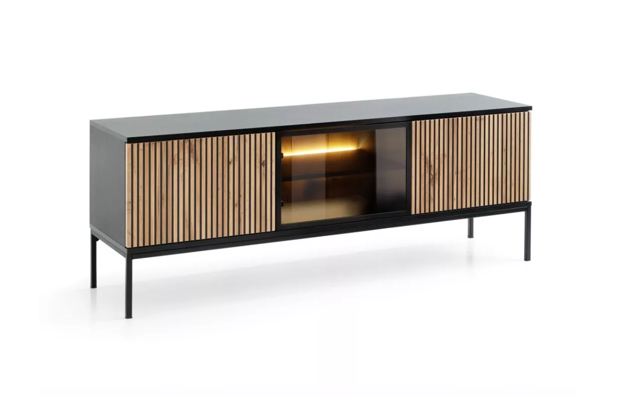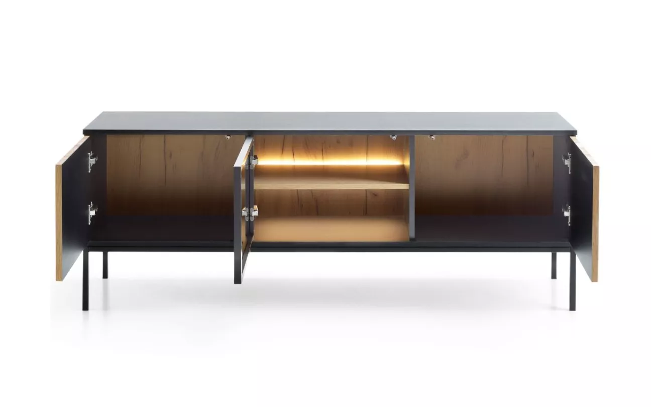 Televizní stolek ILARIA kombinuje funkčnost, styl a moderní design. Díky elegantní kombinaci černé barvy a dubu vnáší do interiéru kontrast a harmonii. Skříňky se otevírají pomocí systému "PUSH TO OPEN".