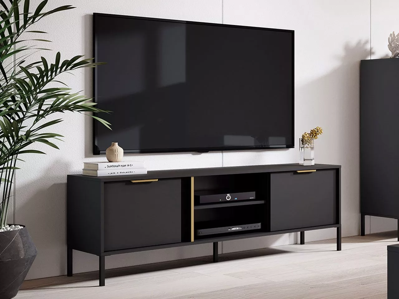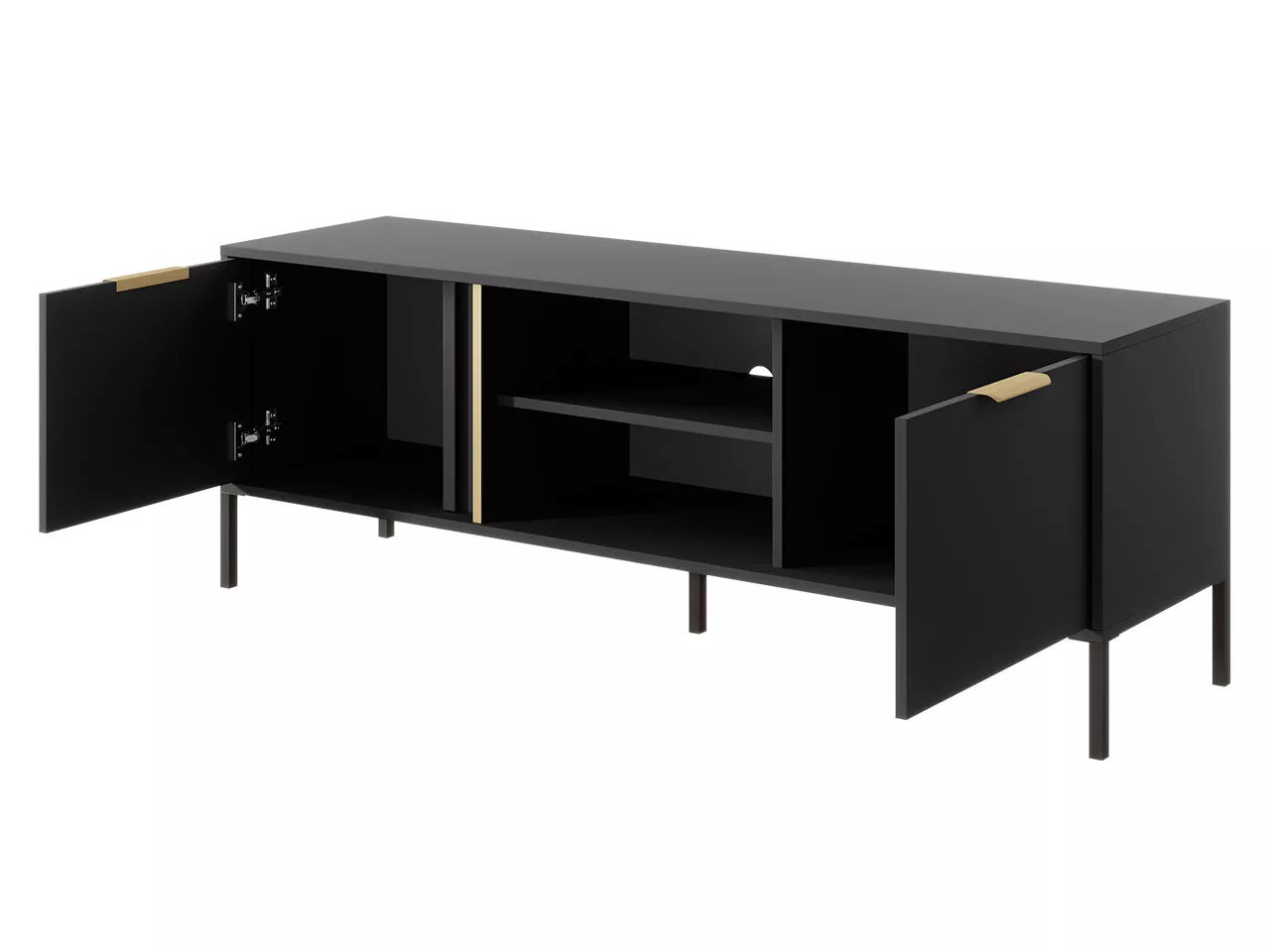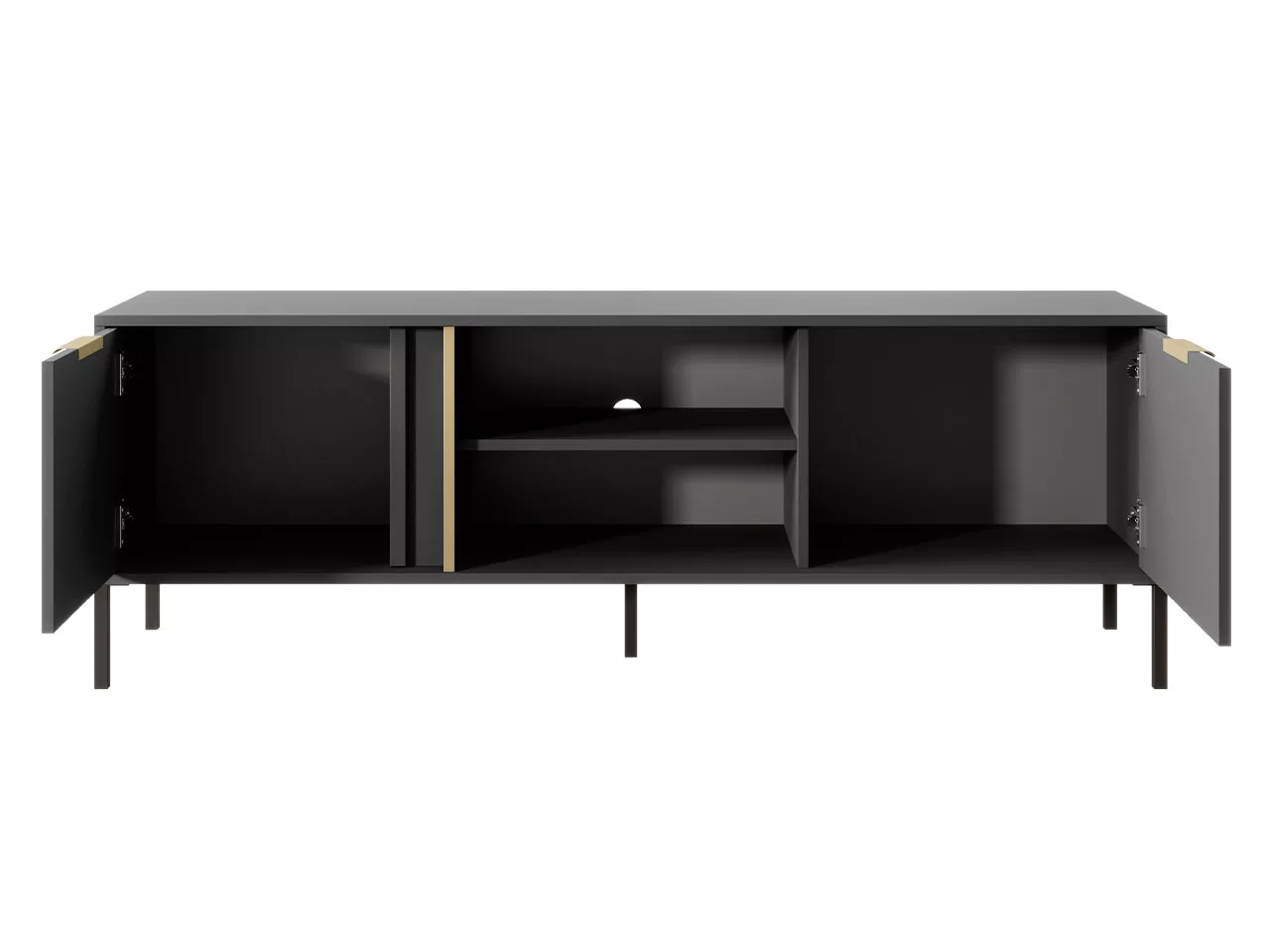 Stolek pod TV NUCOR 1 kombinuje funkčnost s neuvěřitelným stylem. Tmavé barvy v kombinaci se zlatými prvky se skvěle hodí do současných i klasických interiérů. Díky prostorným skříňkám a policím snadno uložíte spoustu vašich oblíbených filmů, knih či konzolových her.