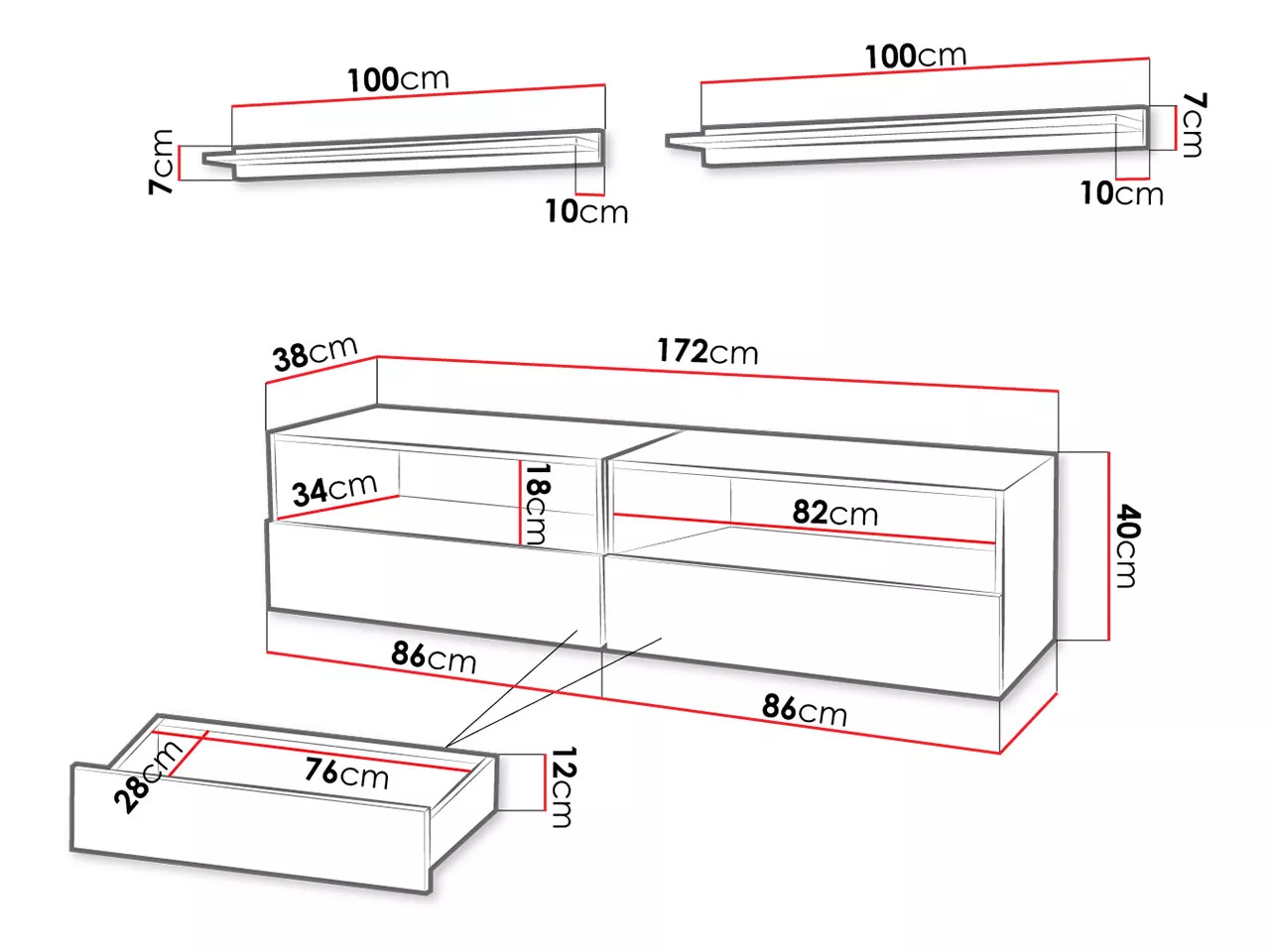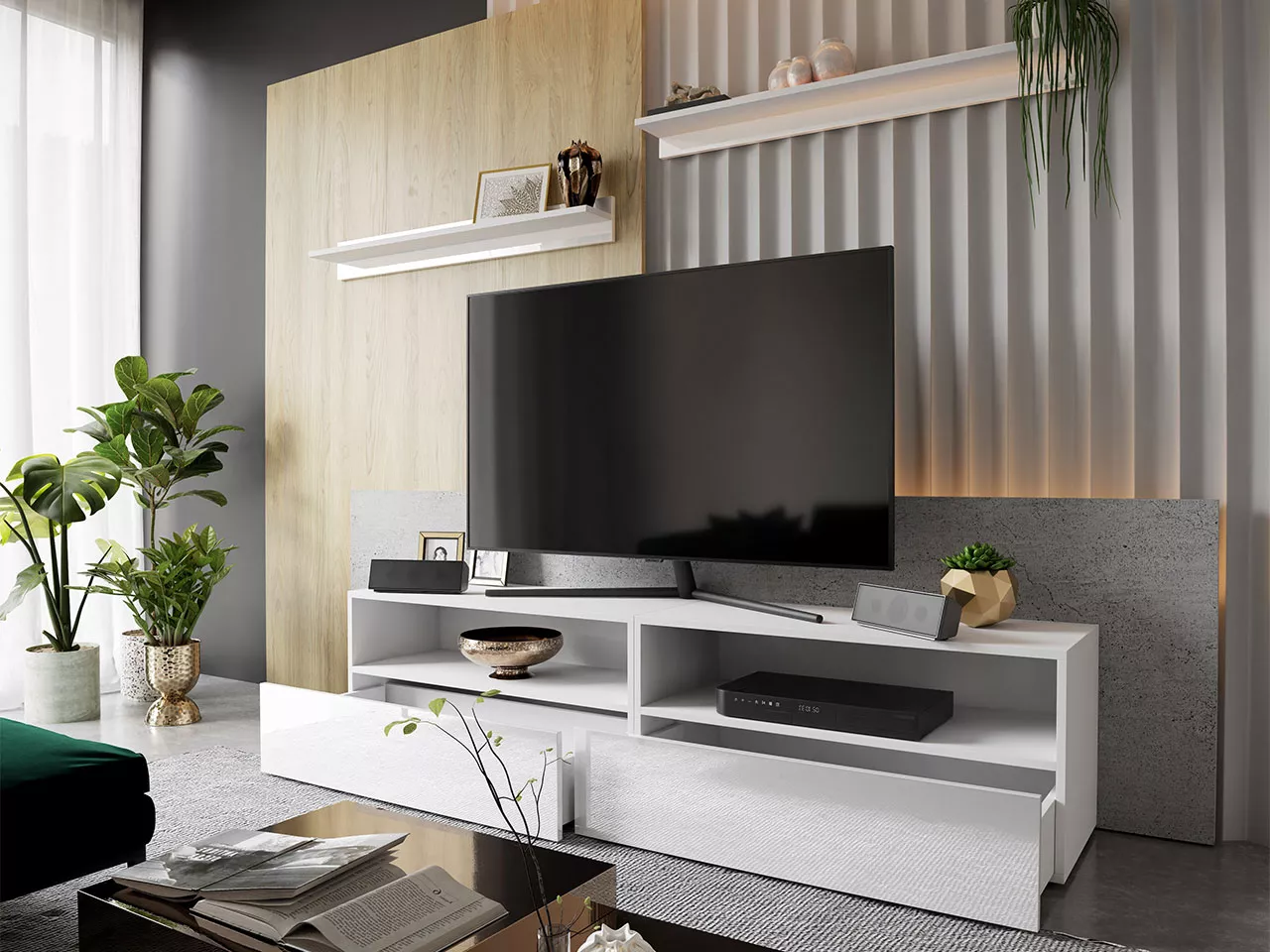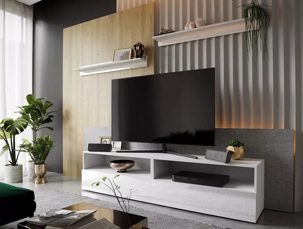 Set SALADO se skládá ze 2 TV stolků o šířce 86 cm a 2 závěsných poliček. Geometrický tvar v kombinaci s lesklými čely je kombinací, která opticky zvětší každou místnost. Stolky jsou vybaveny 2 otevřenými poličkami a šuplíky.