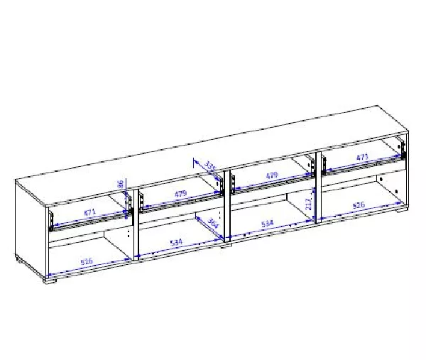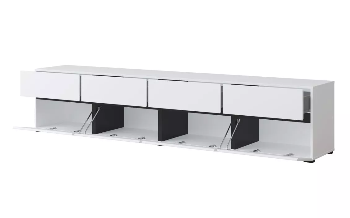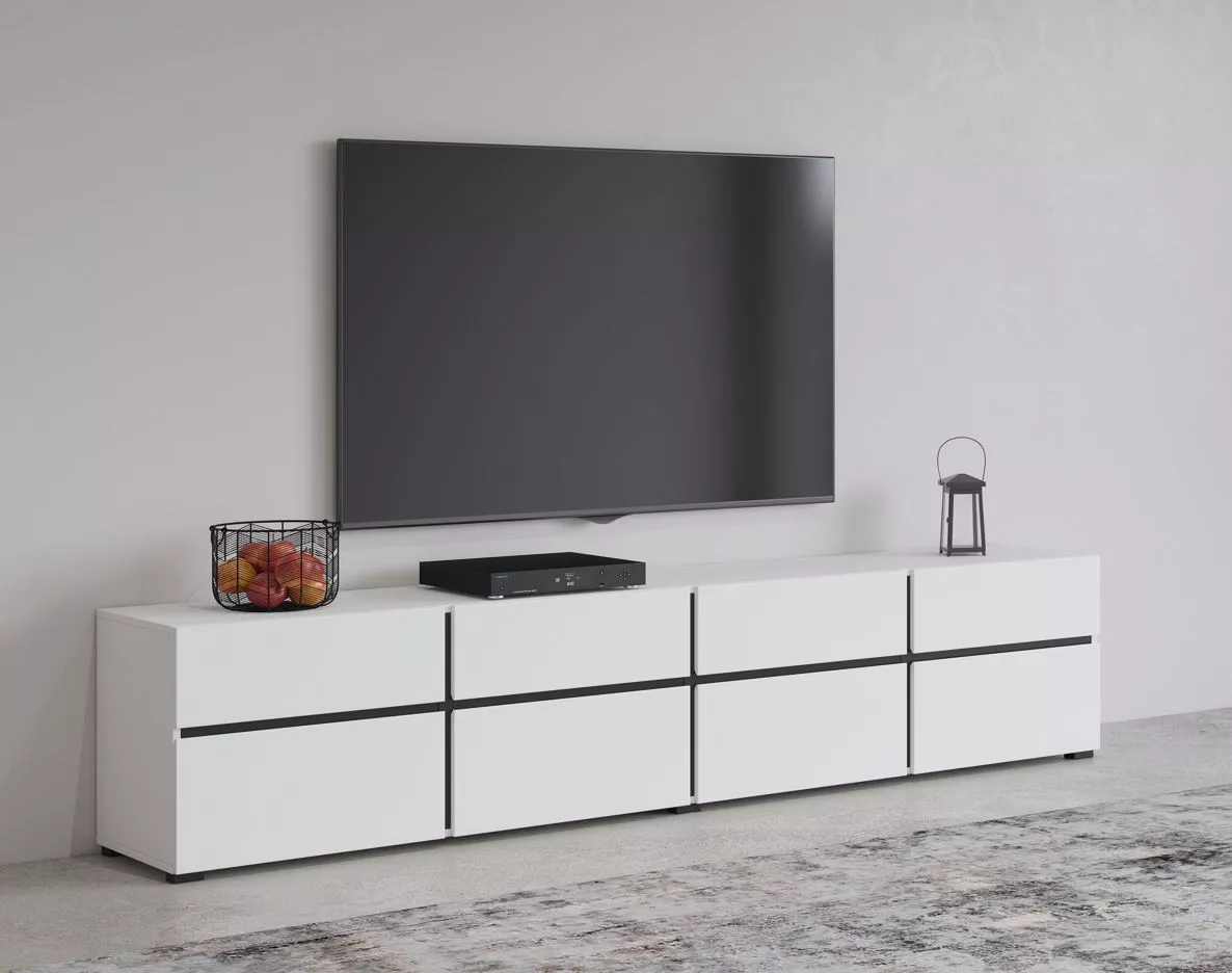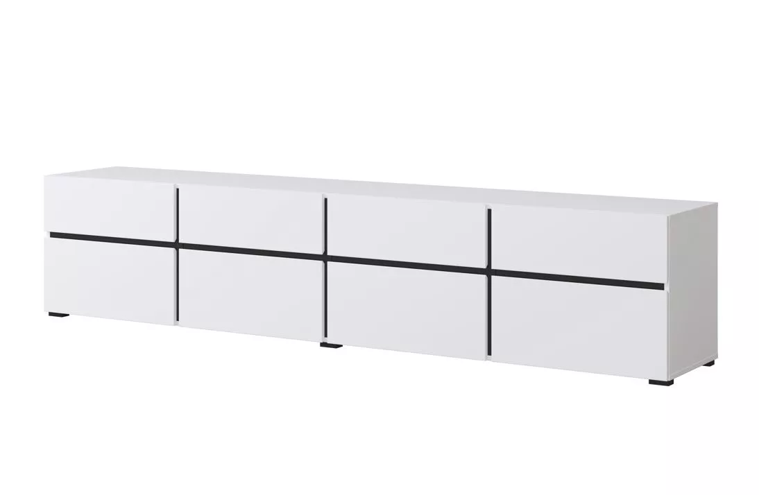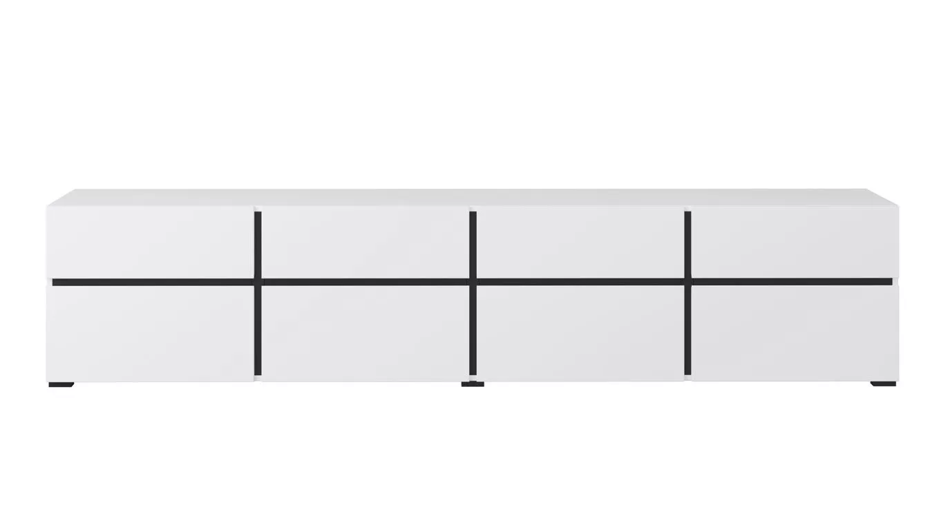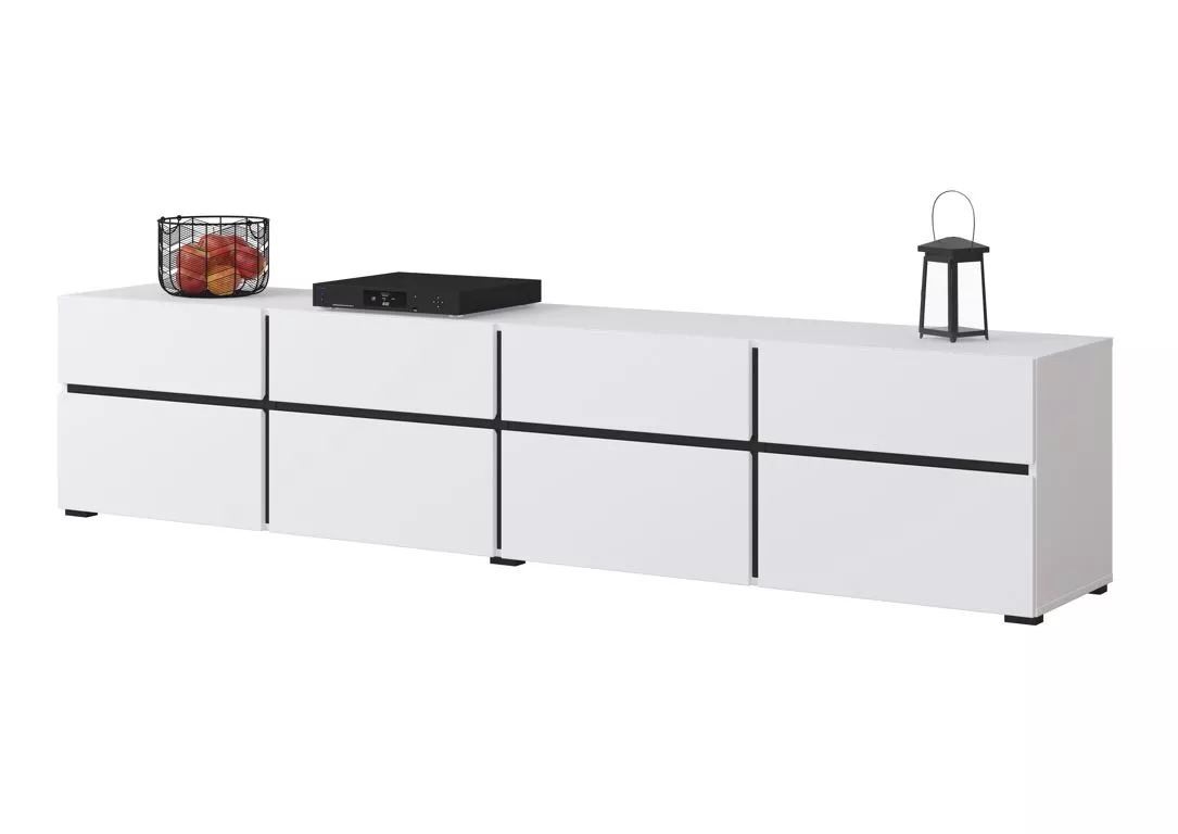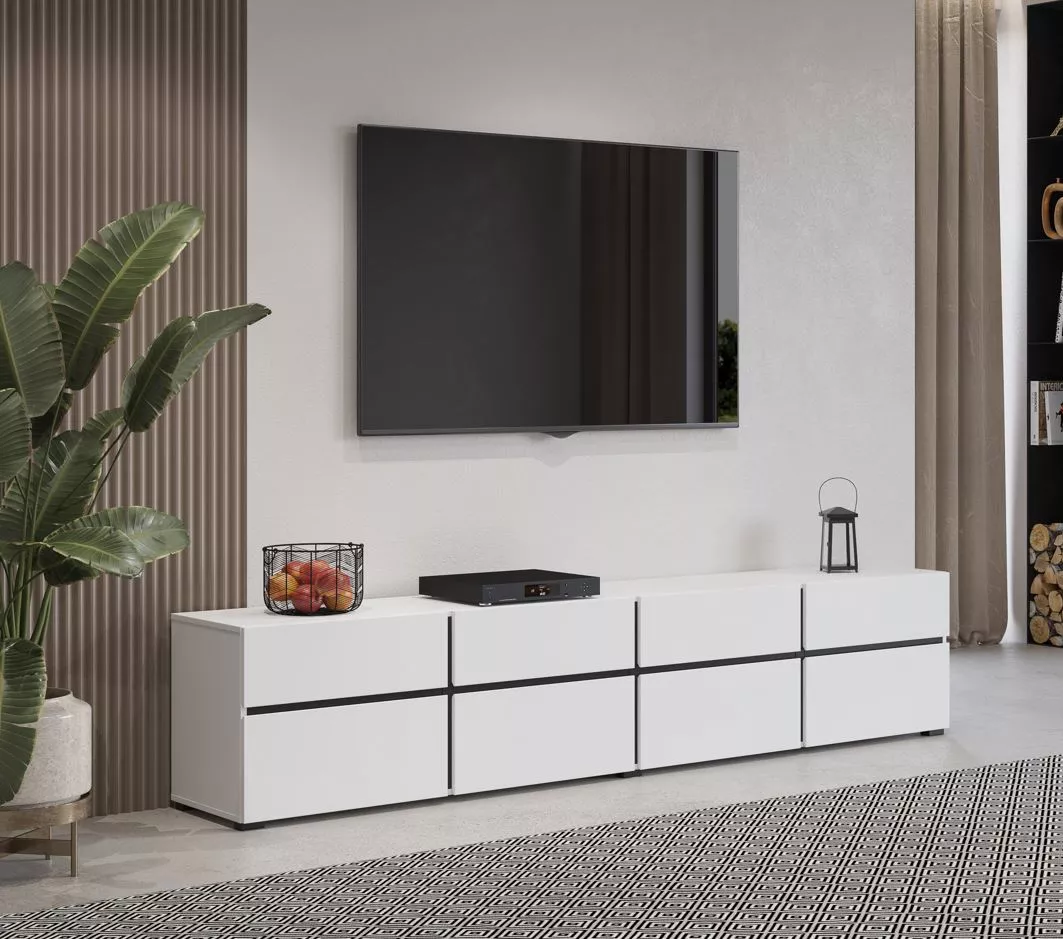 Široký TV stolek GLENROSE nabízí kromě stylového vzhledu také prostorný interiér. Díky úložnému prostoru v podobě 4 barových skříněk a šuplíků snadno uschováte své multimediální vybavení a nepotřebné kabely.