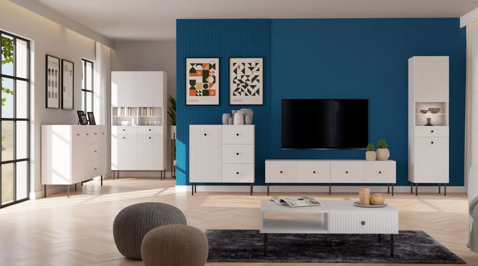 Užijte si dokonalou rovnováhu mezi pohodlím a elegancí ve vašem obývacím pokoji s televizním stolkem HASKEL. Stolek se pyšní jedinečným moderním designem. Prostorné skříňky se postarají o dostatek úložného prostoru pro veškeré televizní příslušenství.