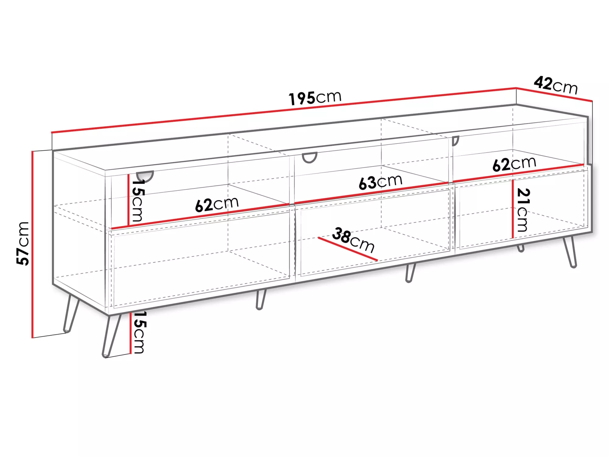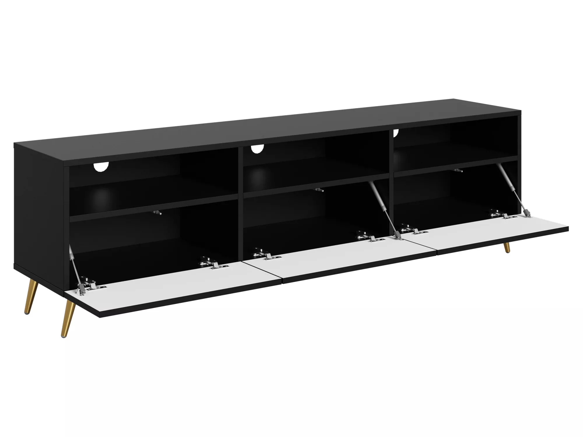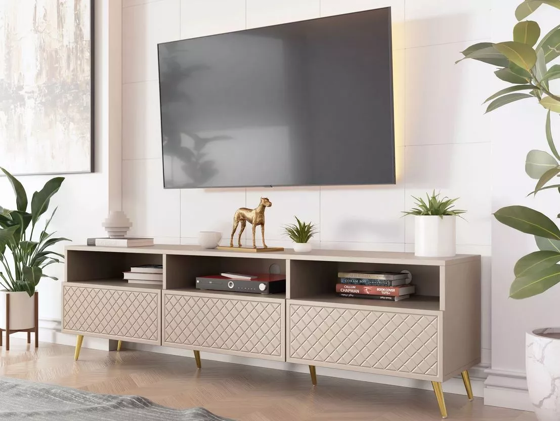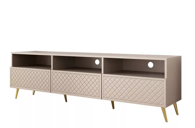 Široký TV stolek TAGO s nadčasovým designem a kvalitním zpracováním je ideálním doplňkem každého obývacího pokoje, který zaujme svým vzhledem i funkčností. Dekorativní čela zásuvek působí velmi elegantně. V kombinaci s módní barvou a vysokými, zlatými nožičkami tvoří harmonický celek, který přitahuje pozornost.