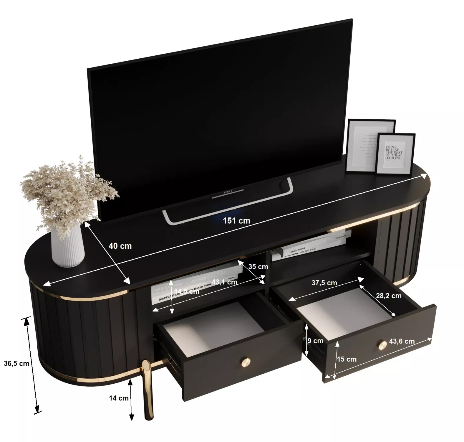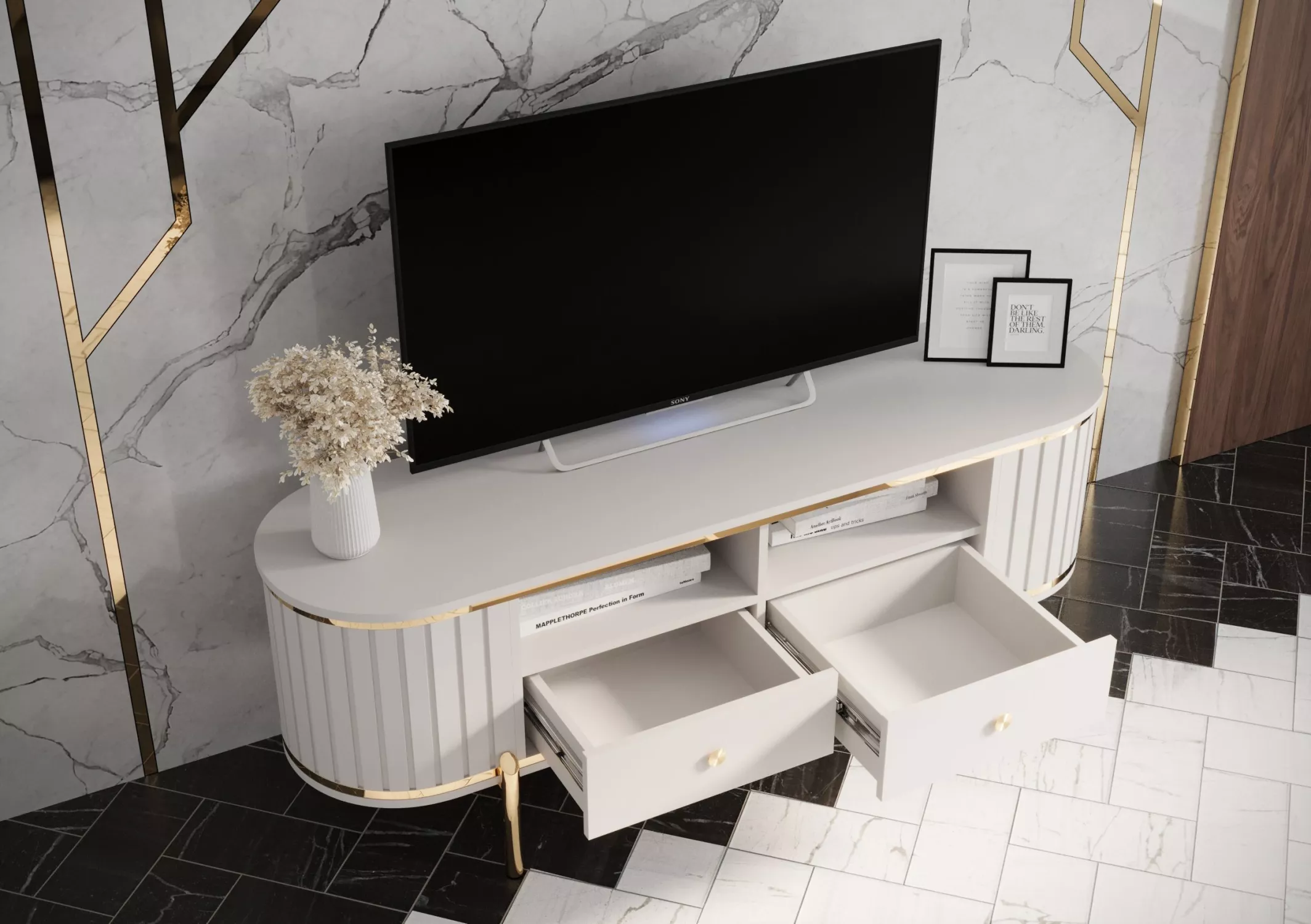Televizní stolek TEYO skvěle zapadne do každého moderního obývacího pokoje. Pyšní se zaobleným tvarem a lze jej umístit i do středu interiéru. Je vybaven 2 šuplíky a 2 přihrádkami pro uložení veškerého televizního příslušenství.