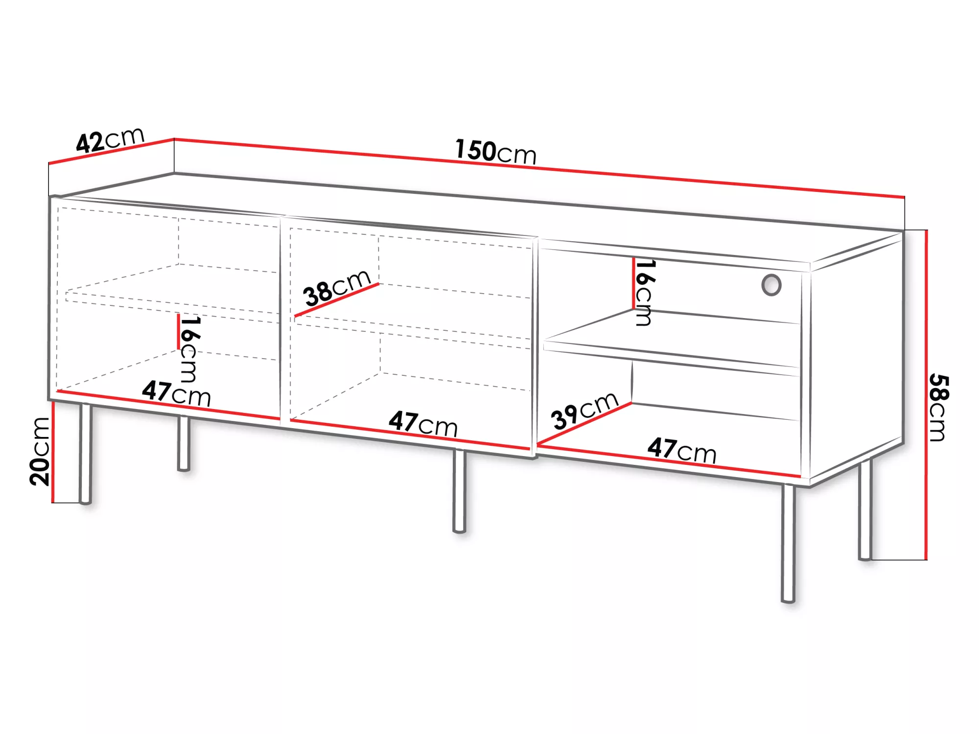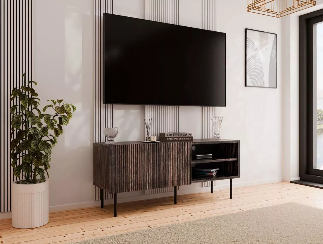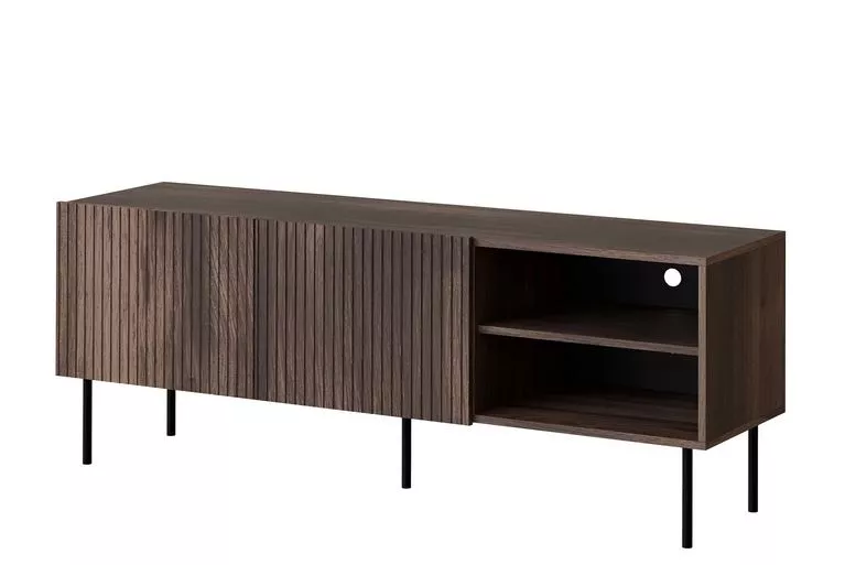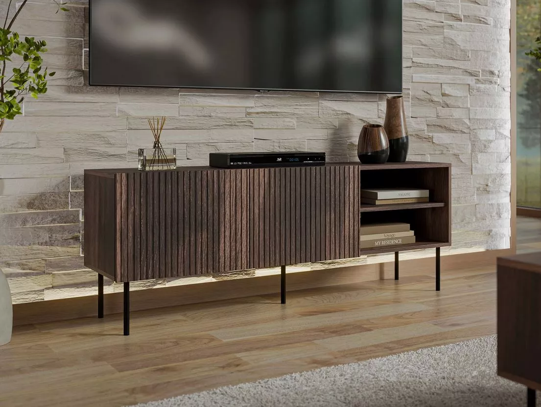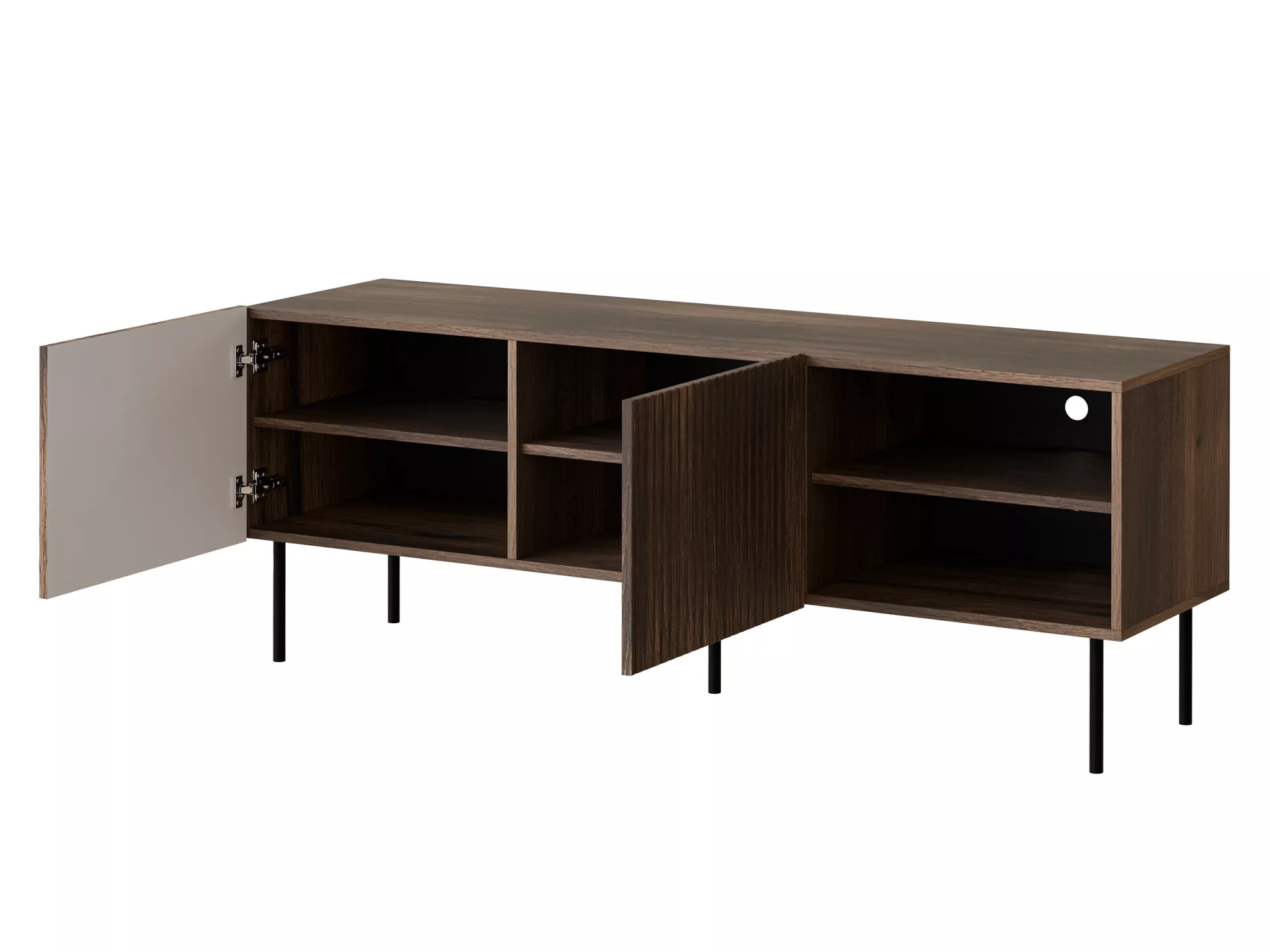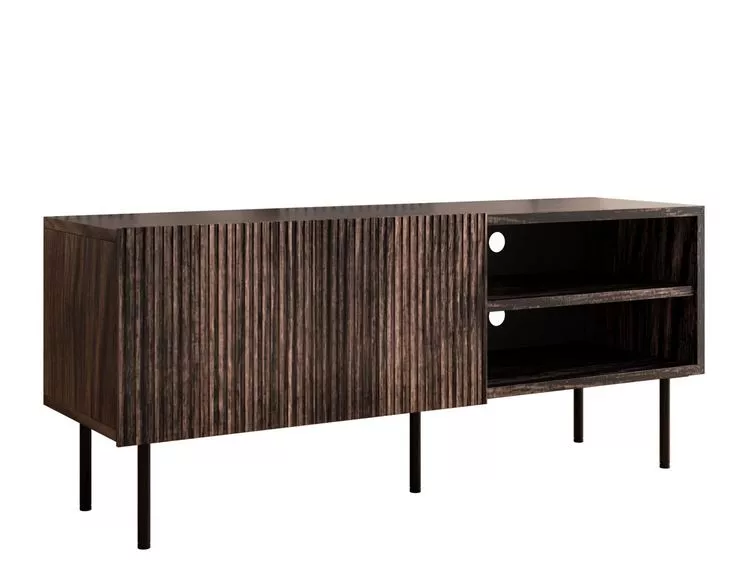 Dodejte svému obývacímu pokoji moderní nádech s televizním stolkem ANGET, který nabízí dostatečný úložný prostor. Drážkovaná dvířka přidávají stolku jedinečný vzhled, zatímco vysoké nožky jsou ideální pro snadnější úklid a dodávají stolku vzdušný vzhled.