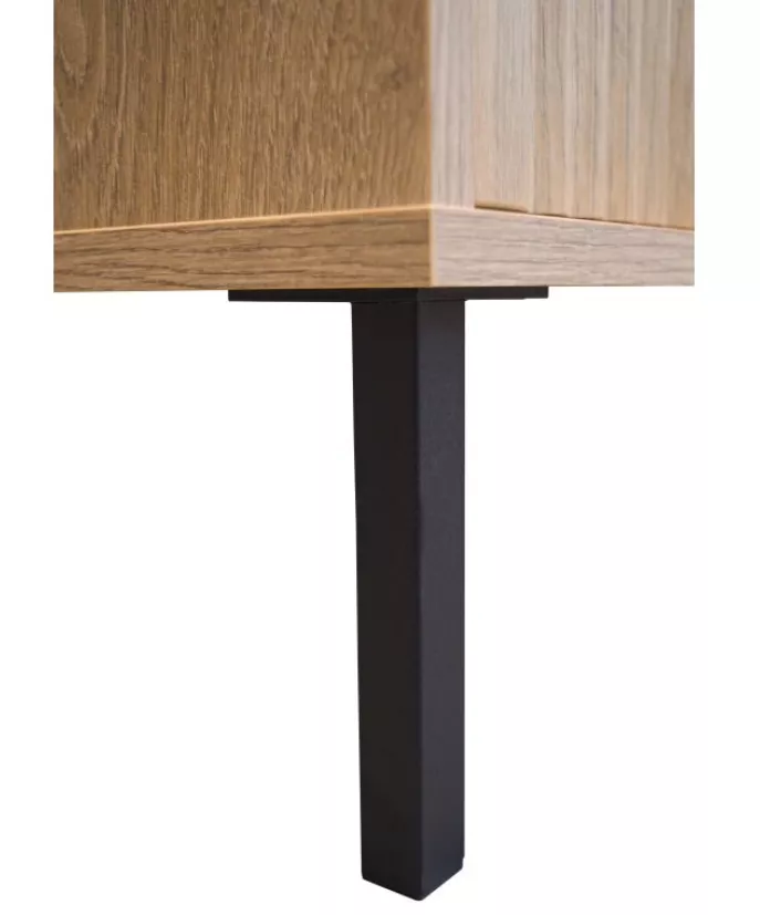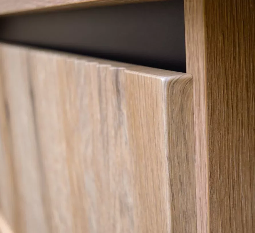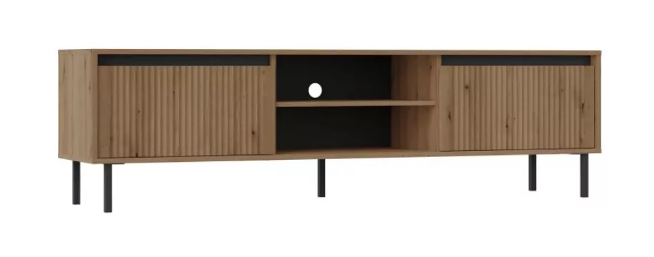 Televizní stolek TIRIL zaujme 3D dvířky. Součástí jsou 2 šuplíky na kuličkových pojezdech a polička.