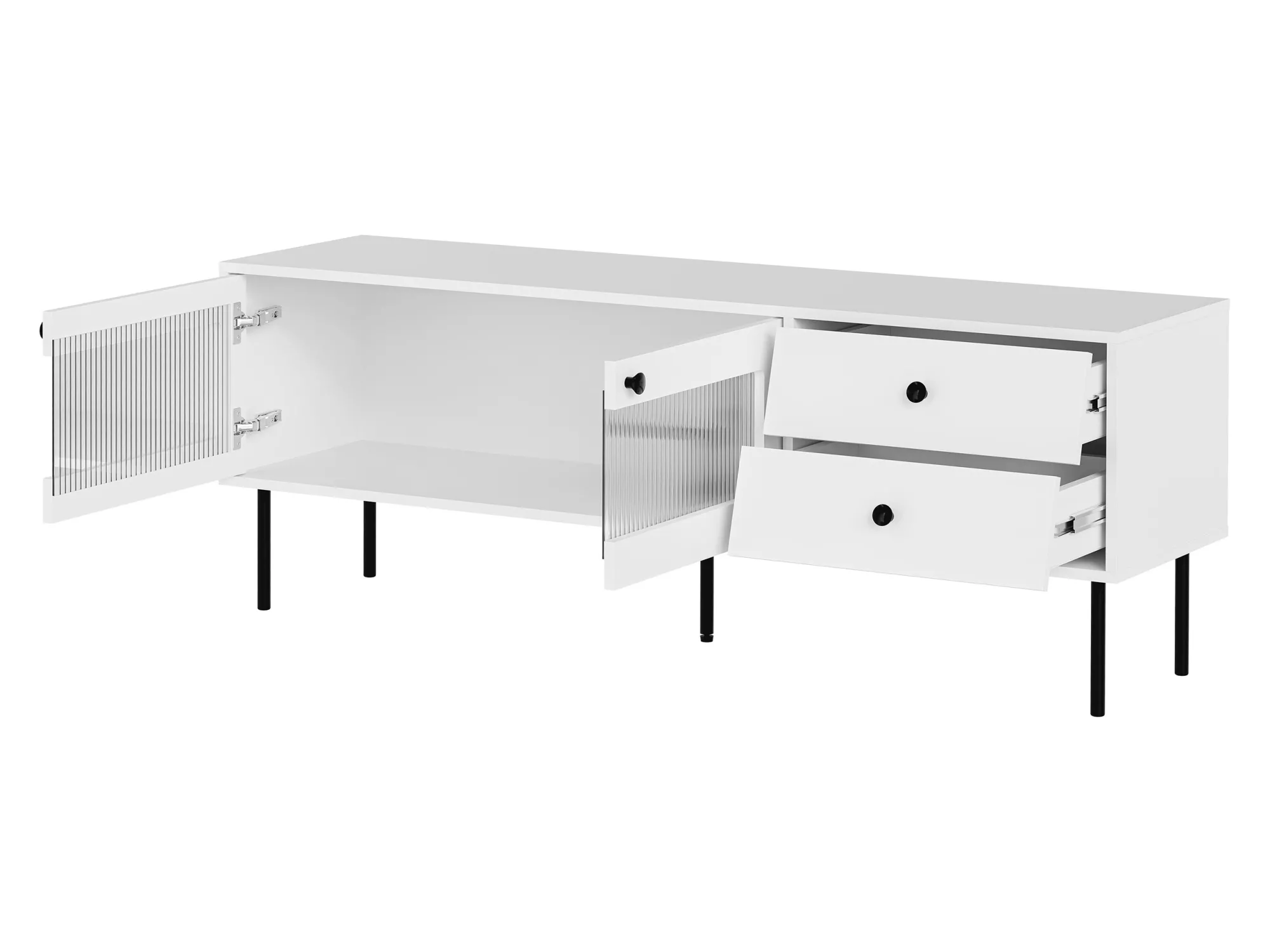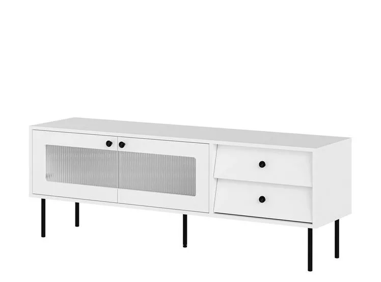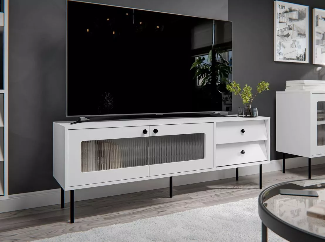 Dodejte vašemu obývacímu pokoji jedinečný šmrnc s TV stolkem FORNEY. Stolek je vybaven 2 zásuvkami a uzavřenou skříňkou s drážkovaným sklem, které jemně zobrazuje obsah uvnitř stolku.