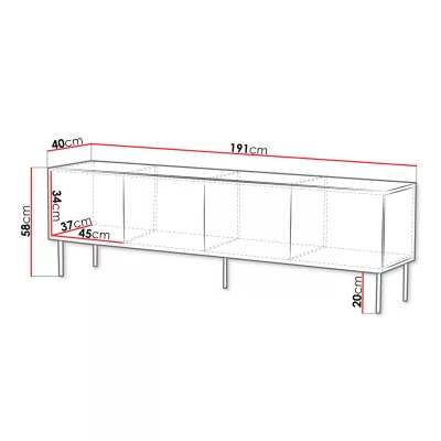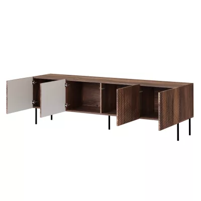 TV stolek RIESEL s působivou šířkou 191 cm je skutečným klenotem ve stylu Art Deco, který přináší eleganci do každého prostoru. Je ideální volbou pro klasické, moderní i rustikální interiéry. Krásný odstín dekoru ořech vnese do vašeho pokoje příjemné teplo a útulnost, zatímco geometrické tvary na předních dvířkách dodávají stolku unikátní charakter. TV stolek nabízí 4 prostorné uzavřené skříňky, které poskytují dostatek úložného prostoru pro veškeré příslušenství.