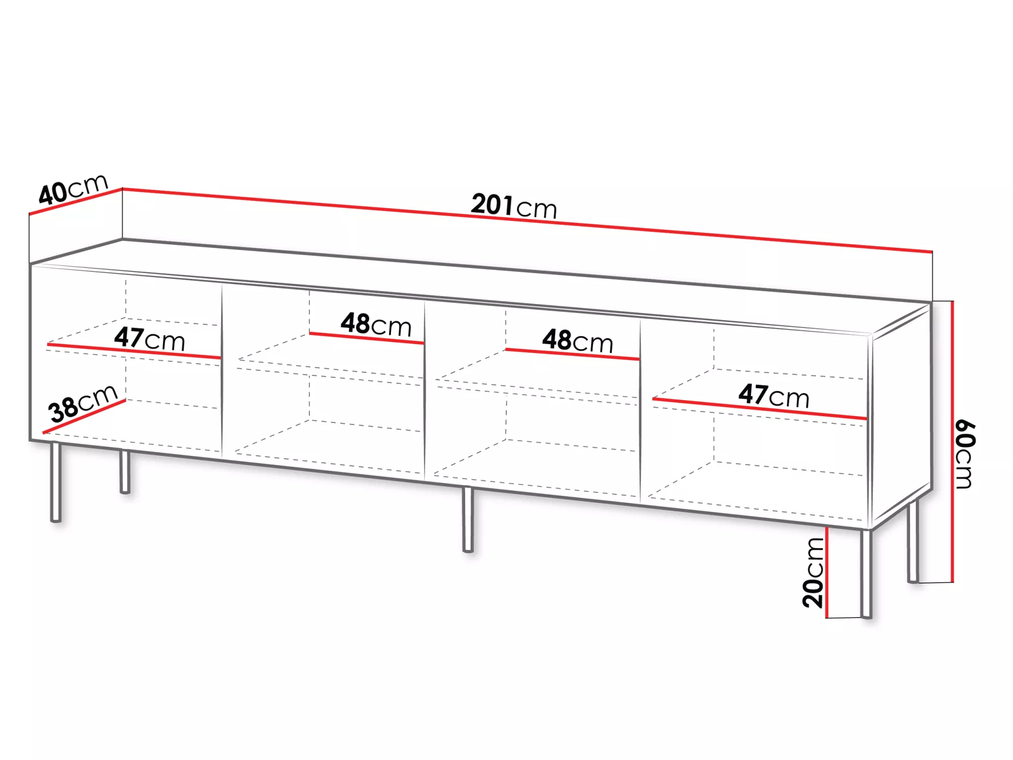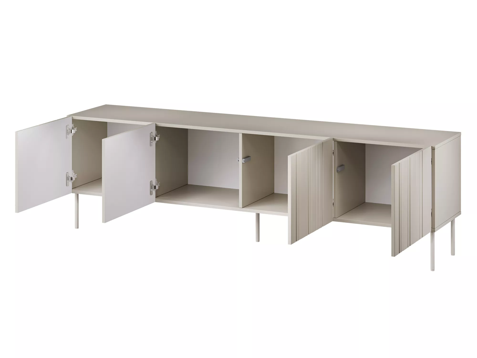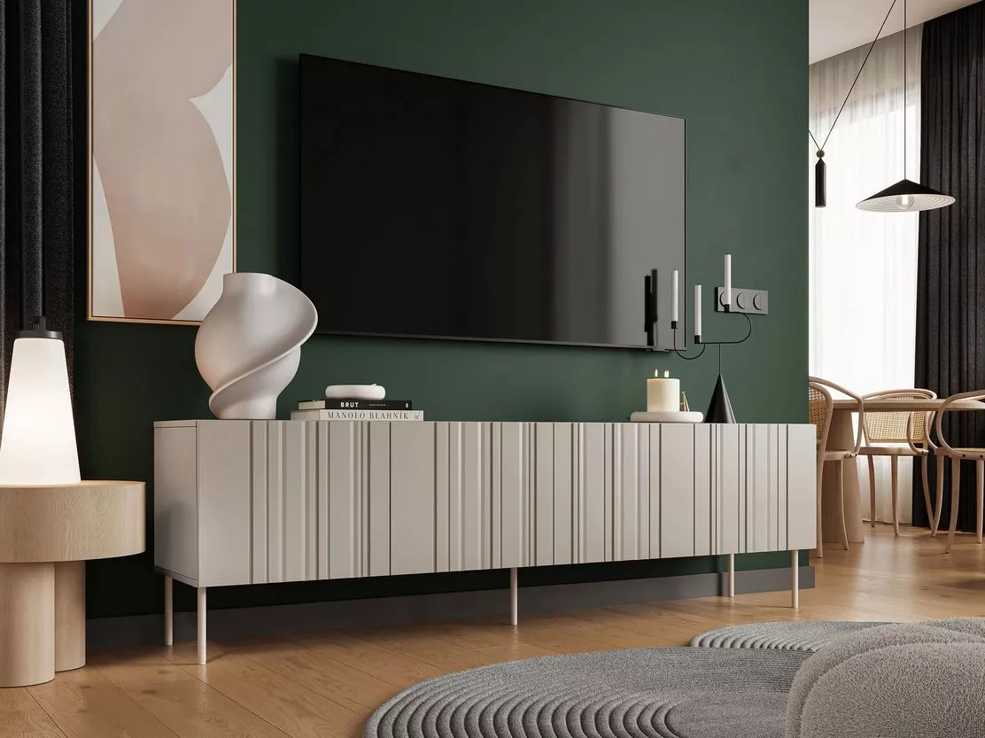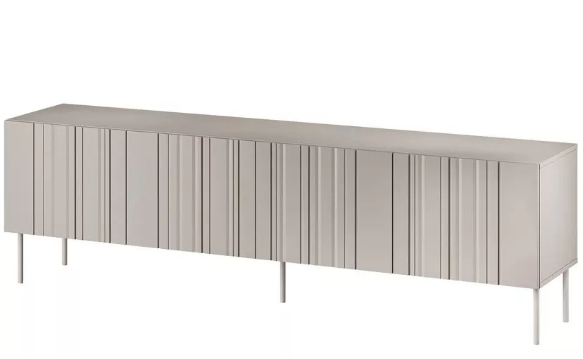 Široký TV stolek KERENS je stylovým a praktickým doplňkem každého moderního obývacího pokoje. Zaujme dekorativními čely s viditelným frézováním a vysokými stabilními kovovými nožkami, které dodávají designu jedinečný charakter. Stolek nabízí dostatek úložného prostoru. Horní deska je ideální pro umístění dekorací, jako jsou svíčky, figurky či jiné doplňky.