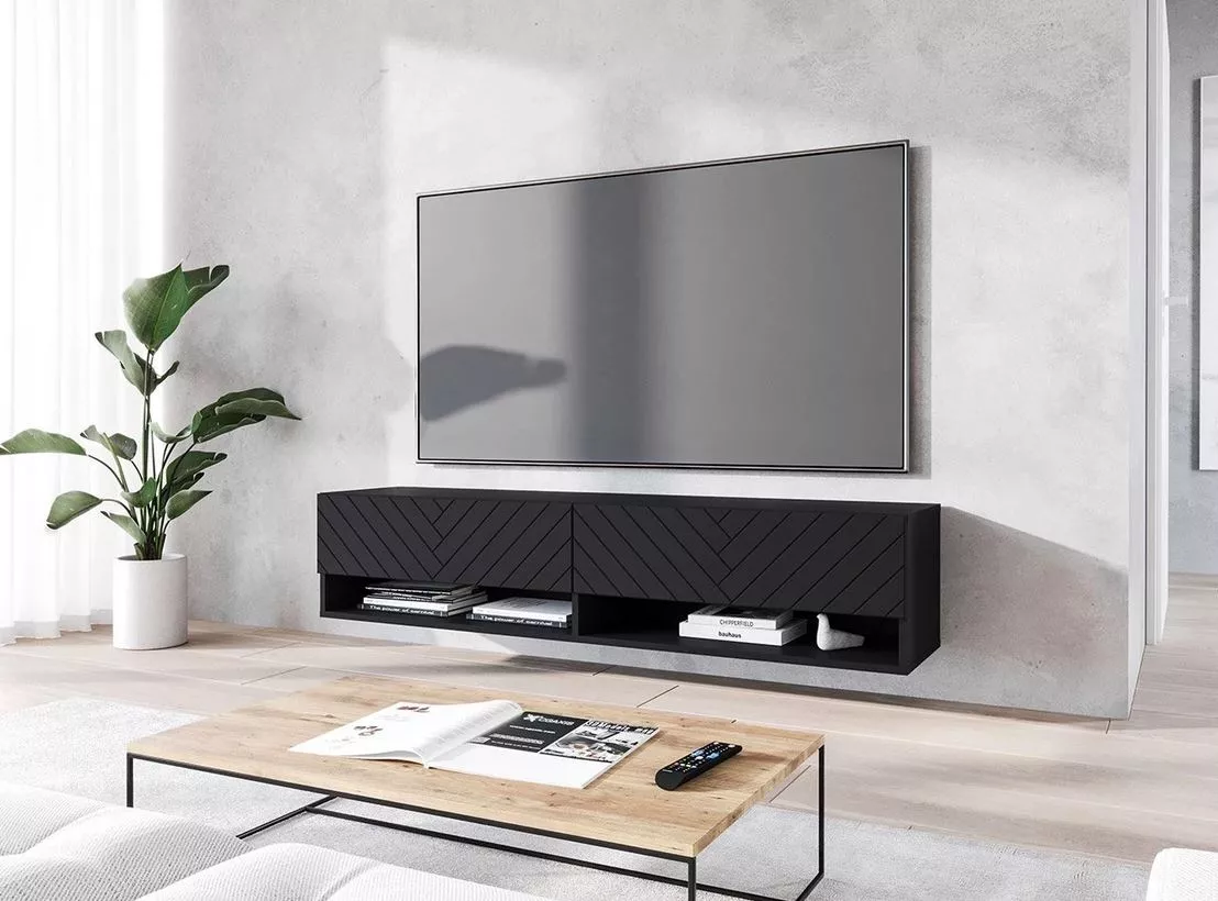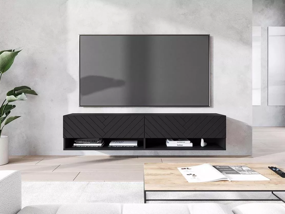 TV stolek WILLA A o šířce 140 cm je ideální volbou pro moderní obývací pokoj, kde spojí styl s praktičností. Frézování ve tvaru rybí kosti dodává interiéru eleganci, zatímco kombinace skříněk a otevřených polic nabízí dostatek prostoru pro TV příslušenství i dekorace. Díky své šířce poskytuje stabilní základnu pro televizi, a zároveň vytváří vkusný designový prvek.