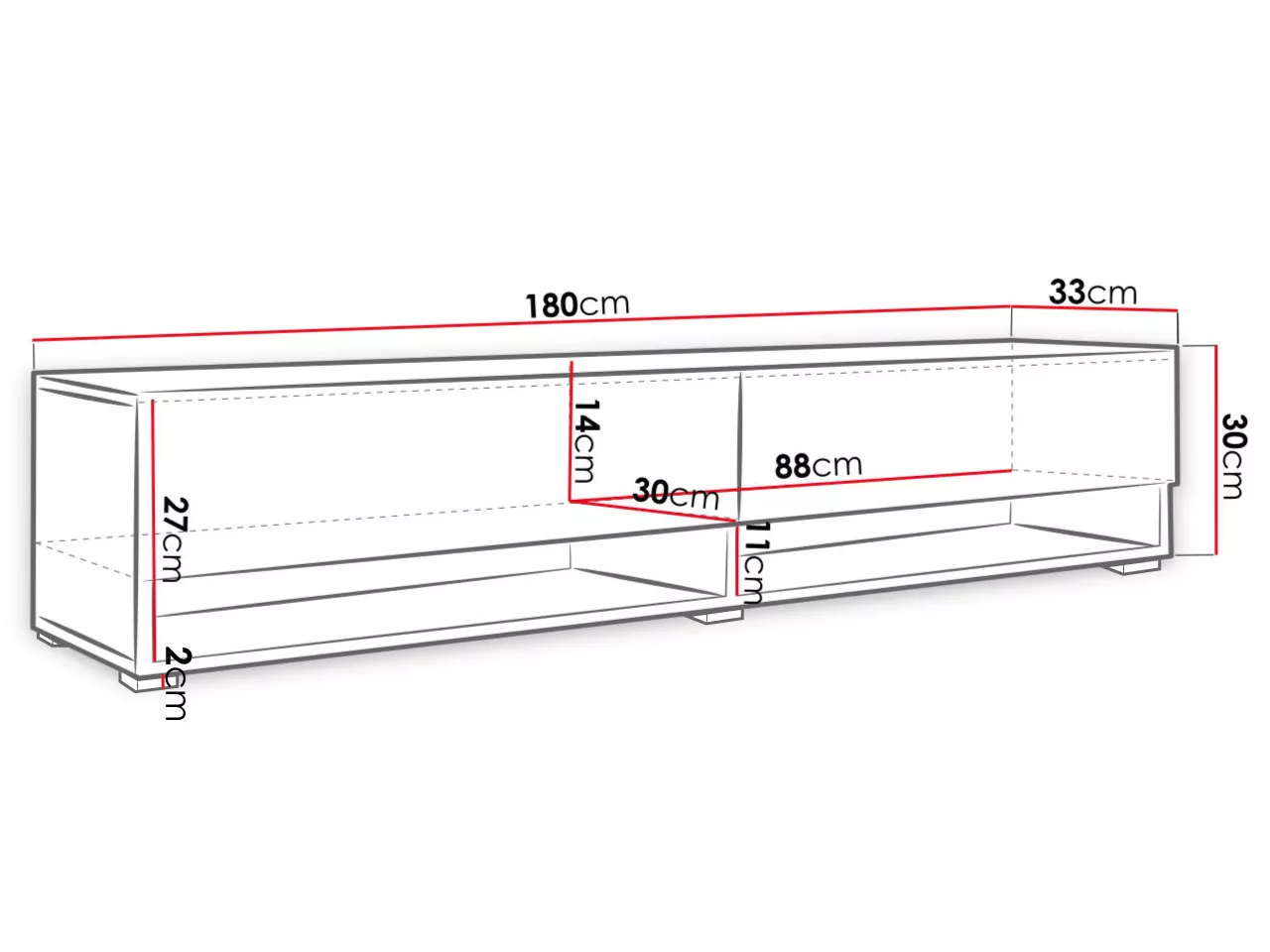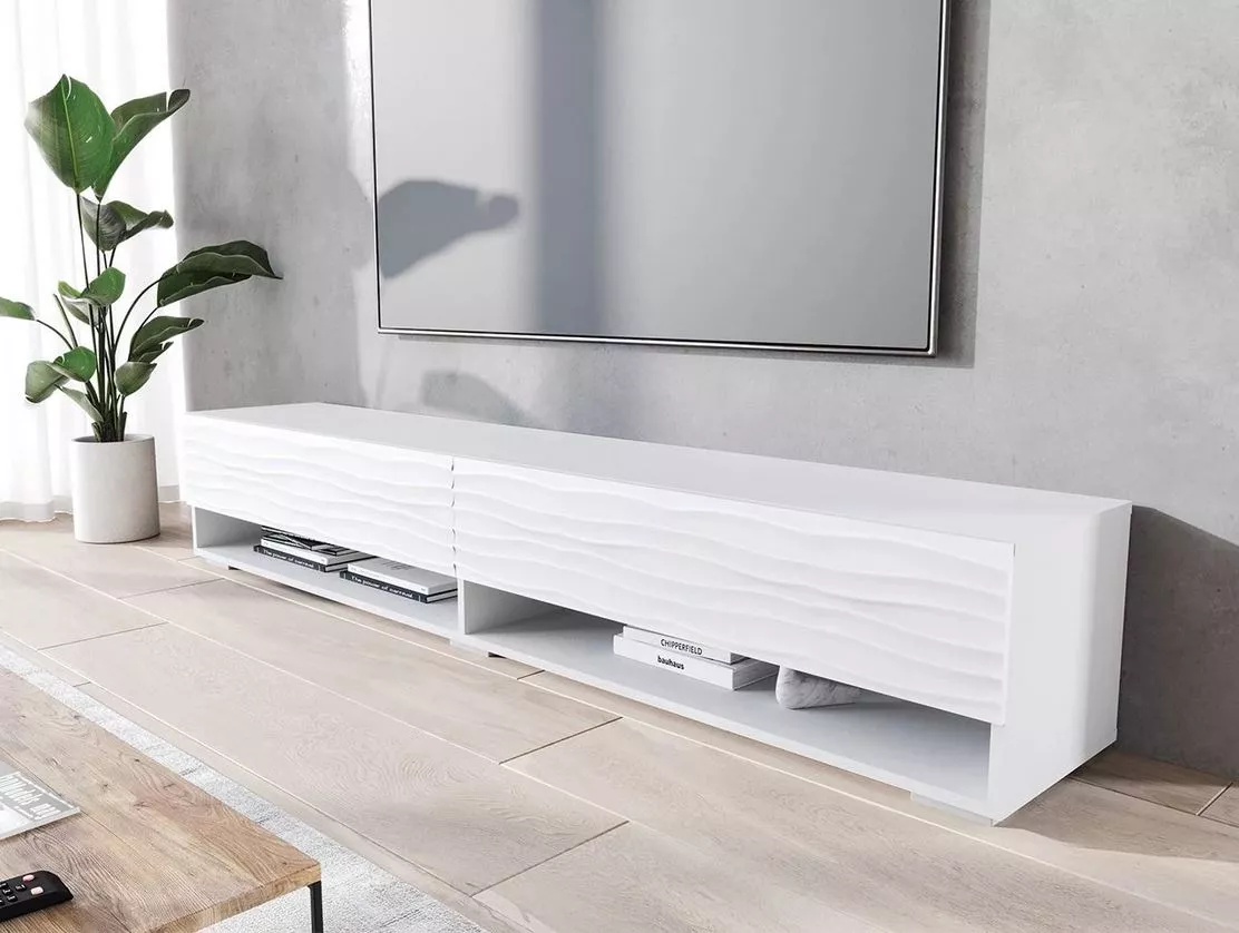 TV stolek WILLA A o šířce 180 cm je ideální volbou pro moderní obývací pokoj, kde spojí styl s praktičností. Frézování ve tvaru rybí kosti dodává interiéru eleganci, zatímco kombinace skříněk a otevřených polic nabízí dostatek prostoru pro TV příslušenství i dekorace. Díky své šířce poskytuje stabilní základnu pro televizi, a zároveň vytváří vkusný designový prvek.