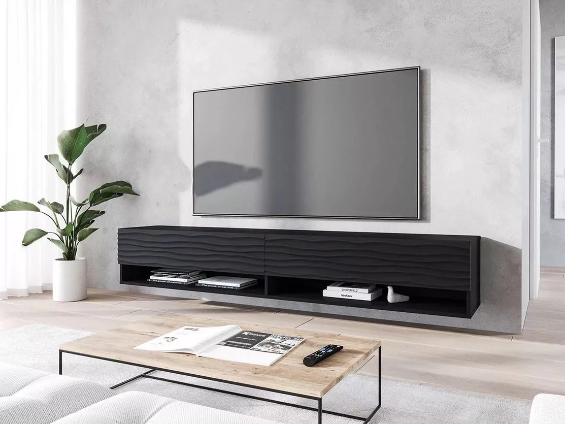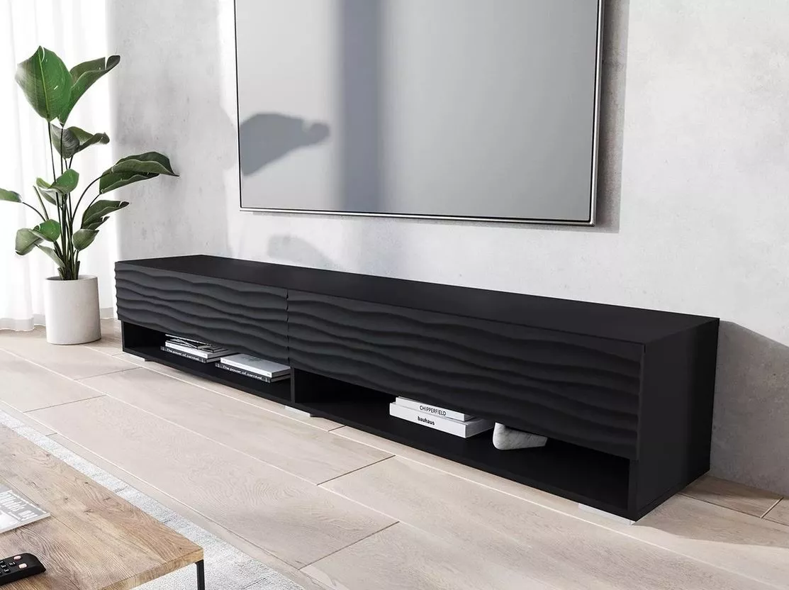 TV stolek WILLA A o šířce 180 cm je ideální volbou pro moderní obývací pokoj, kde spojí styl s praktičností. Frézování ve tvaru rybí kosti dodává interiéru eleganci, zatímco kombinace skříněk a otevřených polic nabízí dostatek prostoru pro TV příslušenství i dekorace. Díky své šířce poskytuje stabilní základnu pro televizi, a zároveň vytváří vkusný designový prvek.