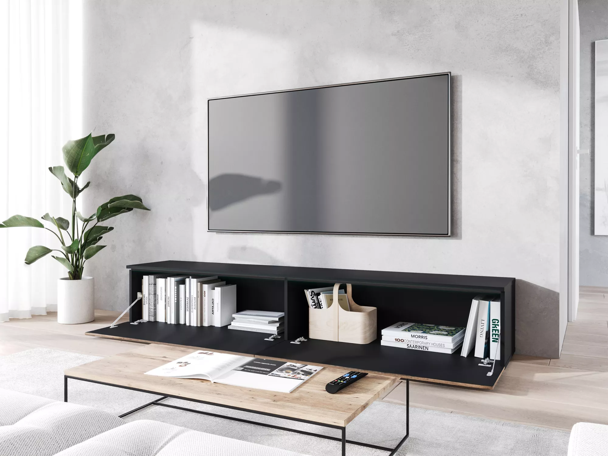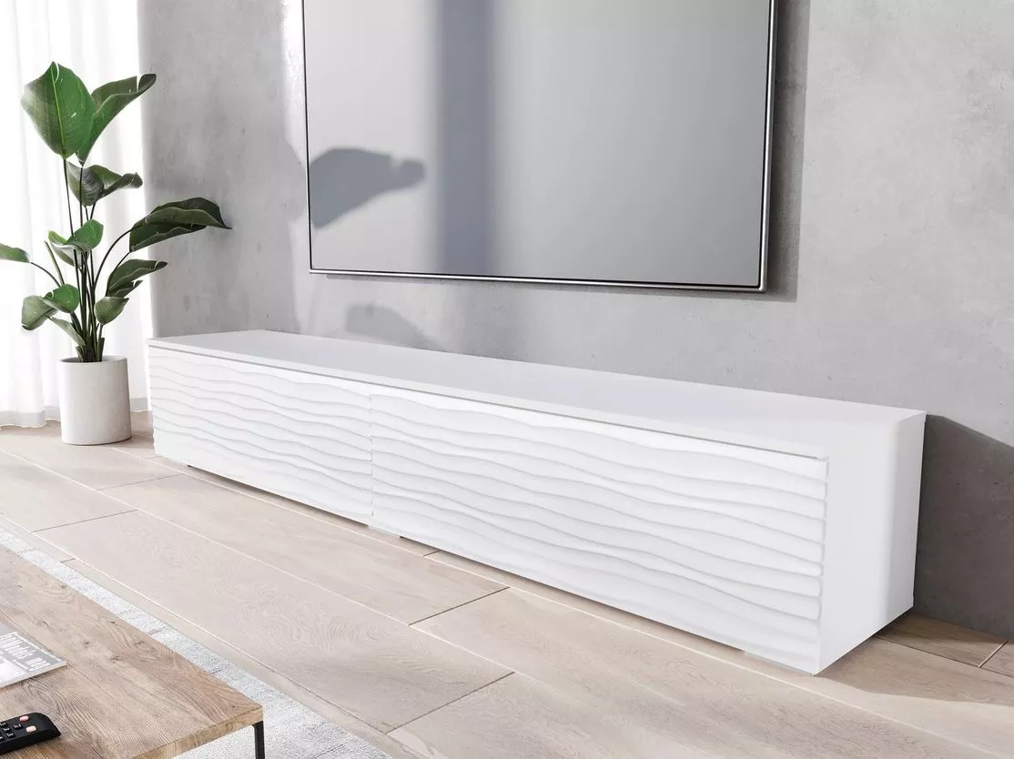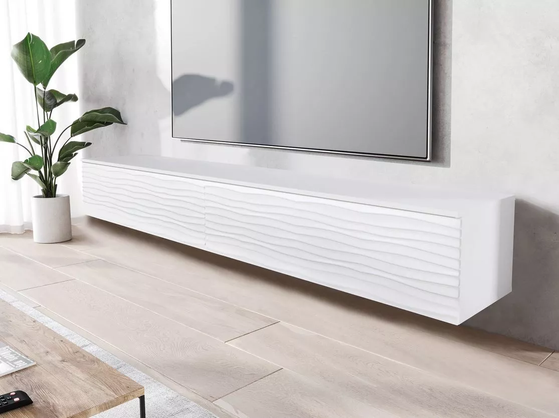 TV stolek WILLA D je stylovým prvkem moderního interiéru, který spojuje eleganci s praktičností. Frézovaná dvířka se vzorem rybí kosti odrážejí nejnovější trendy a dodávají prostoru sofistikovaný vzhled. Uvnitř nabízí 2 prostorné úložné přihrádky, které usnadňují organizaci TV příslušenství i dalších nezbytností. Stolek lze přizpůsobit vašim potřebám – můžete jej zavěsit na stěnu pro minimalistický efekt nebo jej postavit na nožičky a vytvořit stabilní základnu pro televizi i dekorace.