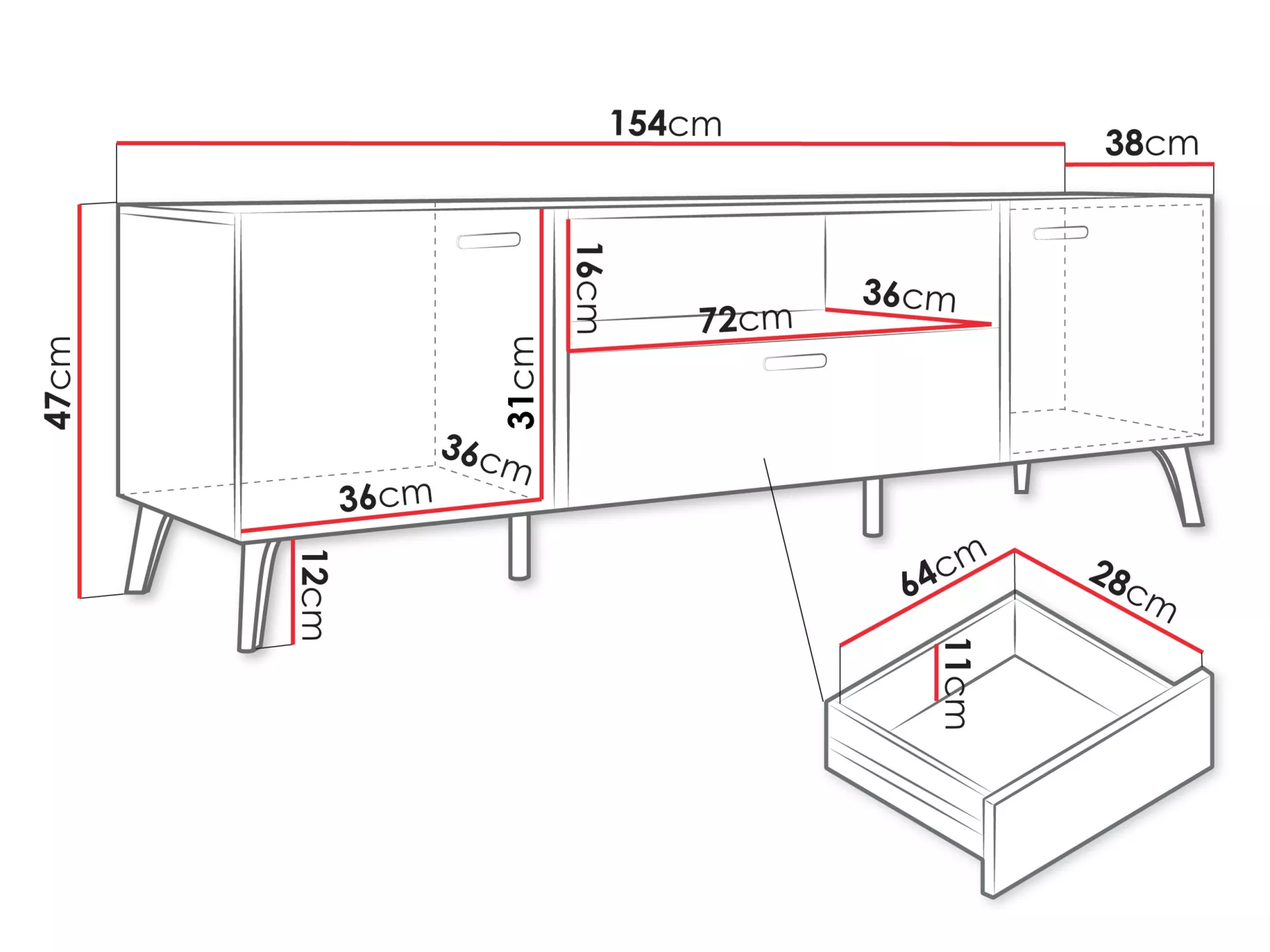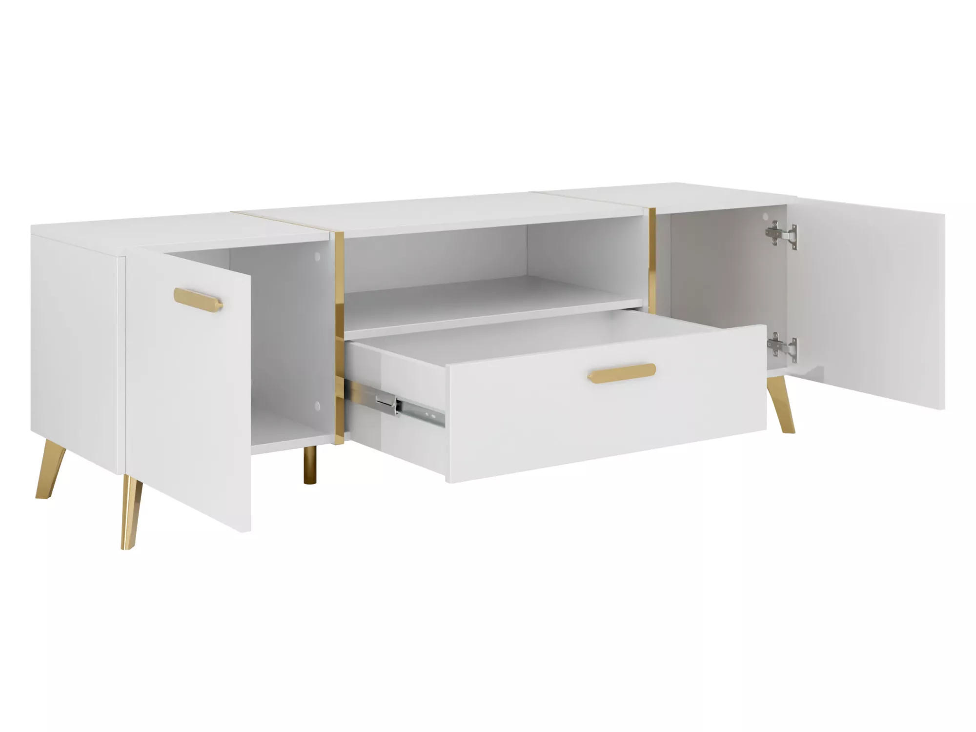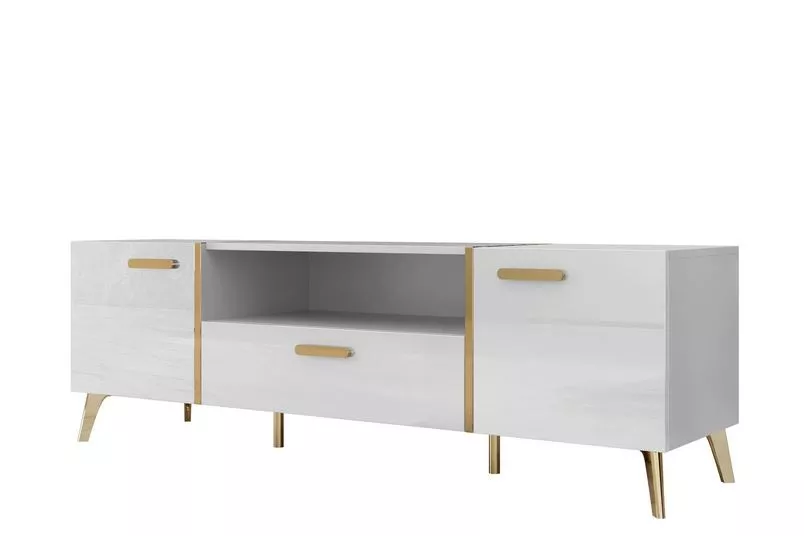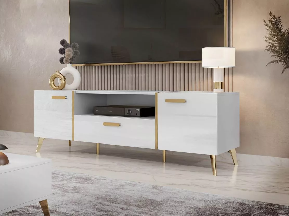 Dodejte svému interiéru nádech luxusu s televizním stolkem TANTES. Spojení lesklého povrchu a zlatých detailů vytváří dokonalý glamour styl. Stolek nabízí nejen prostor pro audiovizuální techniku či dekorace, ale také praktické úložné místo. Polička, šuplík a 2 uzavřené skříňky skryjí veškeré drobnosti a pomohou udržet pořádek v obývacím pokoji.
