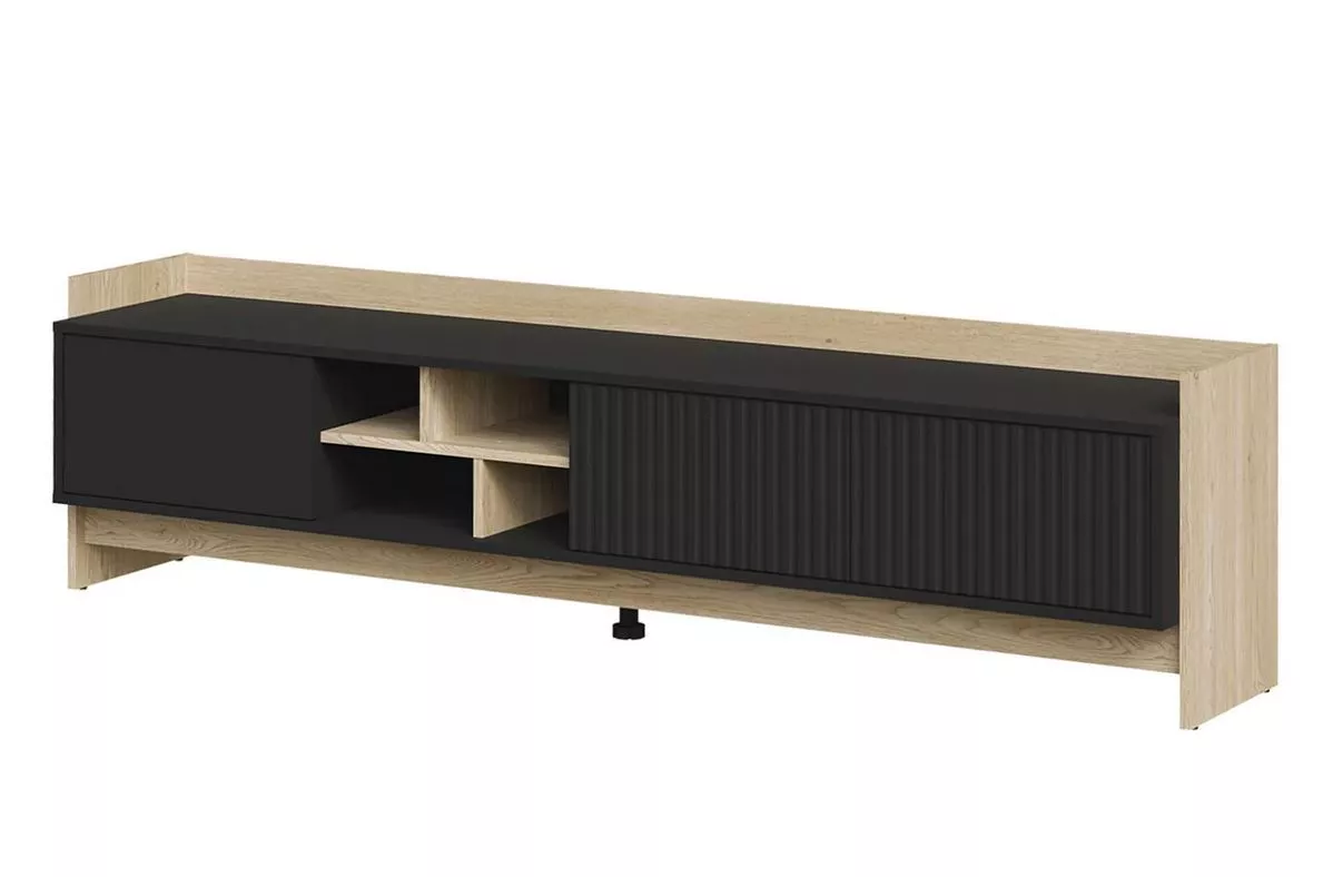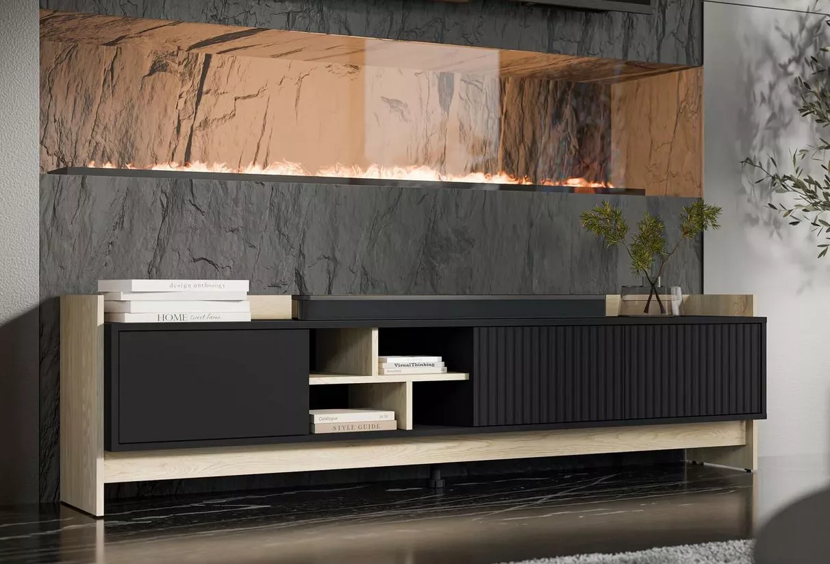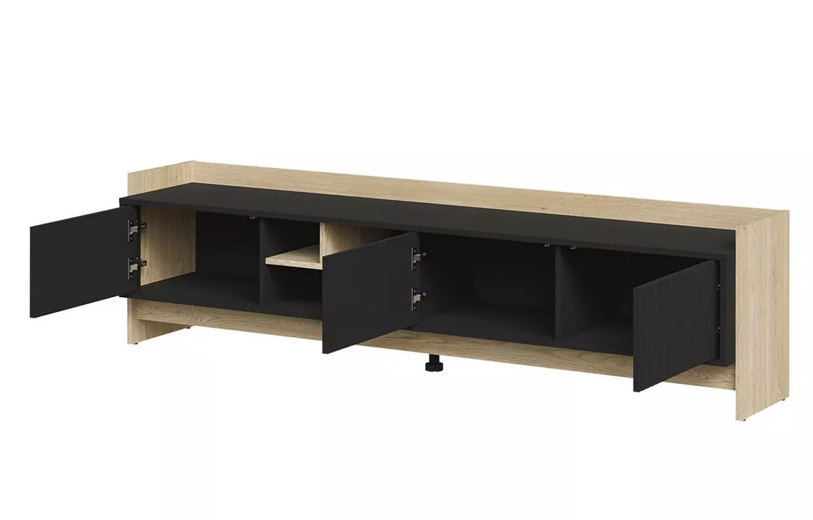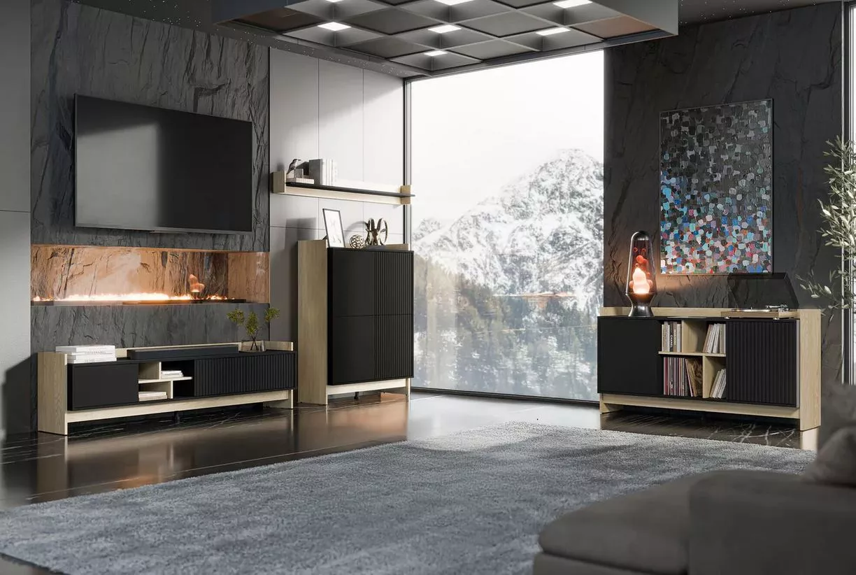 Elegantní TV stolek ILOFA je dokonalou kombinací moderního designu a funkčnosti. Kontrast matné černé s přírodním dekorem dodává interiéru sofistikovaný a nadčasový vzhled. Promyšlené úložné prostory umožňují snadné uspořádání elektroniky i dekorací, zatímco minimalistické provedení podtrhuje luxusní atmosféru místnosti. Ideální volba pro ty, kteří chtějí spojit praktičnost s estetickou dokonalostí!