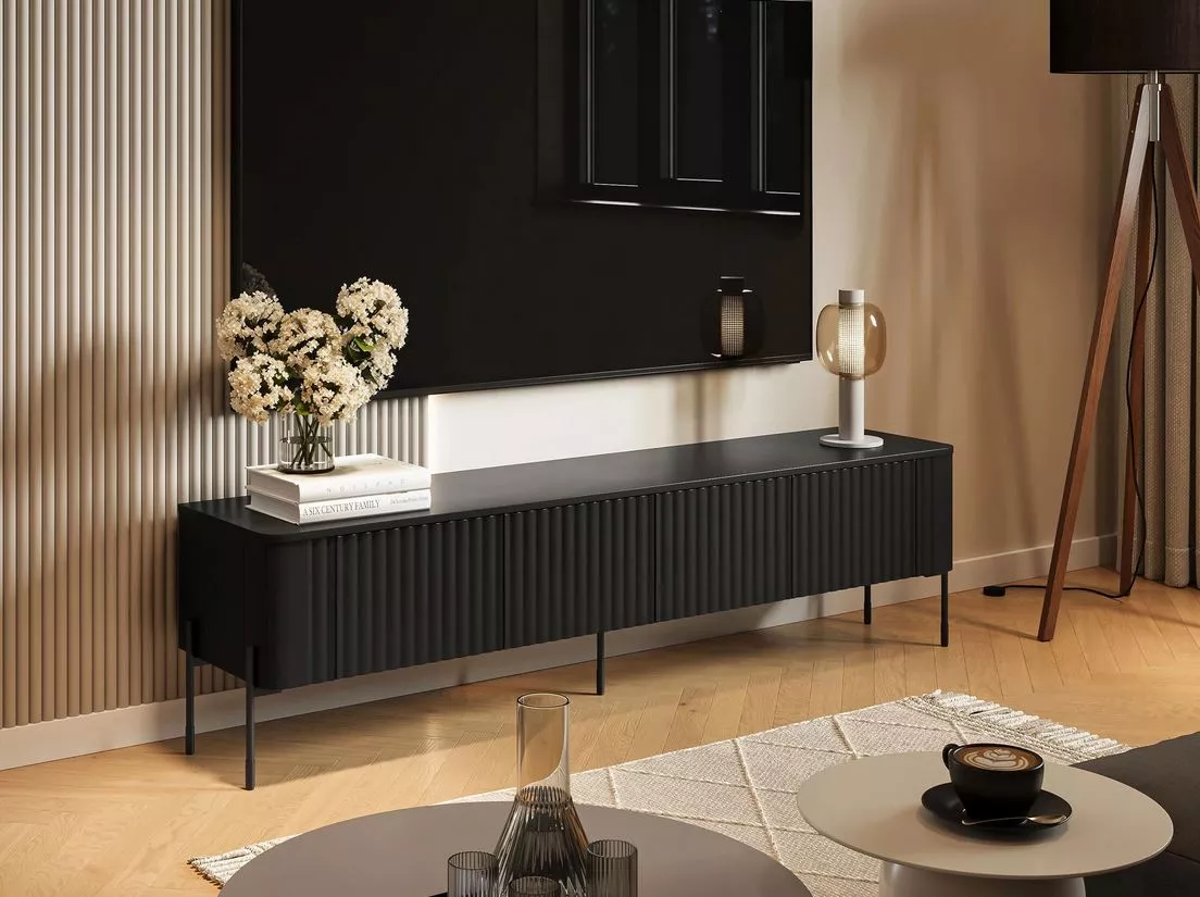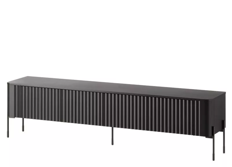 Vneste do interiéru styl s širokým TV stolkem CALERA, který je perfektní volbou pro vytvoření zajímavého uspořádání obývacího pokoje. Dvířka s vertikálním frézováním dodávají nábytku výrazný charakter, zatímco bezúchytkový systém PUSH TO OPEN umožňuje pohodlné otevření jedním dotykem. Ideální řešení pro loftové i moderní interiéry.