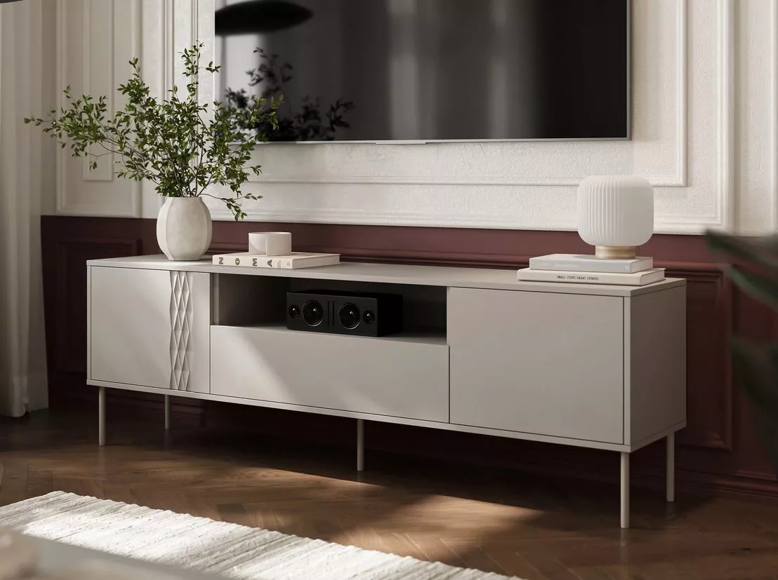 Zažeňte nudu ve svém obývacím pokoji a vybavte ho moderním širokým televizním stolkem HARTSELE, který vnese do prostoru originalitu a styl. Jedinečný vzhled s 3D frézováním na dvířkách skvěle ladí s minimalistickým designem a perfektně doplňuje moderní televizory. Stolek se 3 přihrádkami nabízí dostatek prostoru pro elektroniku, herní příslušenství i další nezbytnosti.