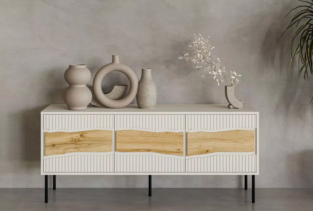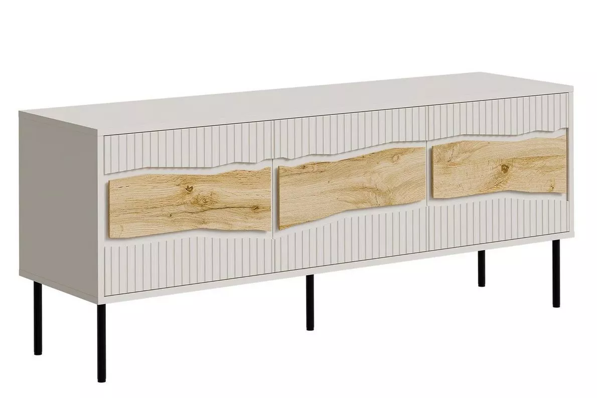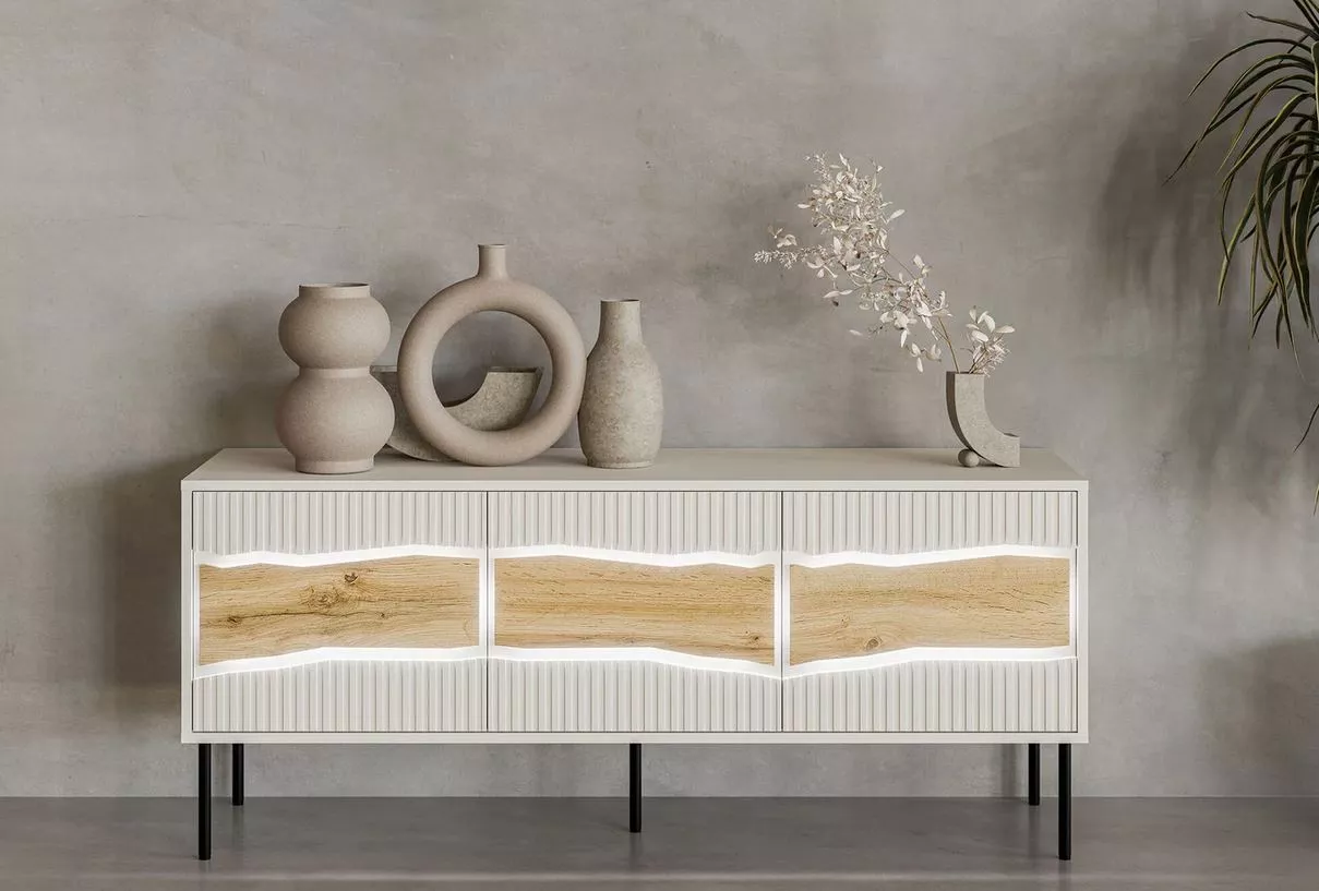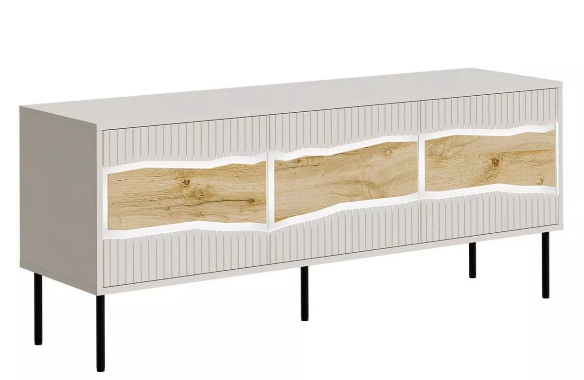 Televizní stolek CLANTON je moderním ztělesněním designového trendu. Stolek s jemným frézováním na dvířkách a deskou v dekoru dubu wotan podsvícenou LED osvětlením vytváří fascinující kontrast. Uzavřené skříňky pojmou všechno multimediální zařízení a pomohou vám udržet prostor uklizený.