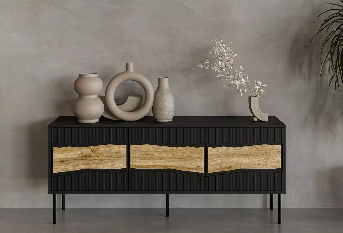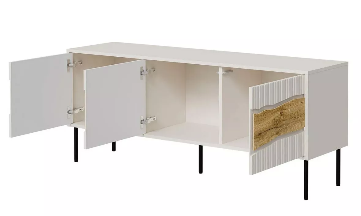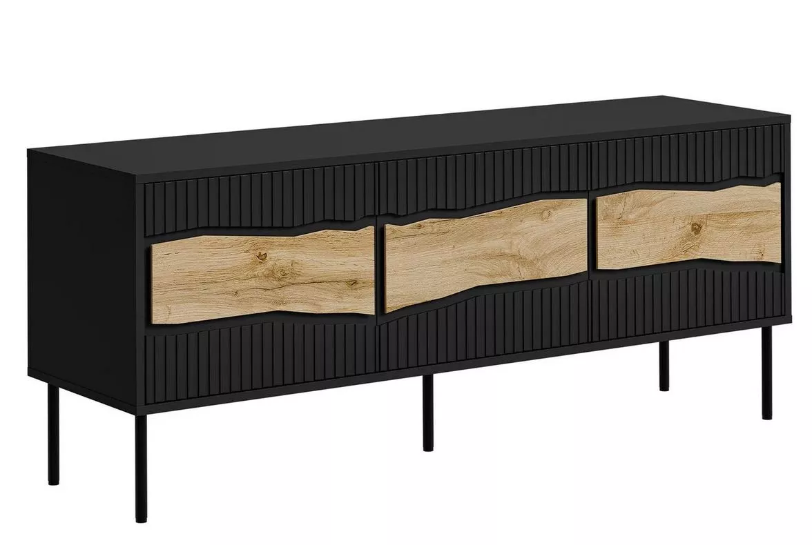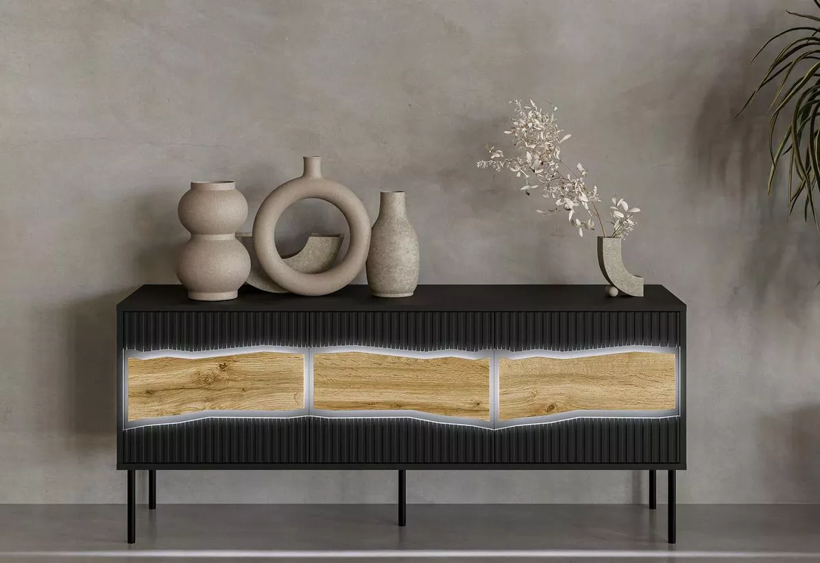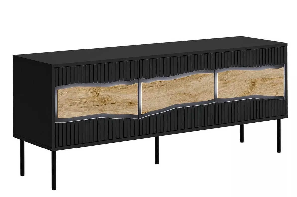 Televizní stolek CLANTON je moderním ztělesněním designového trendu. Stolek s jemným frézováním na dvířkách a deskou v dekoru dubu wotan podsvícenou LED osvětlením vytváří fascinující kontrast. Uzavřené skříňky pojmou všechno multimediální zařízení a pomohou vám udržet prostor uklizený.