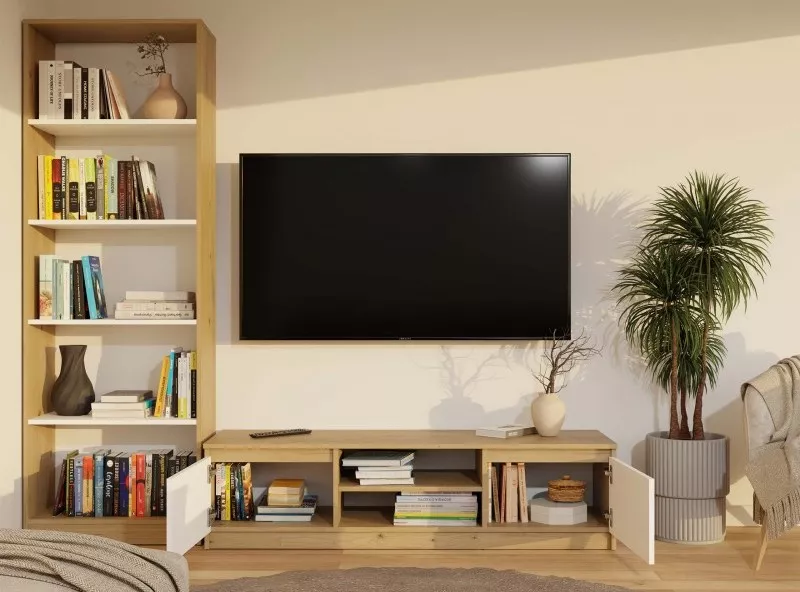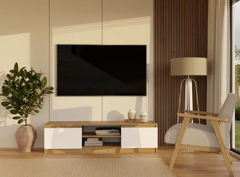 Televizní stolek SABA 2 splní očekávání všech, kteří oceňují spojení jednoduchosti a elegance. Otevřené přihrádky a 2 skříňky poskytují dostatek místa pro uložení TV příslušenství. Stolek disponuje také otvorem pro vývod kabelů.