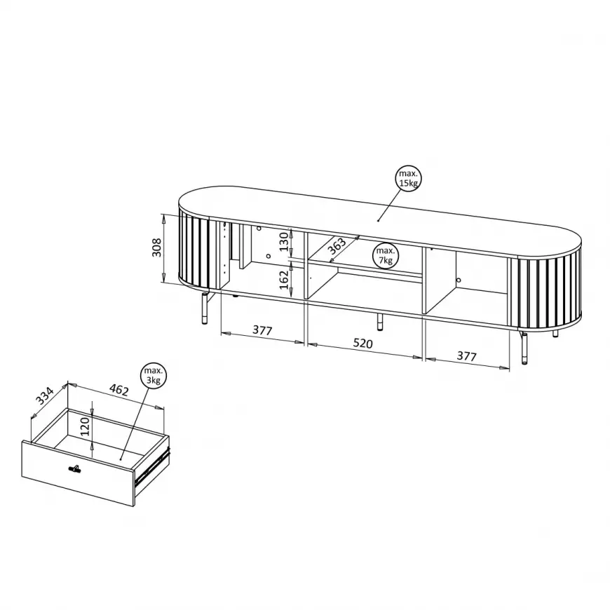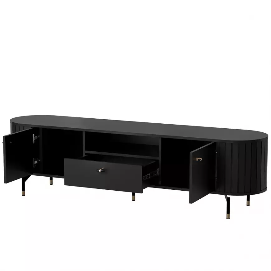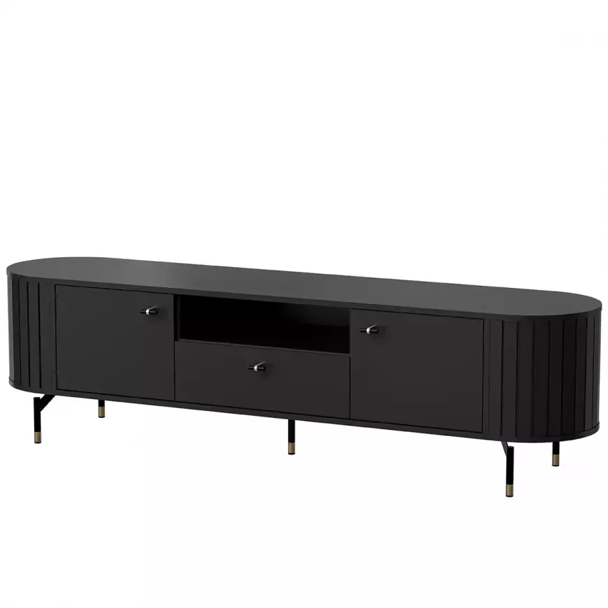 Široký televizní stolek APEX vyniká svými lamelovými detaily a designovými nožkami. Stolek nabízí dostatek úložného prostoru pro uložení veškerého televizního příslušenství.