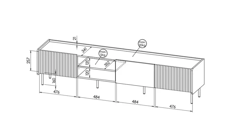 Televizní stolek ASHEBORO je charakteristický svými drážkovanými čely dvířek a designovou horní deskou s dekorem mramoru. Stolek nabízí dostatek úložného prostoru pro uložení veškerého televizního příslušenství.