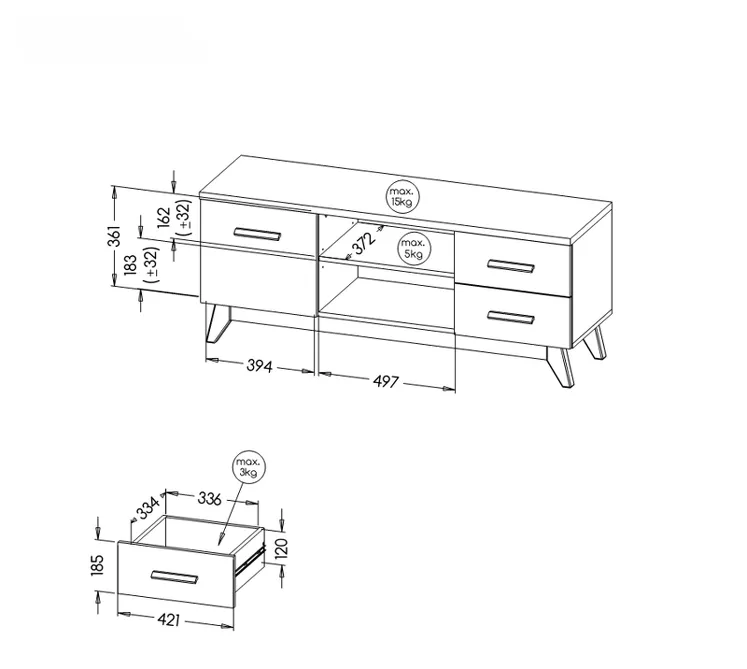 Televizní stolek BUTNER je stylový a praktický kousek do obýváku. 2 šuplíky, skříňka a otevřené police nabídnou dostatek místa pro TV příslušenství i dekorace. Stolek skvěle zapadne do skandinávského interiéru.