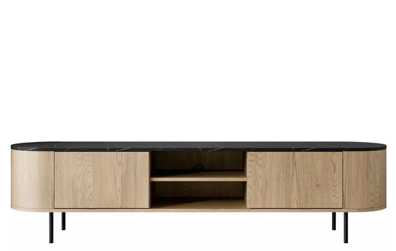 Široký TV stolek TANGIER přináší do interiéru neotřelý design díky zaobleným stranám, které narušují klasickou symetrii. Horní deska s výrazným mramorovým vzorem dodává stolku rafinovaný charakter a slouží jako výrazný, ale decentní dekorativní prvek. Úložný systém se skříňkami a otevřenými policemi poskytuje praktické uspořádání pro multimediální zařízení, zatímco vysoké minimalistické nohy usnadňují úklid pod stolem.