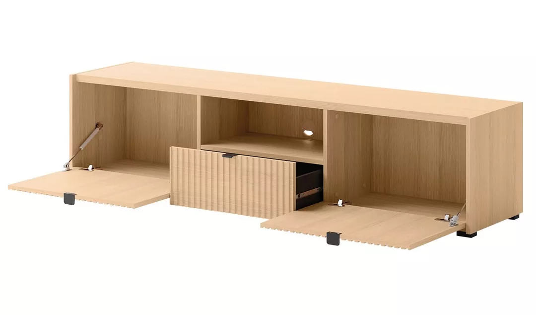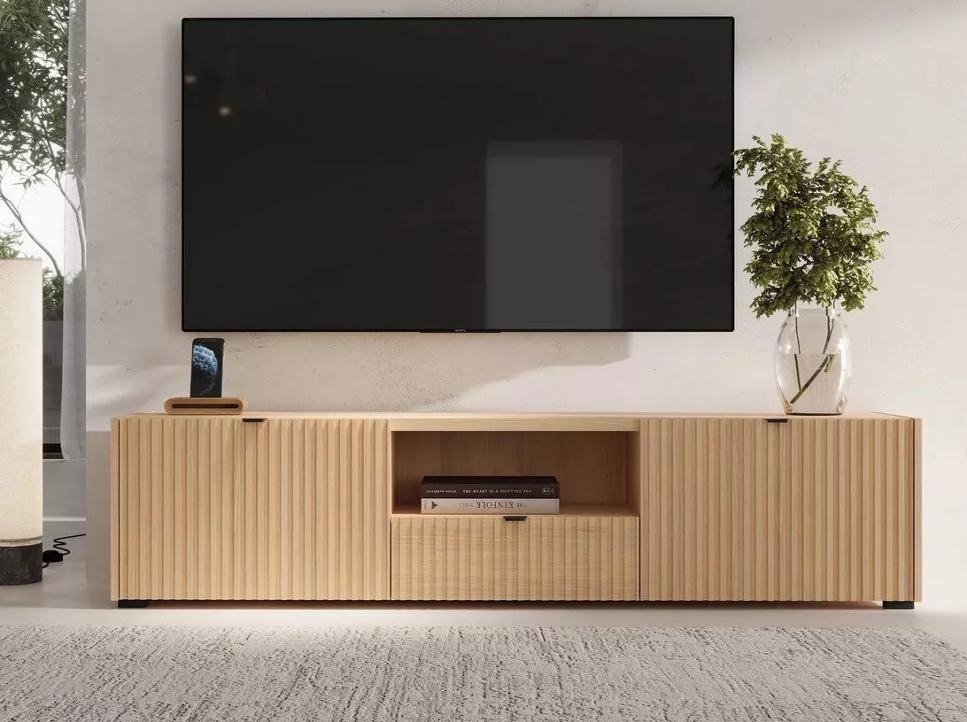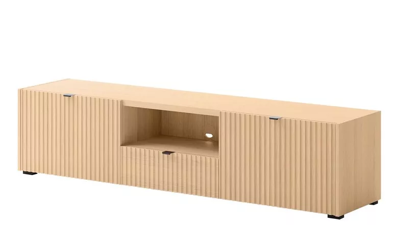 Televizní široký stolek TROUTDALE skvěle doplní minimalistické i přírodou inspirované interiéry. Prostorné uzamykatelné boční skříňky, centrální police a praktická zásuvka poskytují dostatek úložného prostoru. Vertikální frézování a světlý dekor dodávají stolku osobitý charakter a teplý, příjemný nádech do moderního interiéru.
