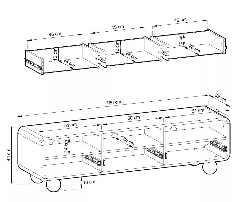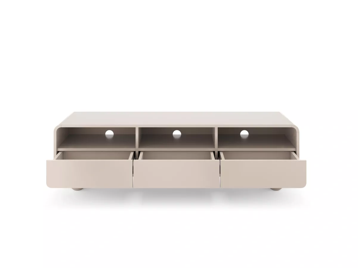 Televizní stolek DARIO na první pohled zaujme svými designovými nožkami ve tvaru koule. Stolek disponuje 3 šuplíky pro uložení veškerého televizního příslušenství a 3 otvory pro vývod kabelů. Systém otevírání push to open zpříjemní každodenní používání.