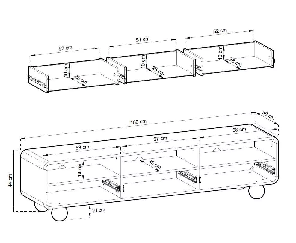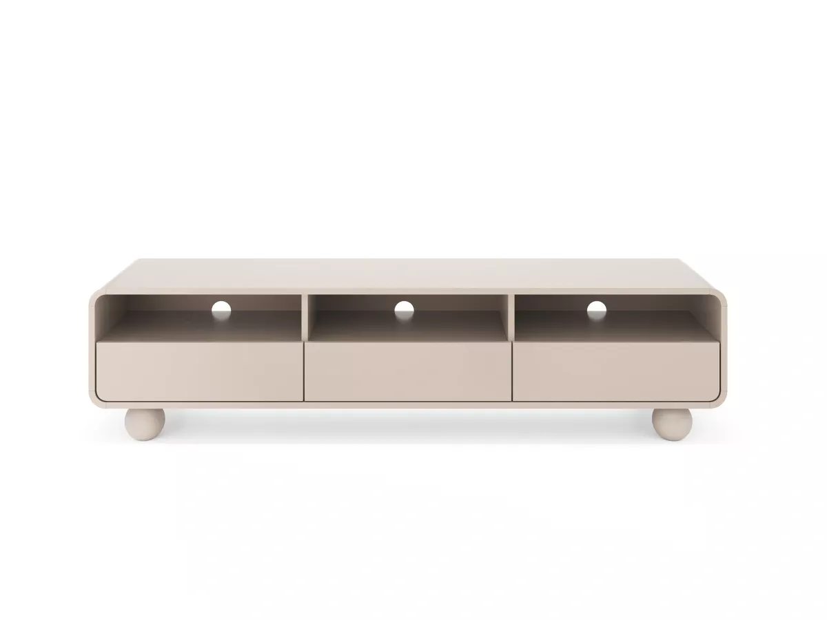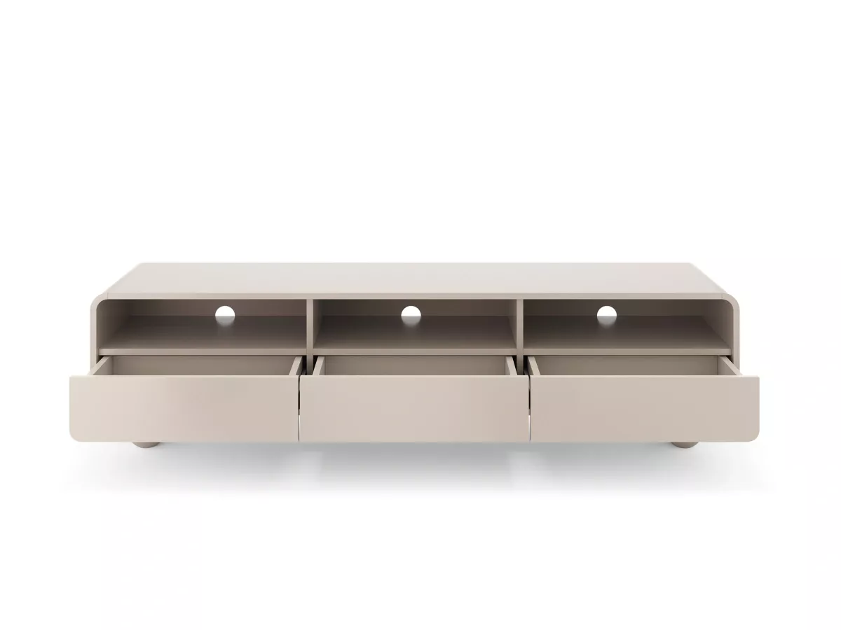 TV stolek DARIO na první pohled zaujme svými designovými nožkami ve tvaru koule. Stolek disponuje 3 šuplíky pro uložení veškerého televizního příslušenství a 3 otvory pro vývod kabelů. Systém otevírání push to open zpříjemní každodenní používání.