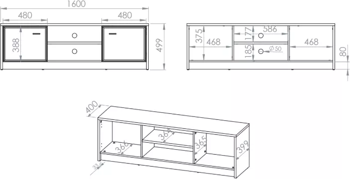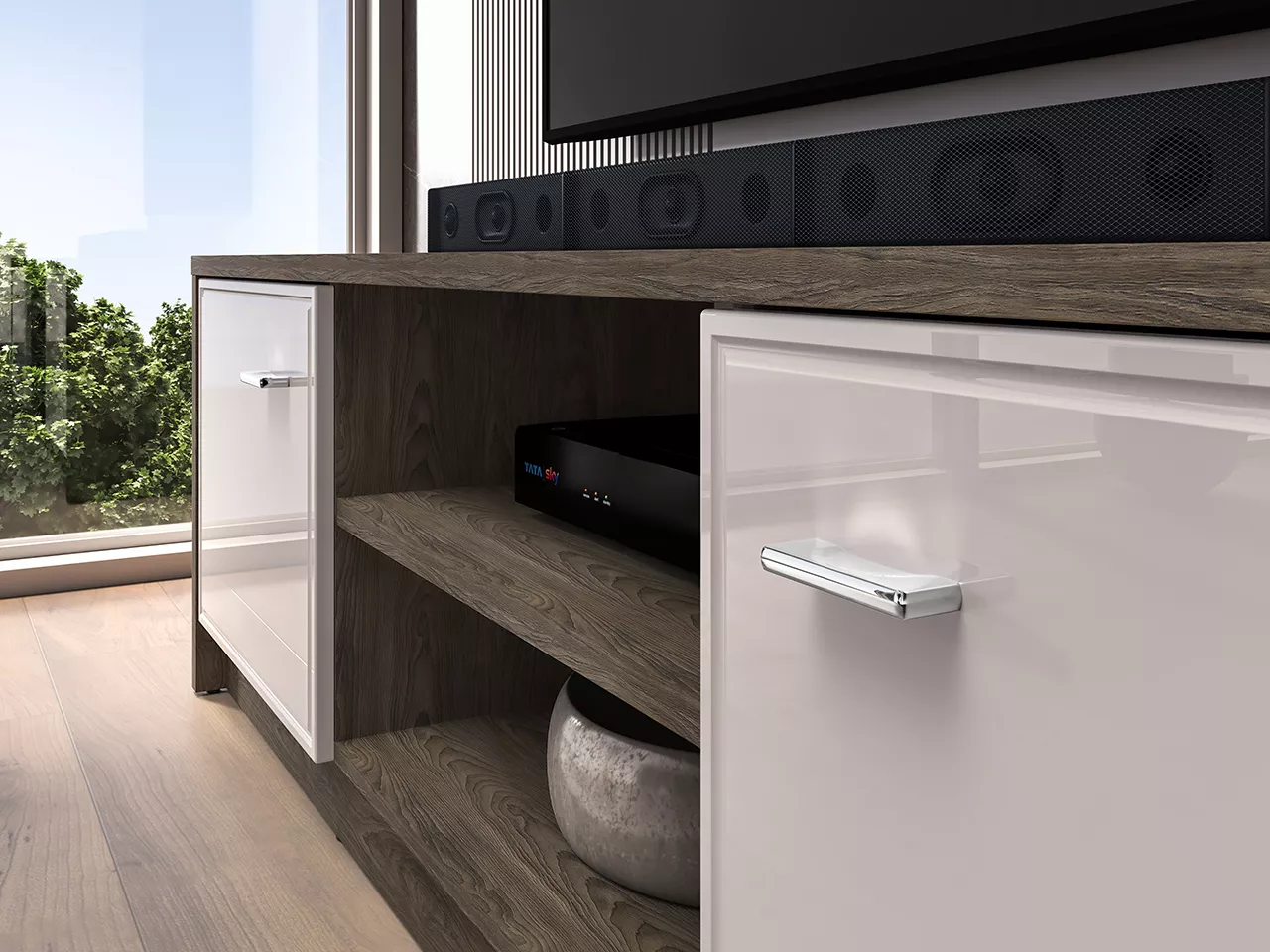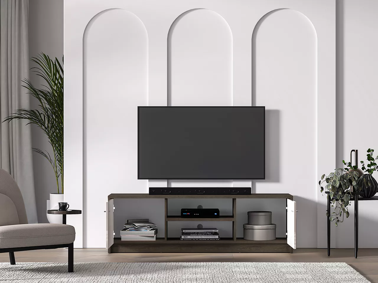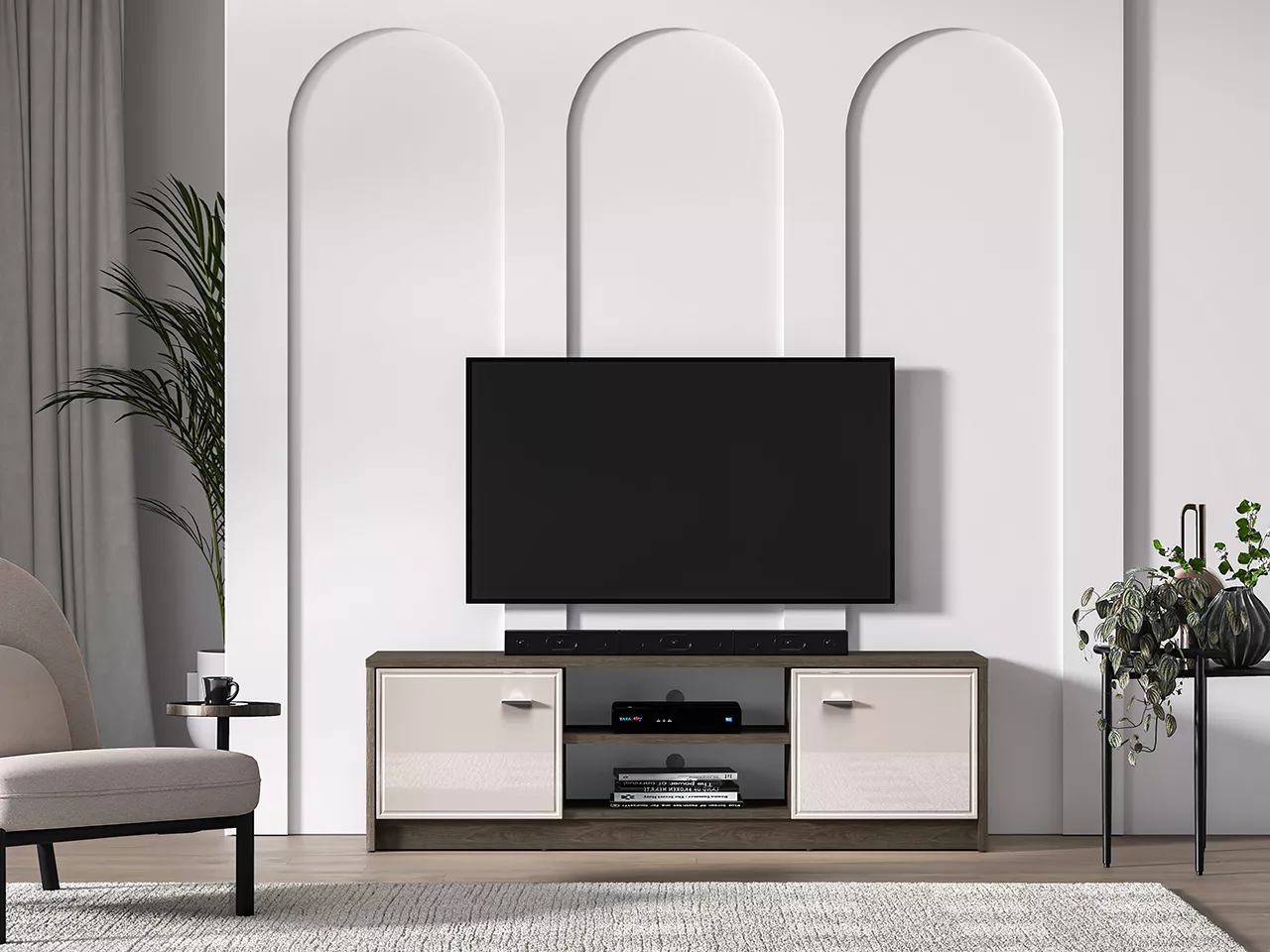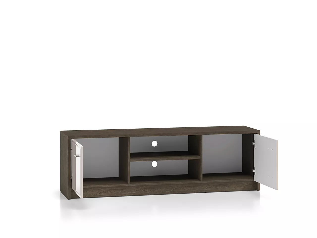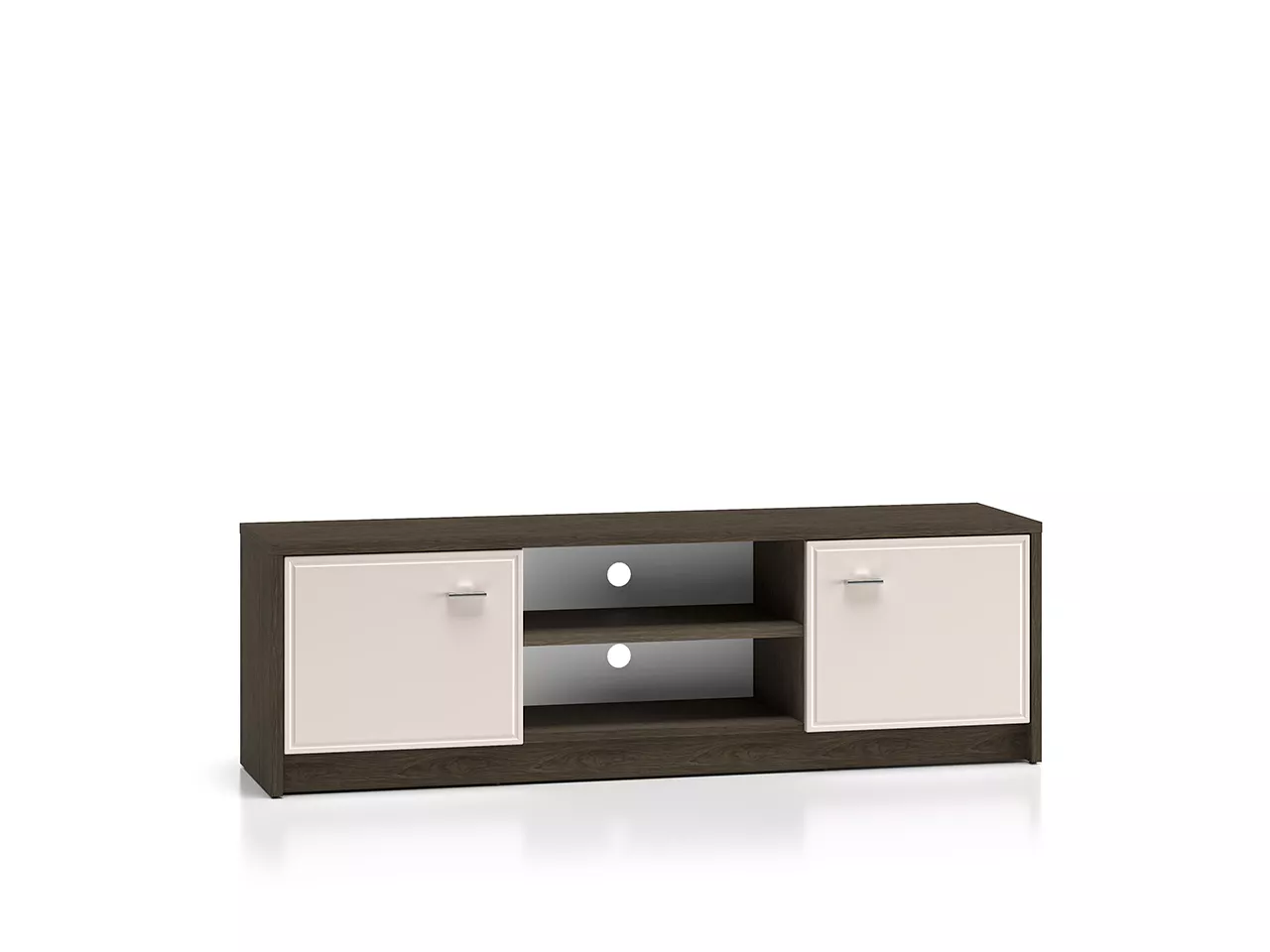 Televizní stolek SAFIEH je stylovým i praktickým kouskem nábytku do každého obývacího pokoje. Stolek nabízí 2 uzavřené skříňky a 2 otevřené přihrádky pro uložení veškerého televizního příslušenství. Systém tichého dovírání zpříjemní každodenní používání.