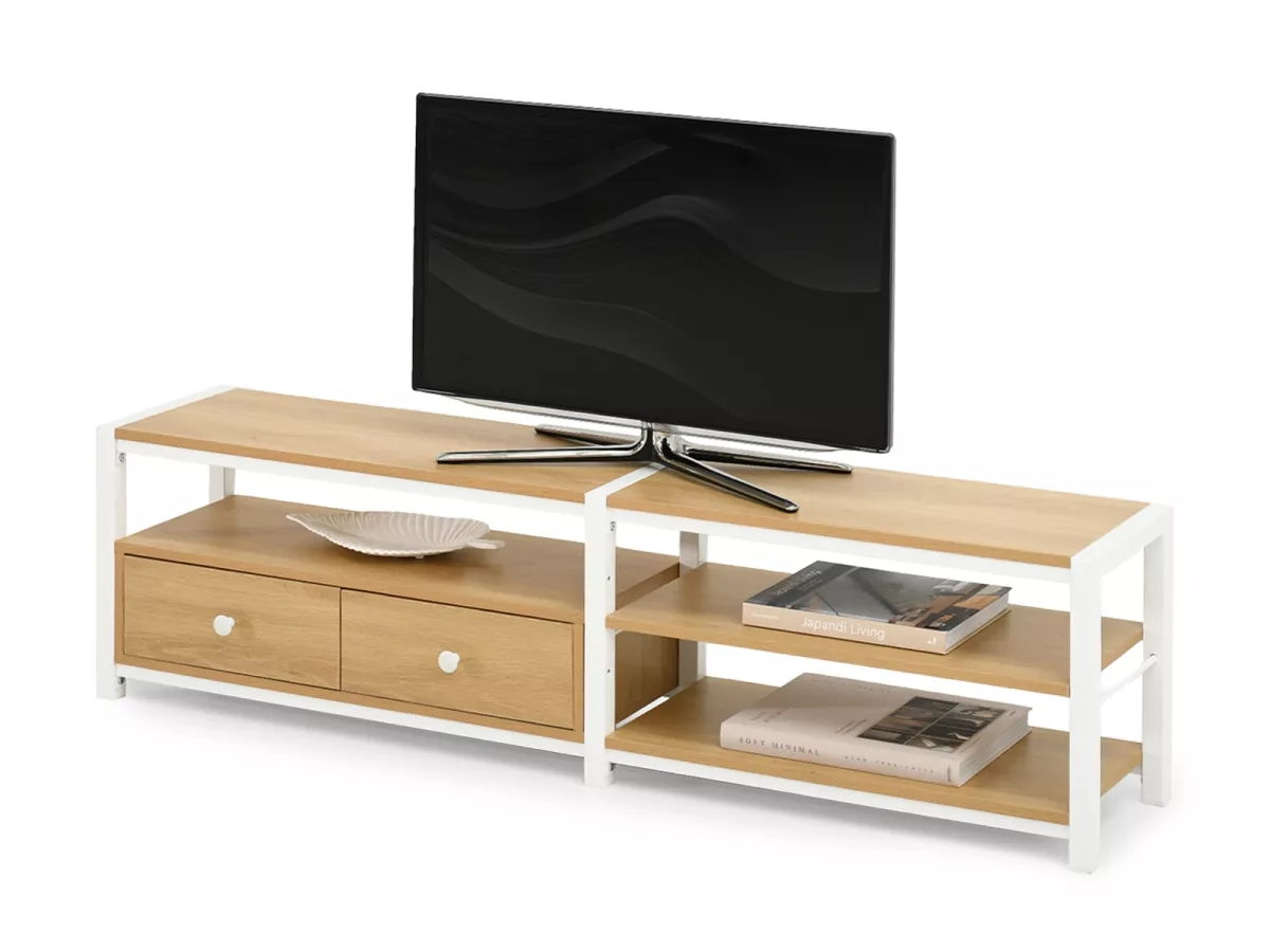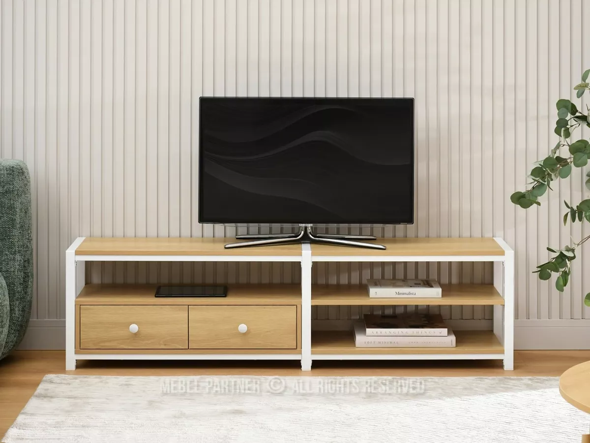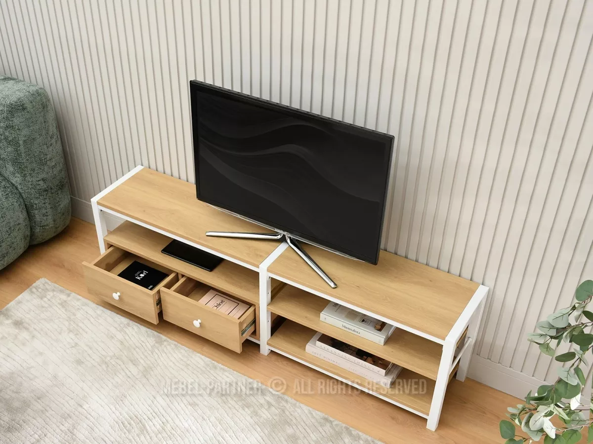 Televizní stolek ROMER bude dokonalým doplňkem vašeho obývacího pokoje nebo ložnice. Stolek nabízí spoustu úložného prostoru v podobě 2 šuplíků a 3 otevřených polic.