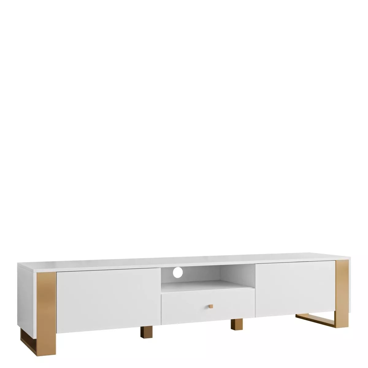 Obklopte se elegancí s TV stolkem LUMOS, který spojuje moderní styl se skvělou praktičností. Prostorná horní deska nabídne místo pro dekorace, otevřená police je ideální pro set-top box a 2 skříňky ukryjí vše potřebné. Světlé provedení se zlatými nohami dodá interiéru svěží a luxusní nádech.
