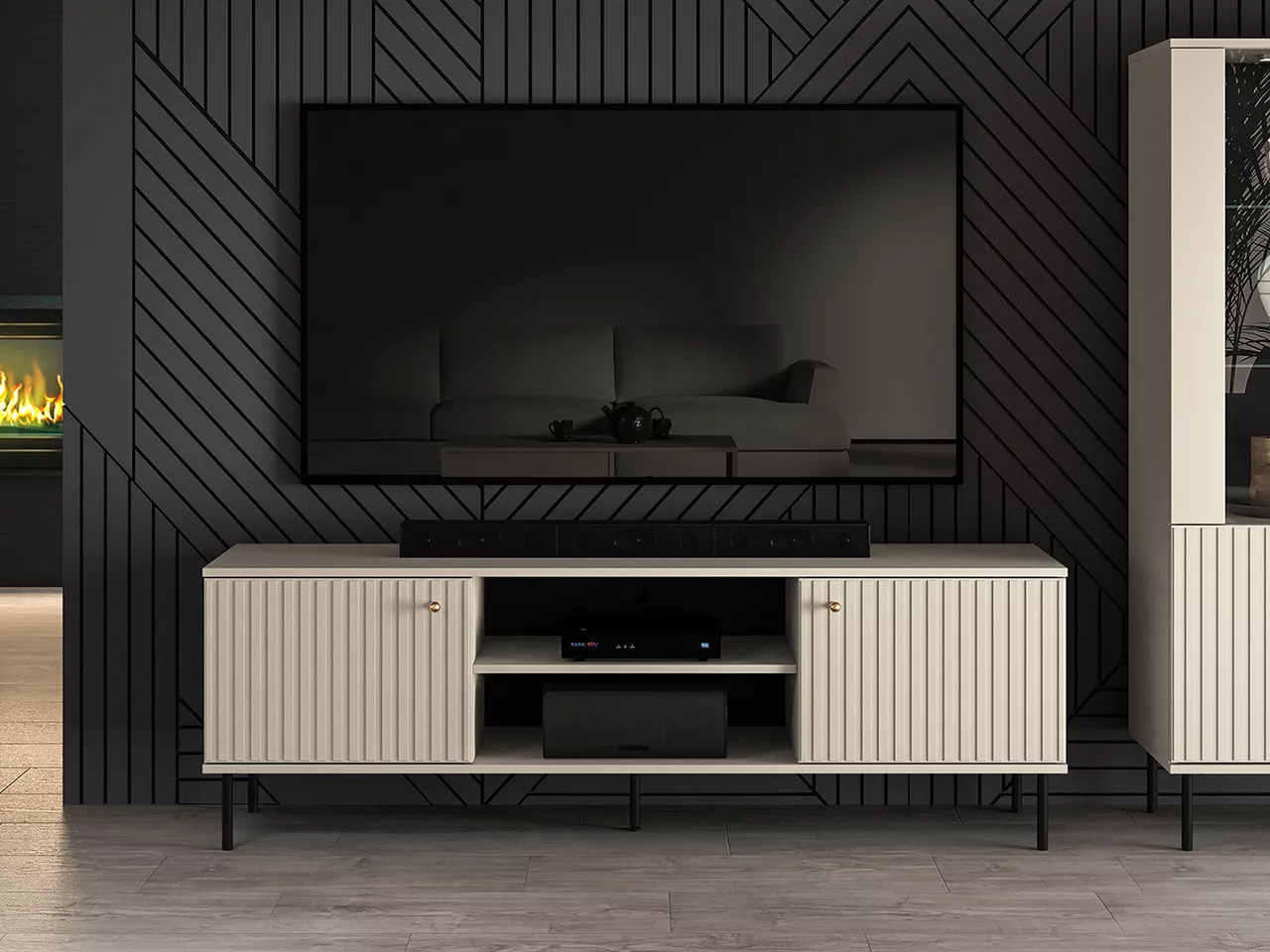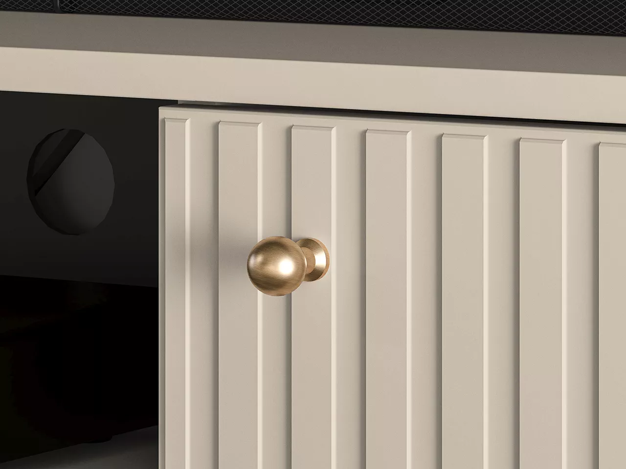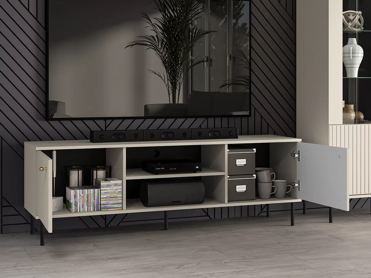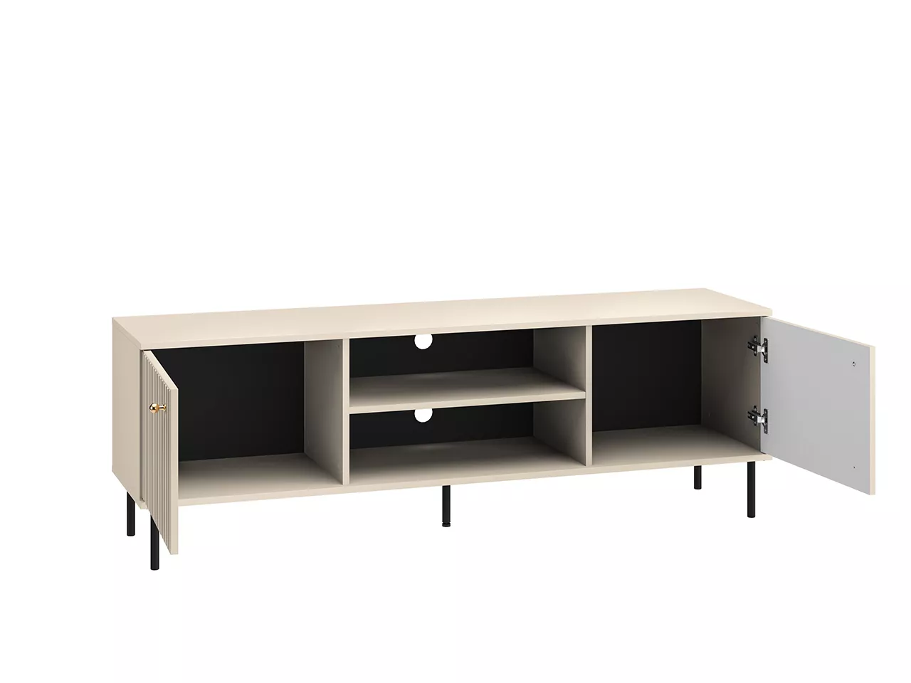 TV stolek FAREL skvěle zapadne do každého moderního interiéru. Otevřené police a boční skříňky poskytují pohodlné uložení TV příslušenství, otvor v zadní části usnadňuje diskrétní instalaci kabelů.